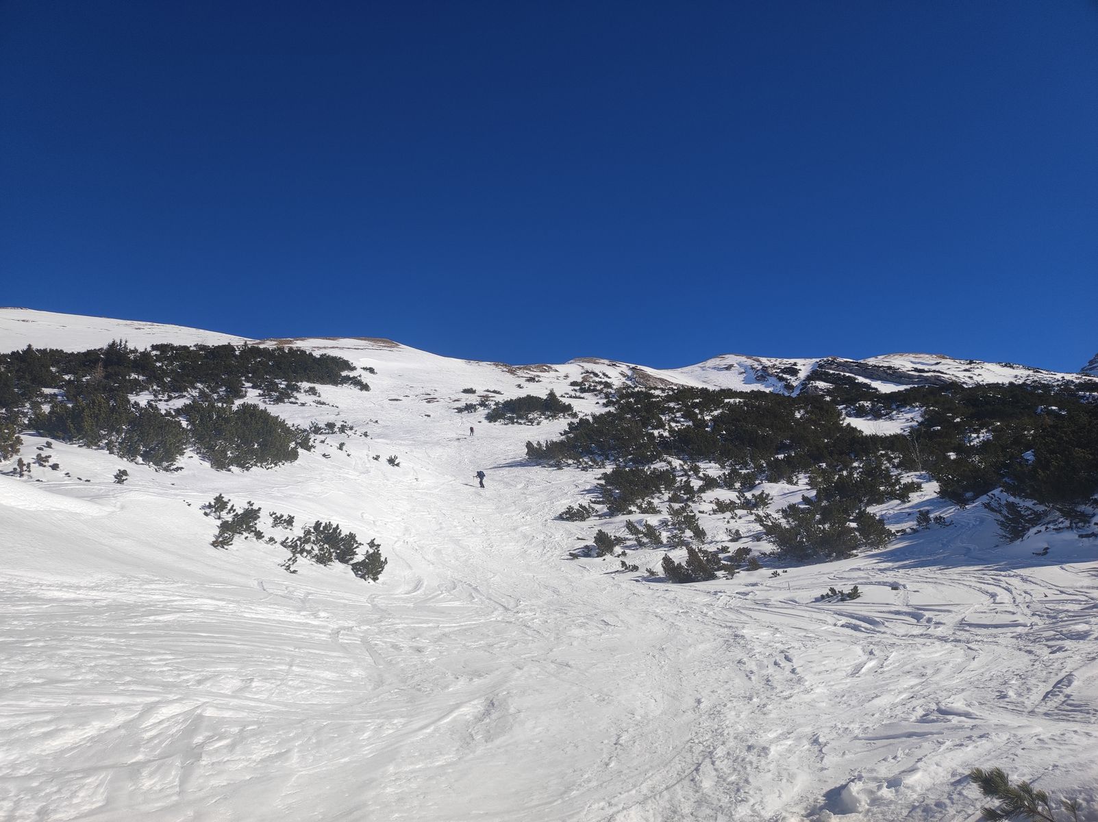 Zum Abschluss haben wir vom H-Joch aus die Westflanke des Kloben gequert, um zu den Einfahrten in die steilen nordseitigen Rinnen des Klobenjochs zu kommen. Grundsätzlich gibt es hier viele skibare Rinnen (das sieht man vom Mittelleger der Kotalm aus), doch zurzeit ist nur eine (, die den Nordwänden des Klobensteins nächste,) sinnvoll, das heißt ohne Latschenkampf, zu erreichen. Die anderen Rinnen setzen tiefer an und der Zustieg zu ihnen ist latschenbewaffnet...