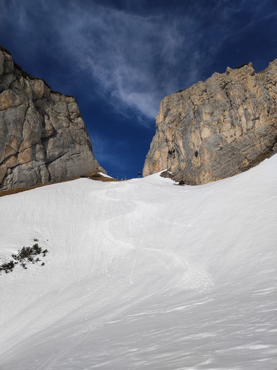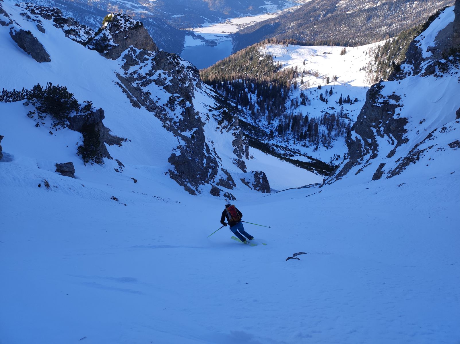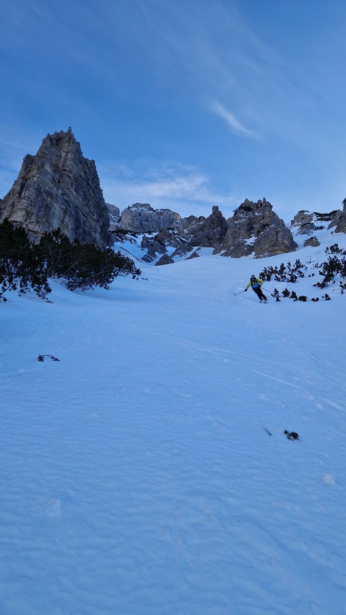 Die Abfahrt selbst war einfach genial: Steil (40 Grad+), eng, Pulver und ein bisserl Dolomiten-Feeling!