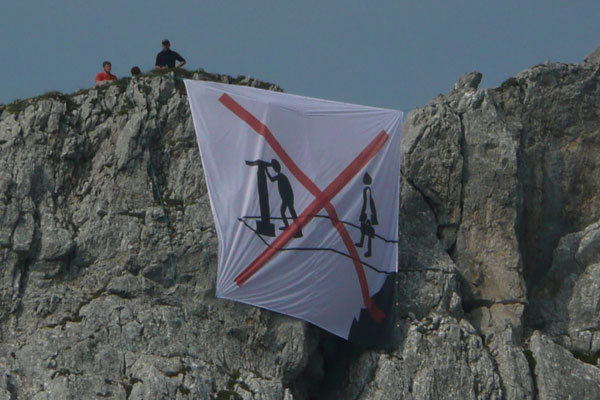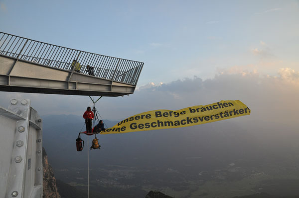 Zeitgleich zur Eröffnungsfeier entrollten Aktivisten von Mountain Wilderness ein riesiges Banner am gegenüberliegenden Höllentorkopf, das mit einem Piktogramm die Botschaft “Aussichtsplattform – nein danke“ übermittelte.