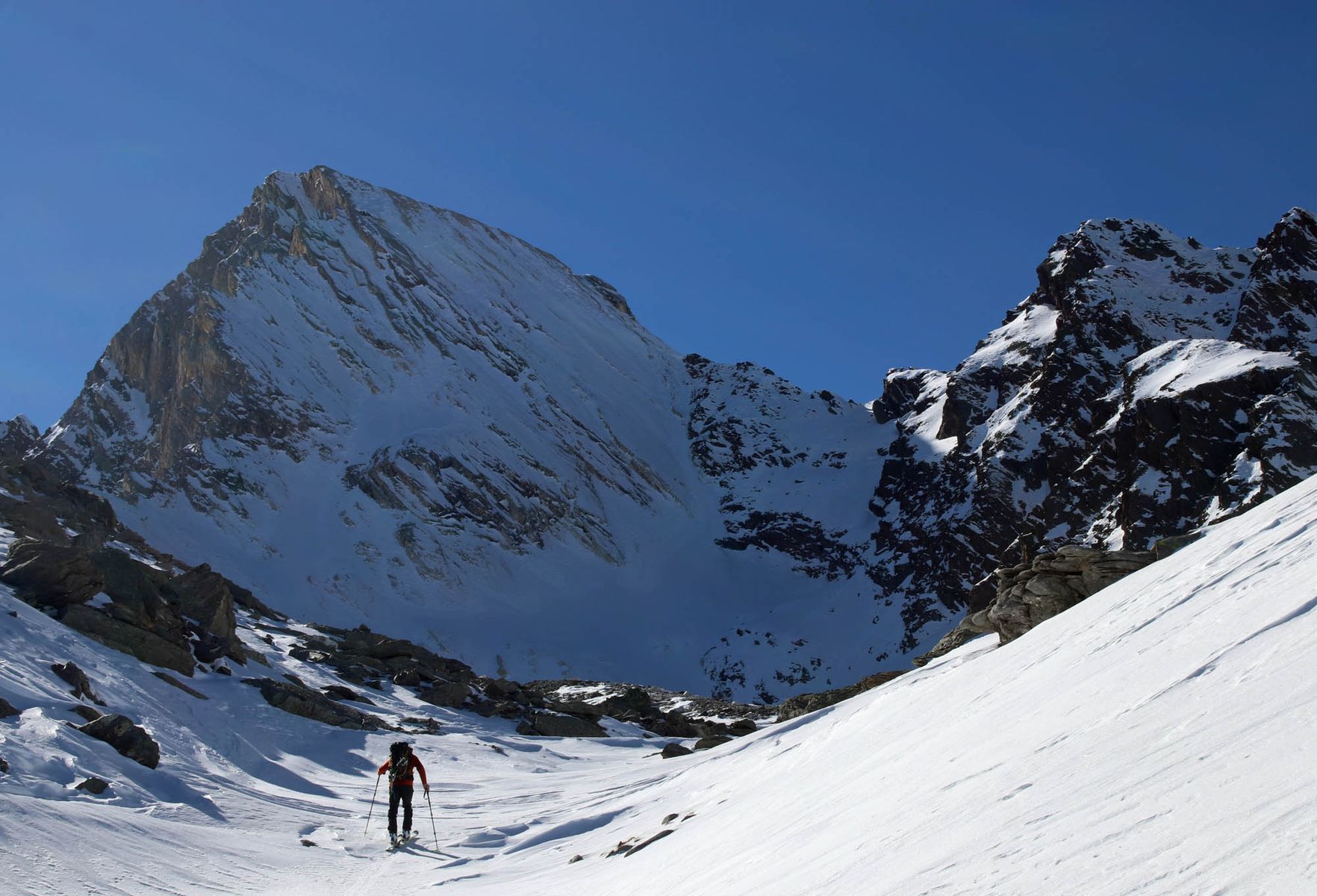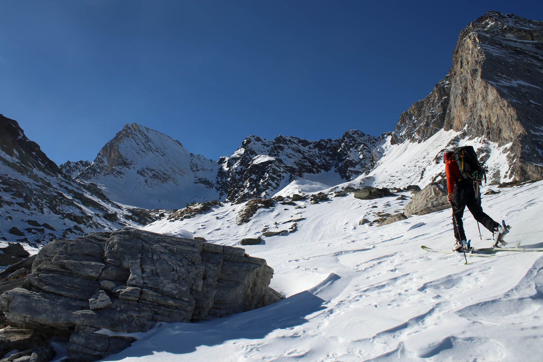 Schon beim Aufstieg von Pfelders aus waren immer wieder deutliche Setzungsgeräusche beim Belasten der extrem inhomogenen (und insgesamt sehr geringmächtigen) Schneedecke zu hören. Nach dem sehr langen Zustieg zum riesigen und bis zu 40° steilen Gipfelhang entschieden wir uns an dessen Fuß zur Umkehr. Denn die Skistöcke stießen durch die gesetzte Schneeauflage immer wieder in ein bodenloses Fundament durch. Vorsicht vor Felsen war zudem bei der Abfahrt angesagt.