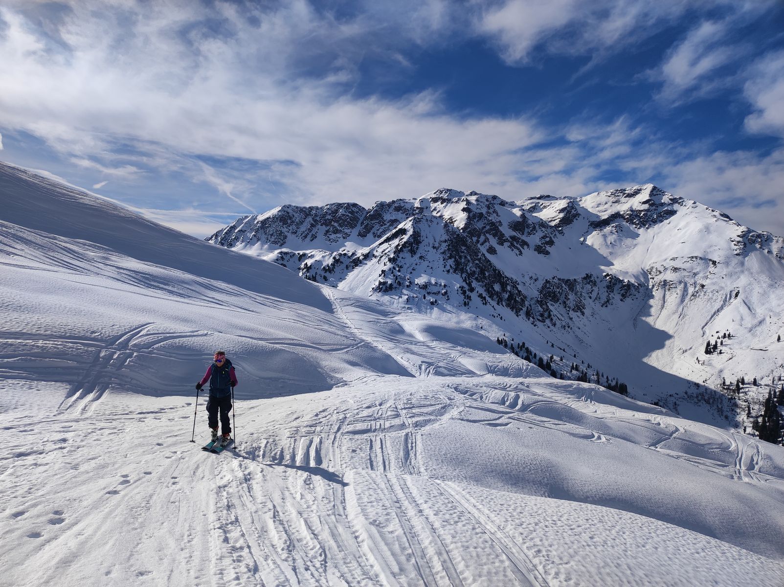 Nun wurde wieder aufgefellt und es ging über Stadelkehr- und Feldalm auf den Lämpersberg. Am westexponierten Kamm wird es schon dünn mit Schnee, aber noch geht es ohne Abschnaller. Für die Abfahrt wählte ich den Südhang quasi direkt vom Gipfel gerade hinunter - überwiegend guter Firn, aber um 12:45 Uhr schon etwas tief. Diese steile Abfahrtsvariante (40 Grad) wird vermutlich wegen der Lawinengefahr nicht allzu oft befahren - heute aber vertretbar in meinen Augen. Claudia musste dann wegen einer Familienfeier schon ins Tal und so bin ich noch allein auf den Seekopf, den Nachbargipfel des Kleinen Beil. Abfahrt um 14 Uhr nordwestseitig direkt von Gipfel oben hart und unten brauchbarer Firn.