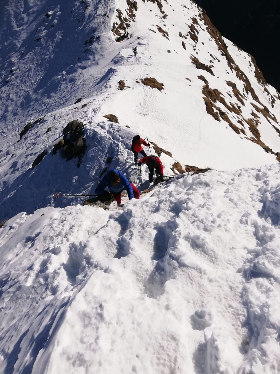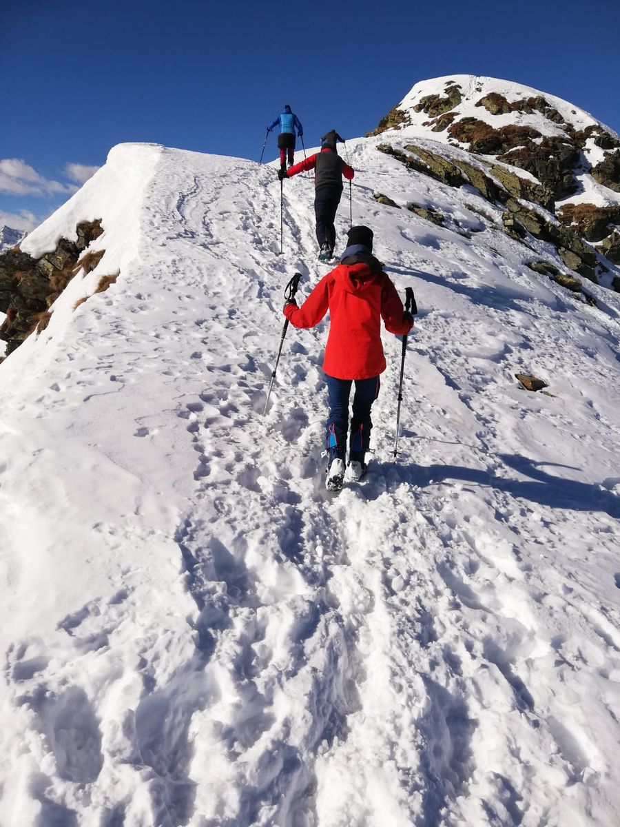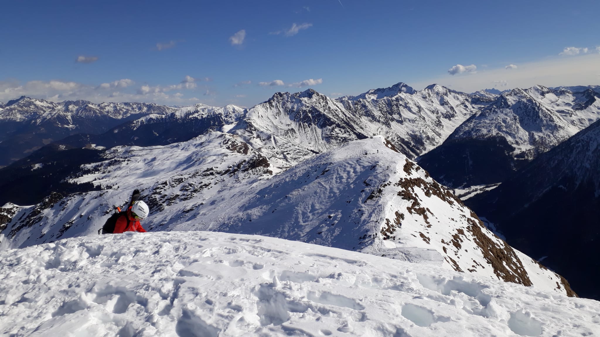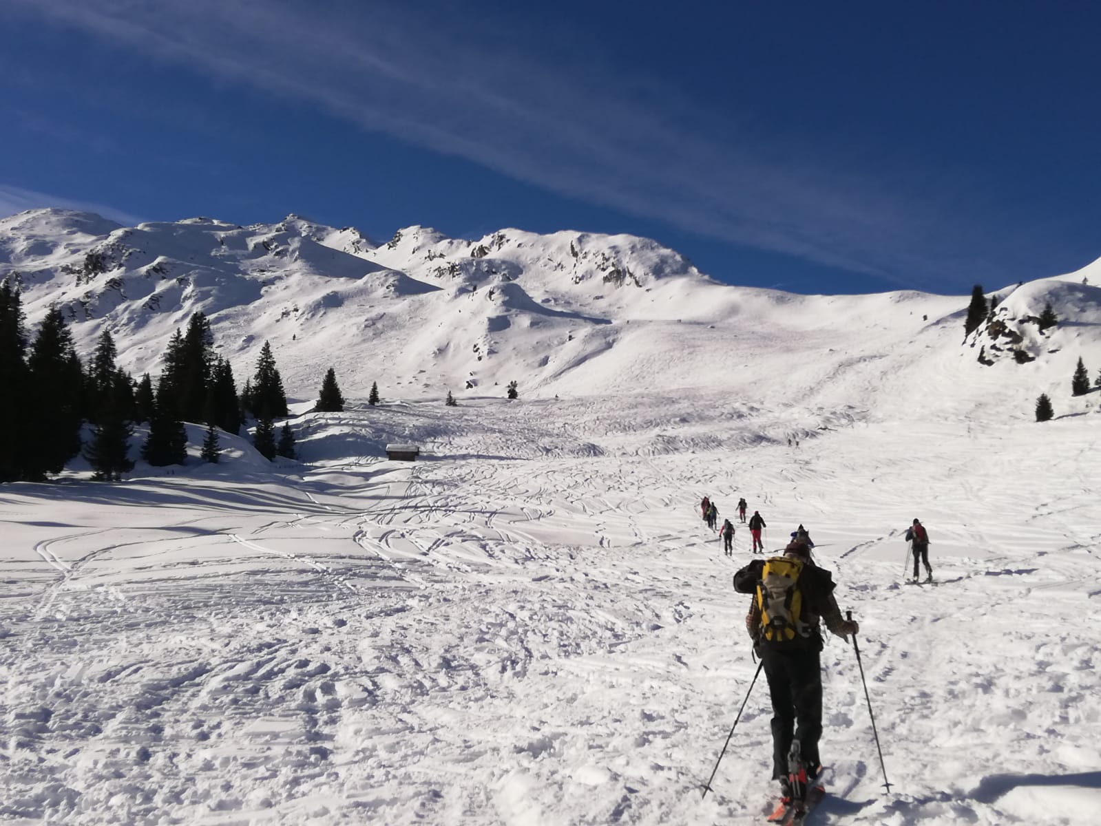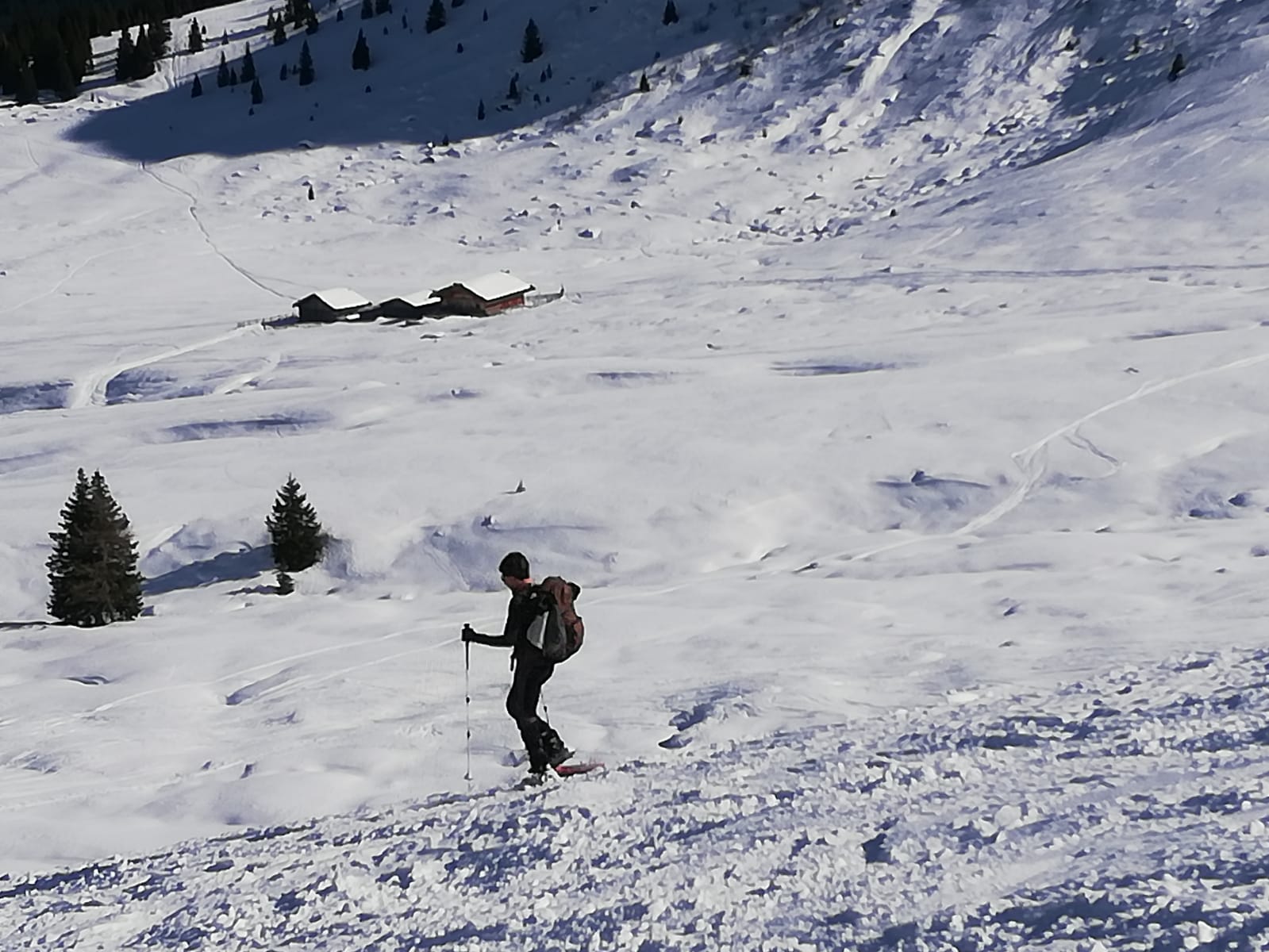 Schnee liegt ab Parkplatz, in den freien Hängen gut griffiger Schnee. Auch die Forststraßen griffig, nirgends eisig. Wind war nicht viel, dafür recht mild.