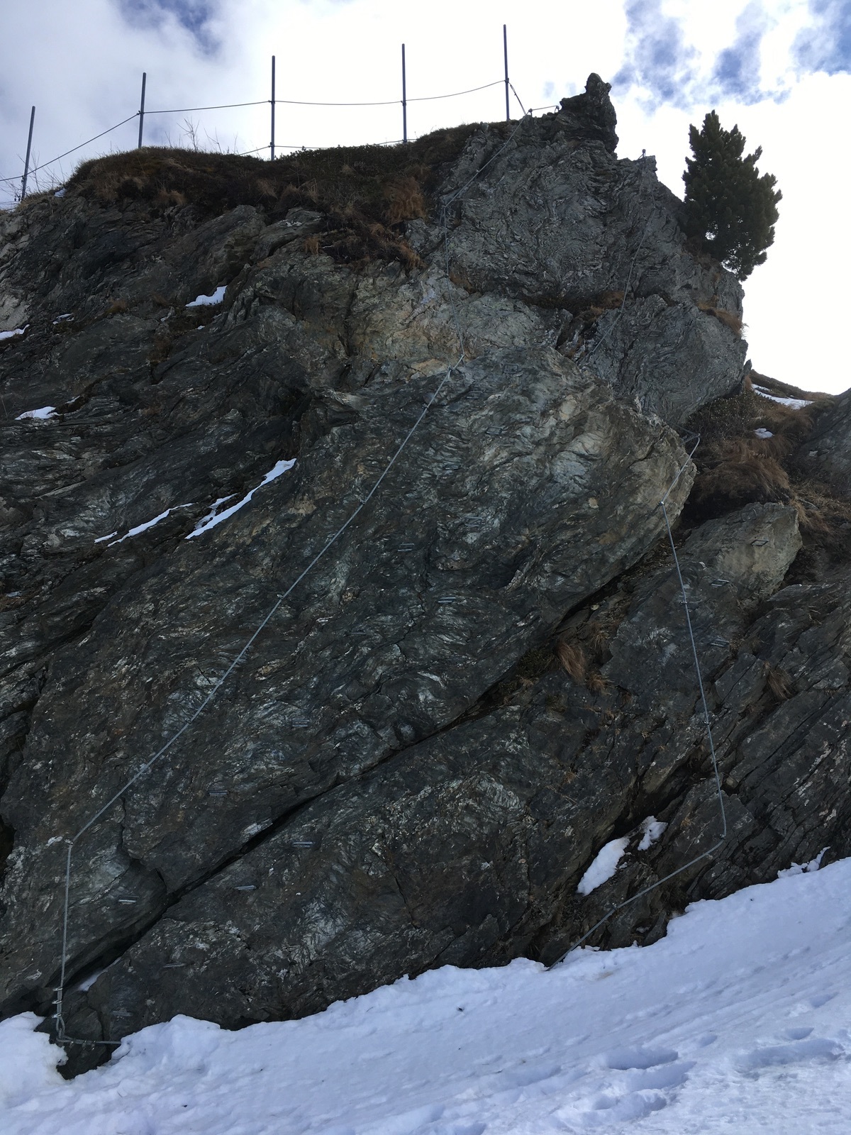 Vom Onkeljoch wenige Meter über der Bergstation der Geolsbahn gab es dann zunächst eine Abfahrt zur Bergstation der Spieljochbahn und als alpine Zugabe den kurzen Übungsklettersteig zum Spieljoch-Gipfelkreuz: Unten zwei Varianten ca. B, oben A und Gehgelände. Also sehr einfach und sehr kurz, mit Skischuhen und den Skiern auf dem Buckel habe ich ein Klettersteigset dennoch als nicht schlecht empfunden. Es ist halt ein typischer Bergbahnklettersteig und nach den Trittstufen zu schließen gerichtet v.a. an Kinder, denn man könnte ja auch einfach hinten herum auf den Gipfel laufen / mit Skiern steigen. Vom aussichtsreichen Gipfelkreuz mit Rastbänken dann nochmals im freien Gelände zum Onkeljoch und Abfahrt über die offiziell geschlossene und auch nicht durchgehend präparierte Piste / Skiweg 4a "rund um das Spieljoch", dann die Talabfahrt. So kommen (insgesamt) über 1.600 Hm Skiabfahrt zustande, und schlechte Abfahrtsmeter waren keine dabei ...