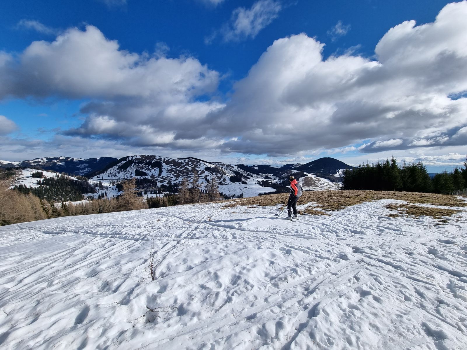 Teichalm P - alter, nicht mehr existierender Ostlifthang (eigentlich ein Nordhang) auf- und abwärts, weiter über Straße zur Latschenhütte, kurz am Loipenrand entlang bis zum Aufstieg in Richtung Heulantsch - Aufstieg über Südhang, Abfahrt ebenfalls.