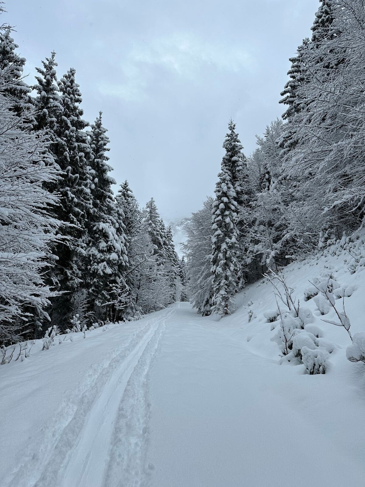 Erstaunlich viel Neuschnee in der Früh in Mittenwald, Start mit Ski schon vom Parkplatz weg möglich.