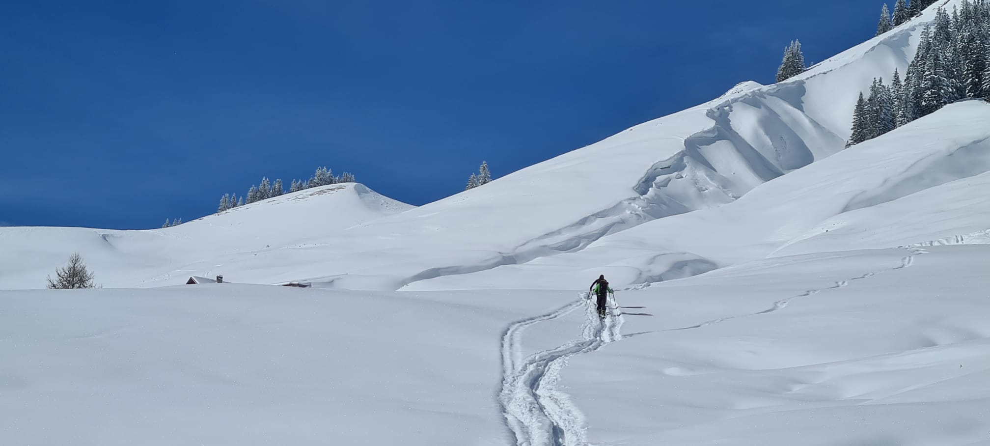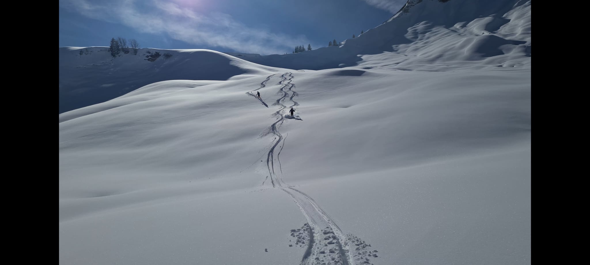 Heute der schönste Skitourentag der Saison. Traumpulver auf überwiegend gesetzter Unterlage, kaum Leute. Und wenn man sich ein bisschen auskennt, konnte man da und dort noch die erste Spur ziehen.