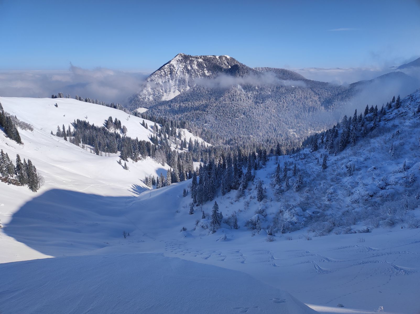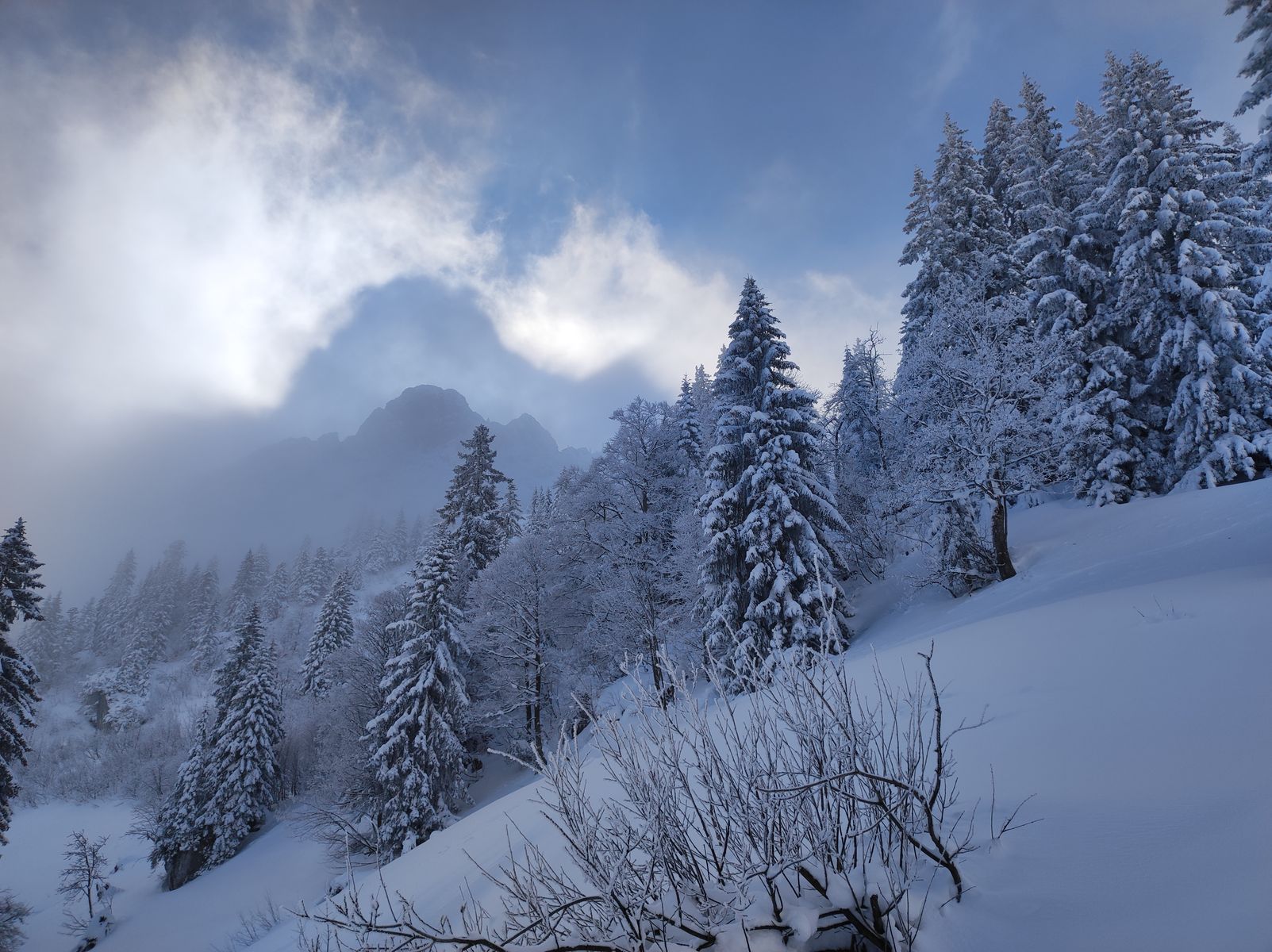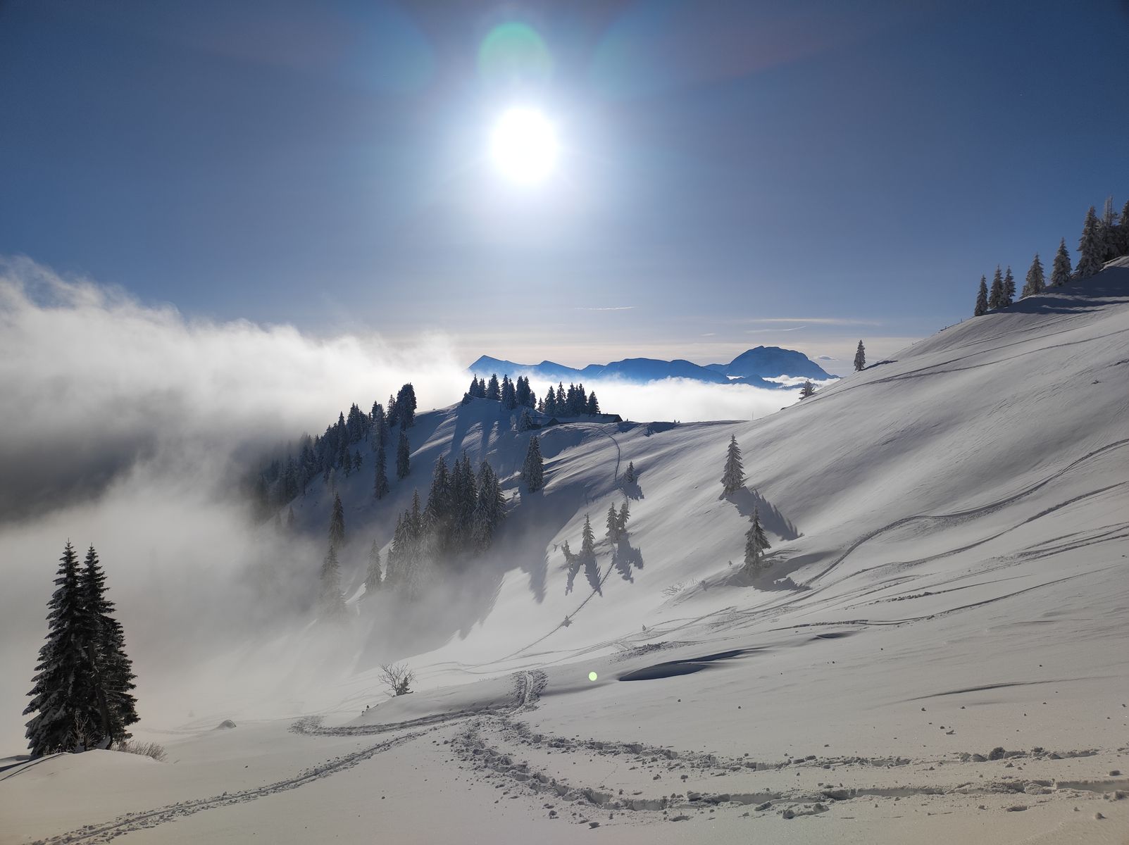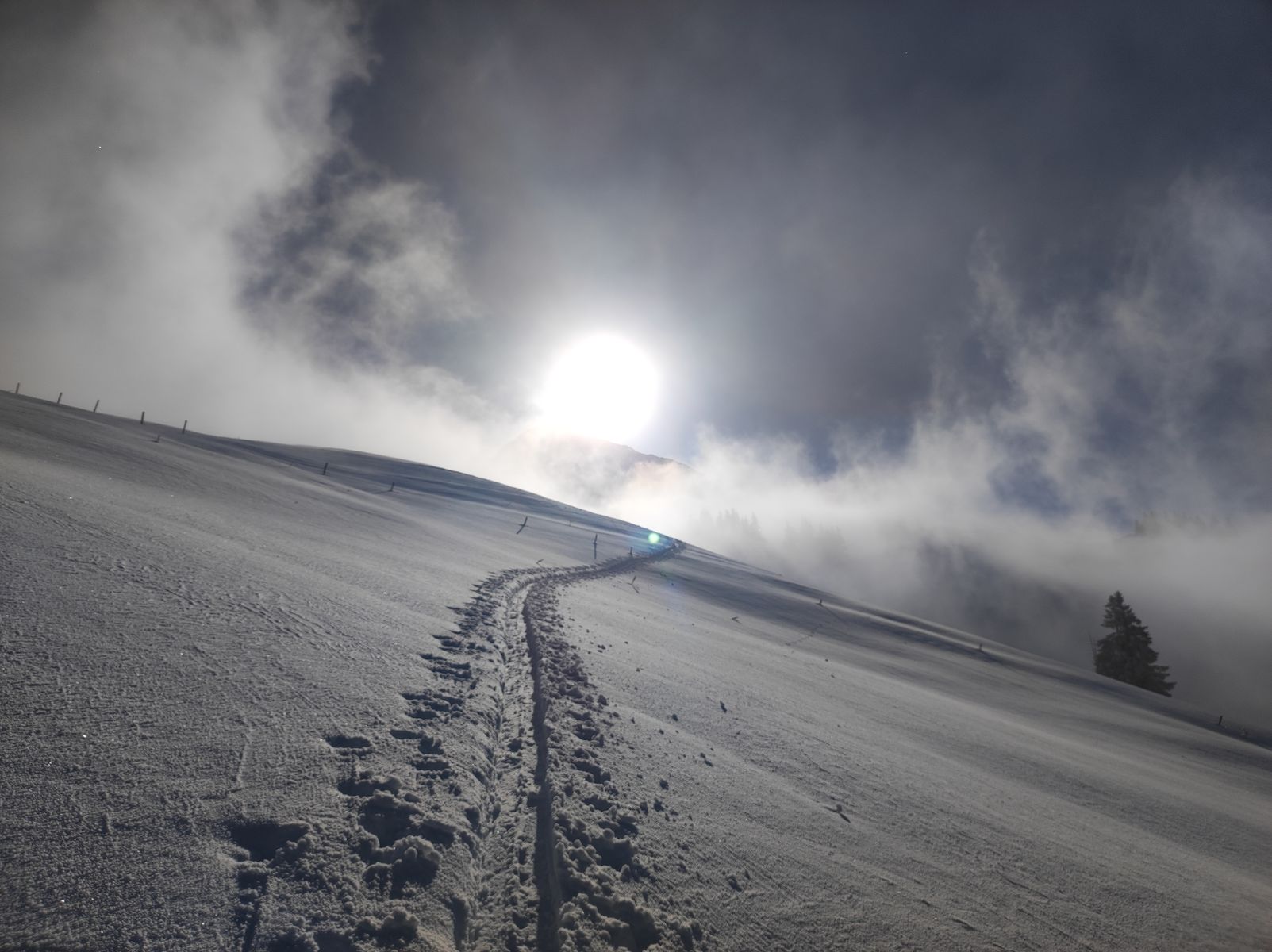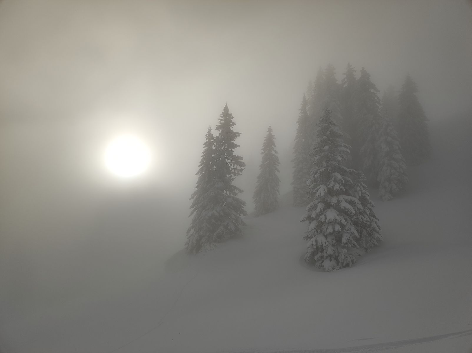 Sehr früh ging es heute auf die Buchstein-Reibn, weil am Nachmittag noch gearbeitet werden musste. Von den genialen Schneeverhältnissen abgesehen heute auch durch den sich auflösenden Nebel eine ungemein stimmungsvolle Angelegenheit.