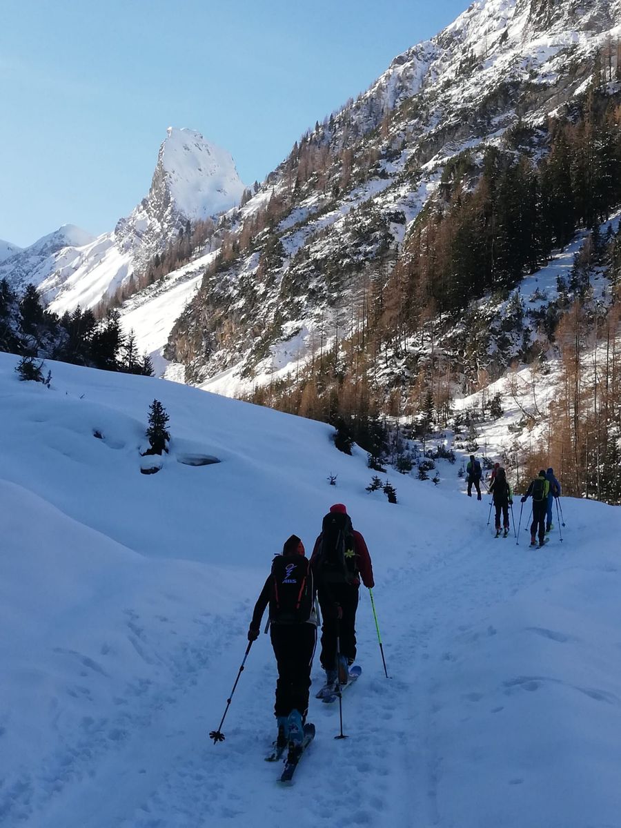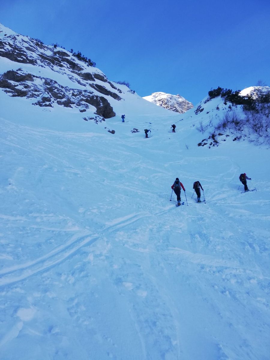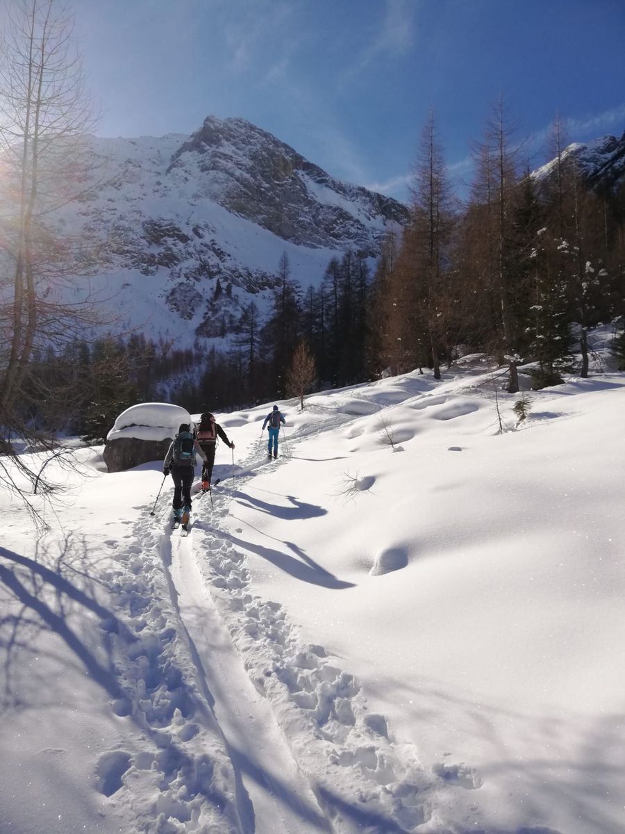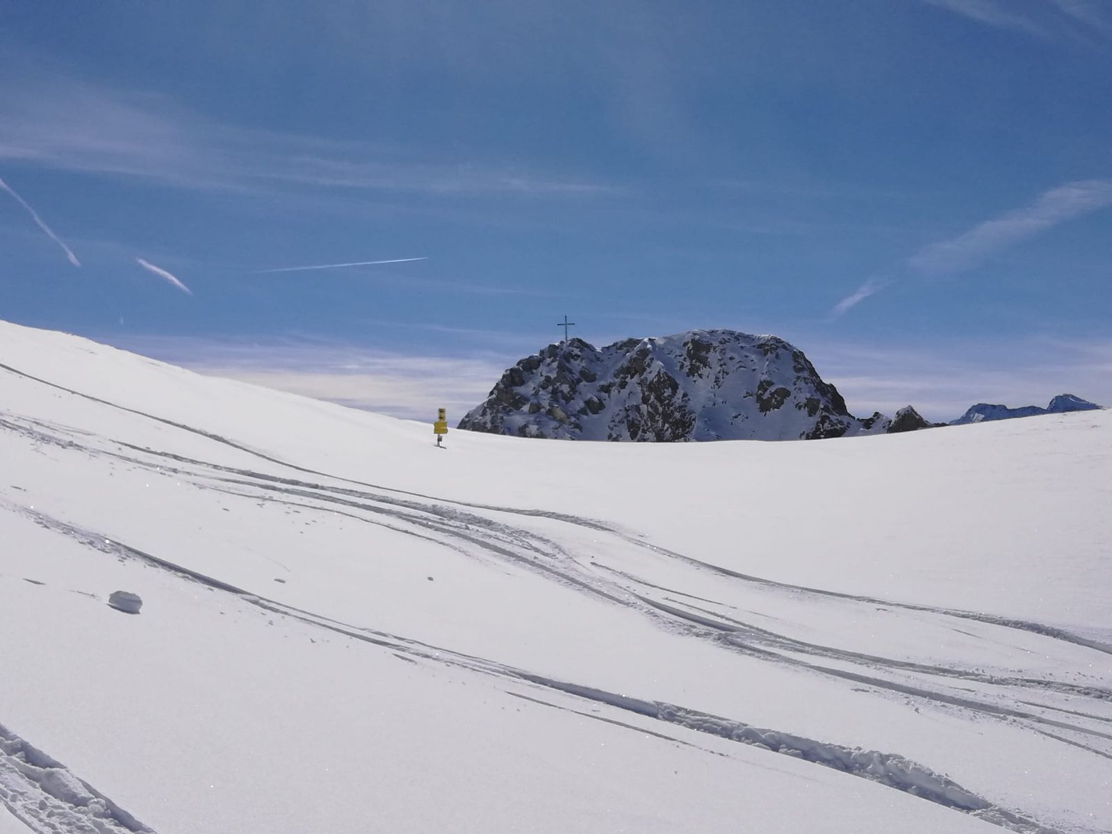 Von Kaisers auf Forststraße bis zur Kaiseralpe und nach Süden abbiegen zu dem großen Hang unterhalb der Nordabstürze des Grieskopfes. Dann Richtung Sommerweg nach rechts oben rausqueren (hier kurzzeitig ziemlich hart) und durch das Hochtälchen oder etwas direkter links oberhalb des Tälchens zum Kaiserjochhaus. Von dort über den steilen, gut 250Hm hohen Gipfelhang mit Ski bis zum Kreuz.