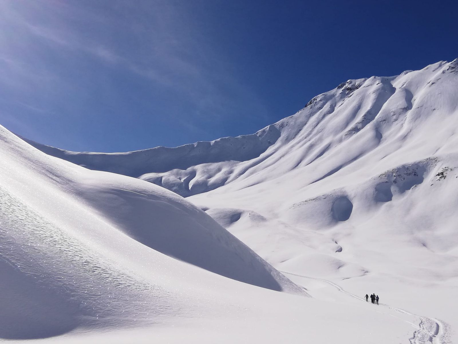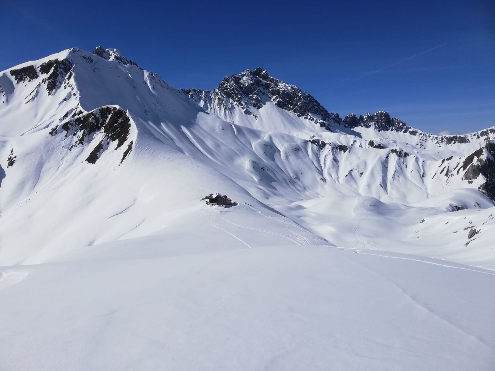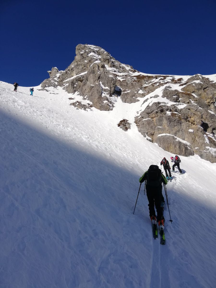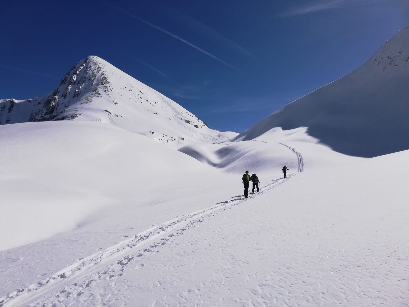 Von Kaisers auf Forststraße bis zur Kaiseralpe und nach Süden abbiegen zu dem großen Hang unterhalb der Nordabstürze des Grieskopfes. Dann Richtung Sommerweg nach rechts oben rausqueren (hier kurzzeitig ziemlich hart) und durch das Hochtälchen oder etwas direkter links oberhalb des Tälchens zum Kaiserjochhaus. Von dort über den steilen, gut 250Hm hohen Gipfelhang mit Ski bis zum Kreuz.