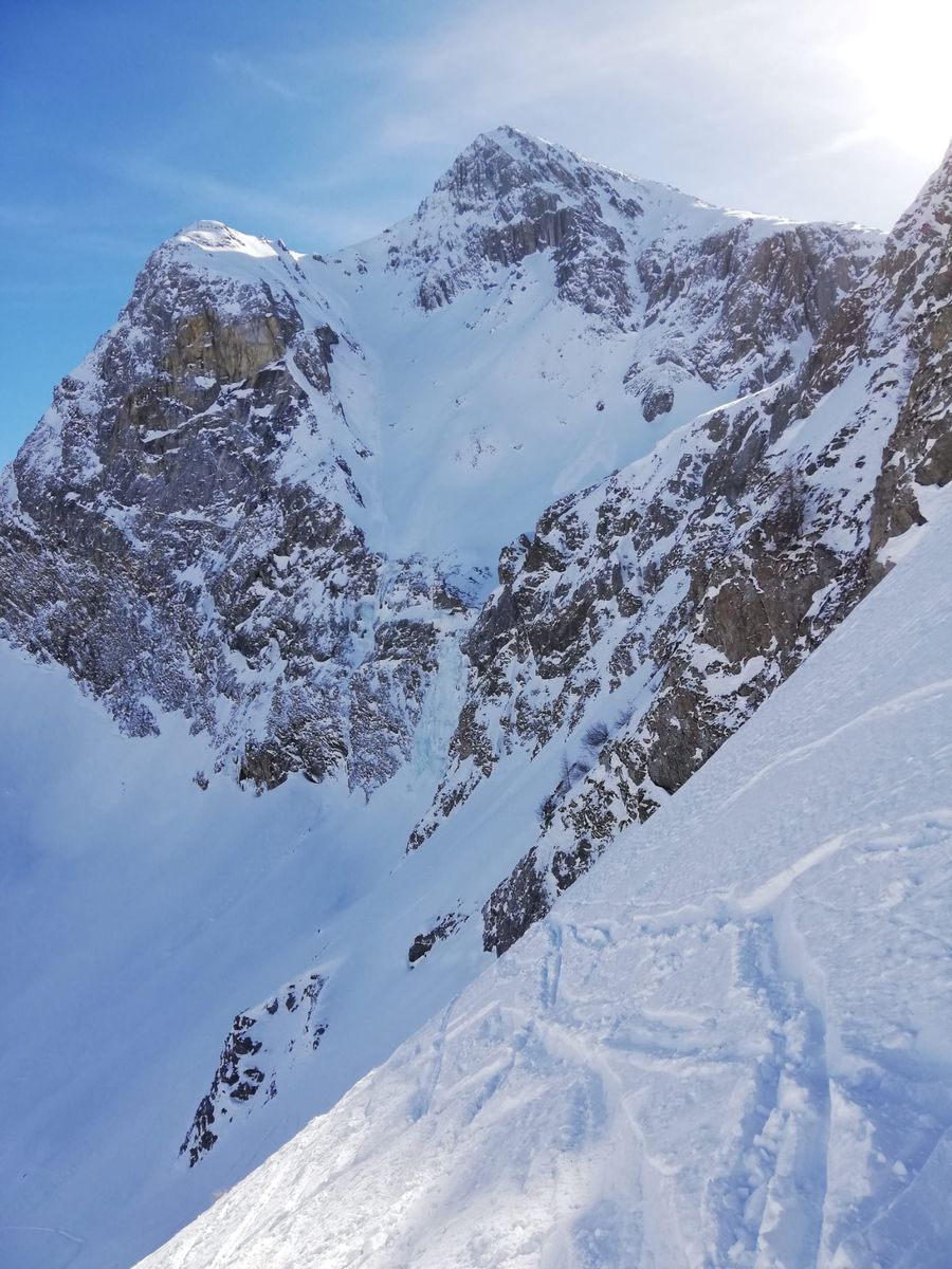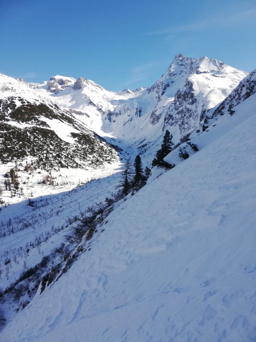 Im Gipfelhang liegen nur ca 10-20cm Schnee, allerdings ziemlich kompakt, einzelne Steine oder grasige Stellen schauen raus. Hier wind gepresster, harschiger Schnee, nicht besonders, aber brauchbar zu fahren. Nordseitig dann guter Pulver, in der Steilstufe jetzt schon recht zerfahren. Forststraße läuft gut raus, Schnee ab/bis etwa einen km vor Kaisers, ca 15 Minuten zu Fuß.