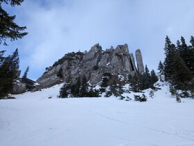 Ich bin der von Tourentipp vorgeschlagenen Route gefolgt (Abfahrt Variante 1, glaube ich...). Es lag zwar viel Schnee, aber ich stimme mit den anderen Voralpenskitourern zu, dass die Pulvertage jetzt vorbei sind. Im Kar nach dem 1. Sattel war der Schnee ziemlich schwer und anstrengend zu fahren, unten gab es sogar Bruchharsch. Den dichten und steilen Wald nach dem Gegenanstieg fand ich besonders anspruchsvoll, es sei denn, man kann gut mit Ski von Bäumen abklettern.