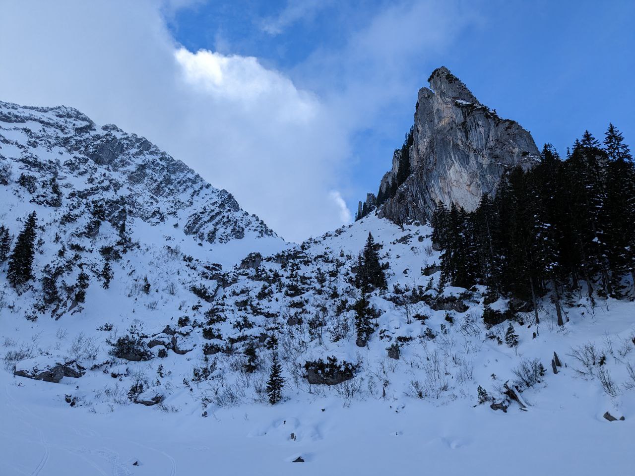 Ich bin der von Tourentipp vorgeschlagenen Route gefolgt (Abfahrt Variante 1, glaube ich...). Es lag zwar viel Schnee, aber ich stimme mit den anderen Voralpenskitourern zu, dass die Pulvertage jetzt vorbei sind. Im Kar nach dem 1. Sattel war der Schnee ziemlich schwer und anstrengend zu fahren, unten gab es sogar Bruchharsch. Den dichten und steilen Wald nach dem Gegenanstieg fand ich besonders anspruchsvoll, es sei denn, man kann gut mit Ski von Bäumen abklettern.