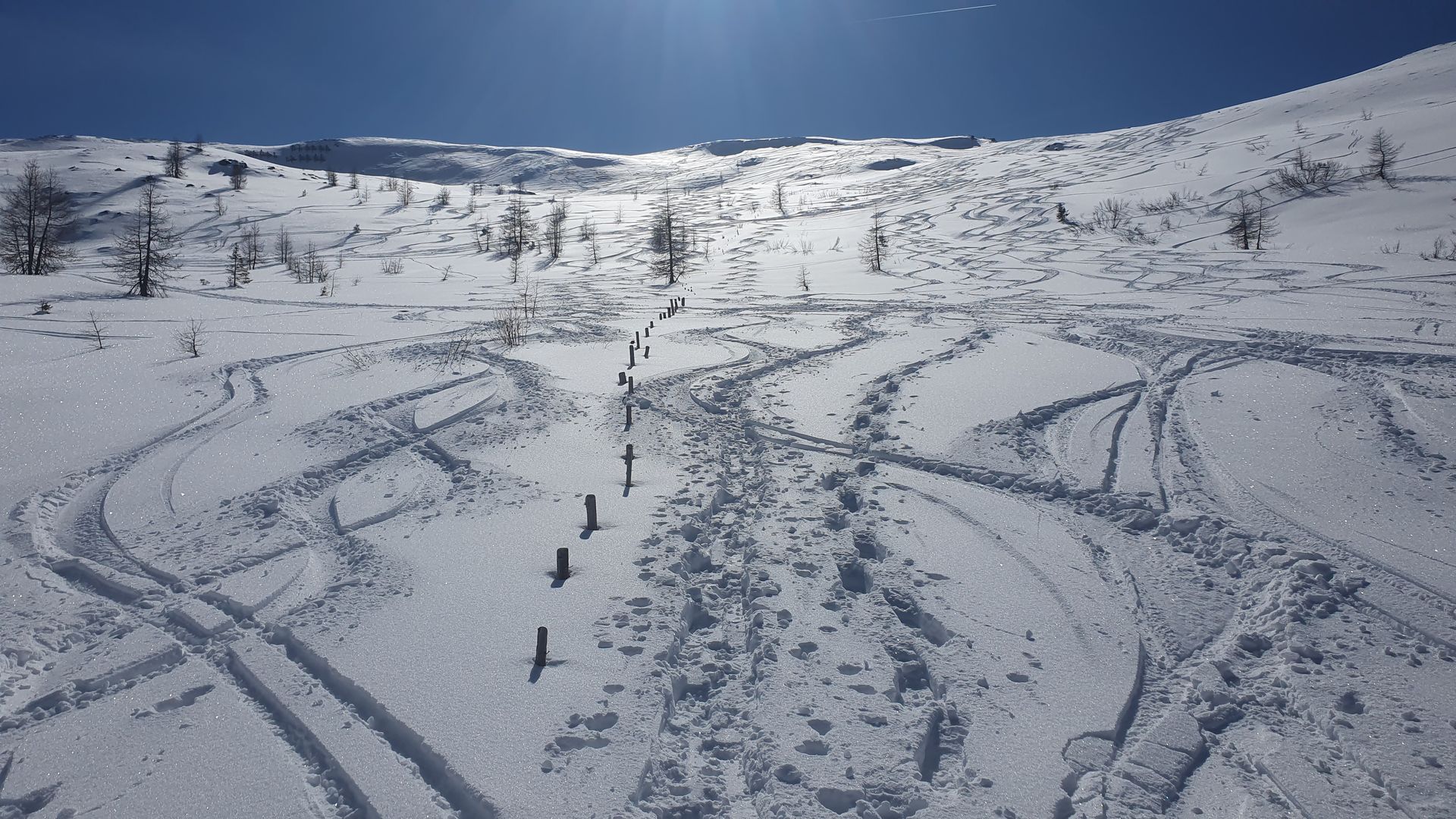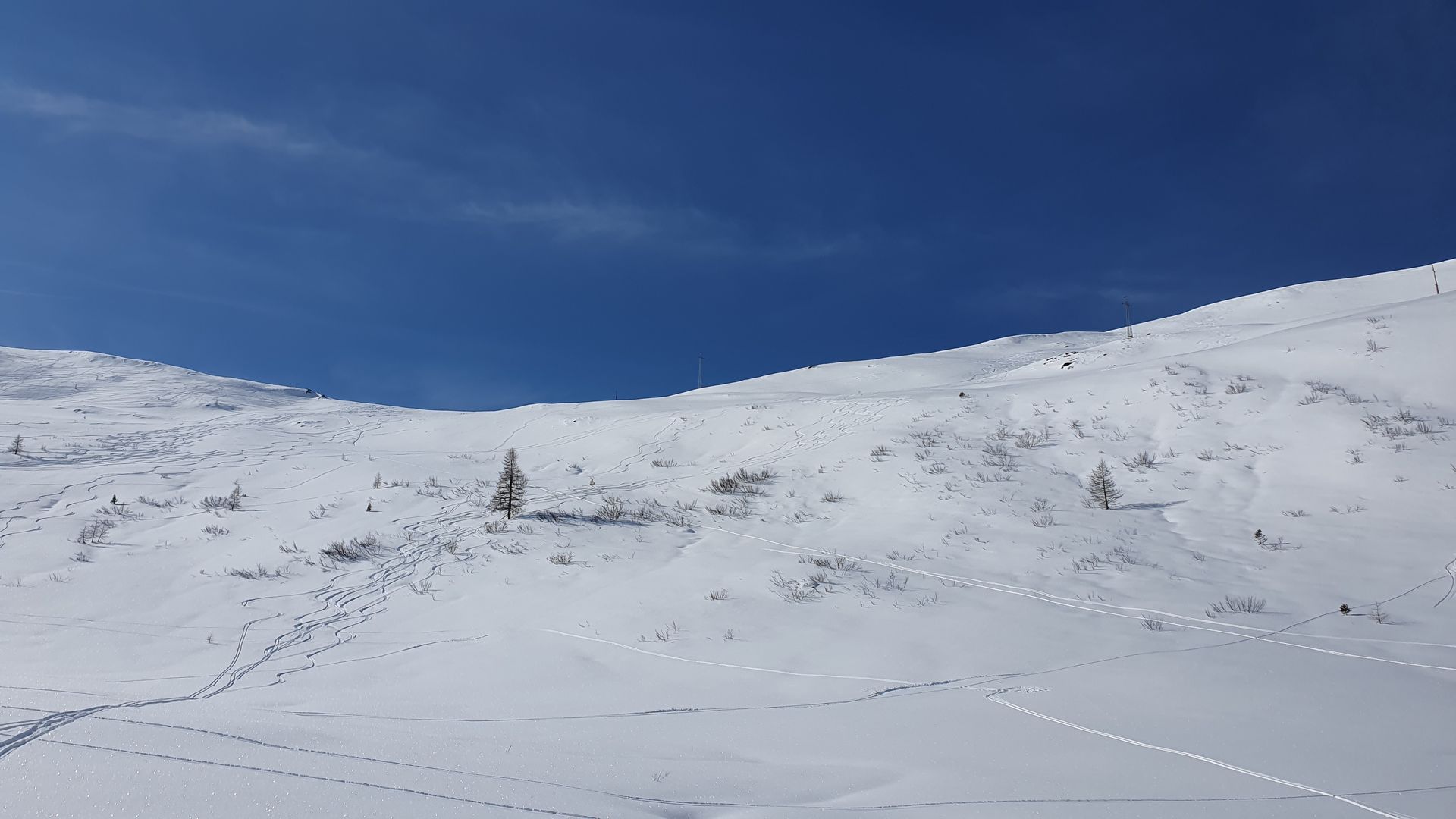 Heute, Sonntag, von Bundschuh/ Schönfeld auf den Klöllingnock und runter zur Kareralm. Wiederaufstieg zum kleinen Königsstuhl und das ganze wieder retour. Heute hatte es den besten Schnee vom ganzen Winter. Unverspurte nordseitige Hänge mit top Pulver und es waren erstaunlich wenige Leute unterwegs. Wir mussten dann die besten Hänge mehrmals gehen, denn in diesem Gebiet sind die Anstiege eher kurz. So 300 bis 400 Hm. Zudem gab es strahlenden Sonnenschein.
