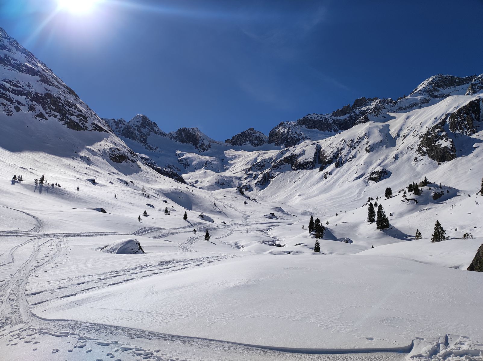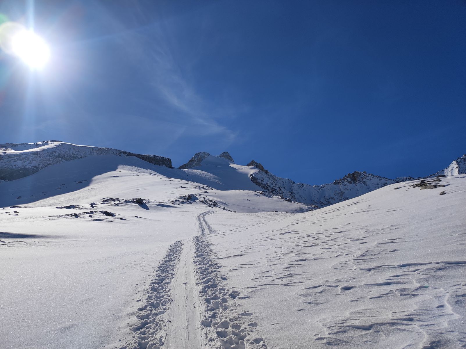 Herrlich einsam ist es im Rainbachtal! Außer uns fünf war da heute niemand. Das bedeutet dann natürlich auch: Spuren! Wir sind zunächst noch auf einer vorhandene Spur zur Windbachscharte. Obacht, wer das Gebiet vom Sommer kennt: Die Windbachscharte ist im Winter eine andere als im Sommer! Der sommerliche Übergang Rainbachtal/Windbachtal liegt viel weiter links (im Aufstiegssinn) und ist im Winter nicht sinnvoll! Man lasse sich da nicht von einem von unten sichtbaren Schilderbaum verleiten! Im Winter steigt man mehr Richtung "Warze" (=Reydter Spitze) und kommt da am Kamm in skibares Gelände, in dem man etwa 100 Höhenmeter abfährt (es lohnt sich abzufellen!). Wo ein markanter Felskamm ansetzt, wird wieder aufgefellt. Nun habe ich in herrlicher, unberührter Landschaft durch ein weitläufiges Kar in schönstem Skigelände zum Rainbachkopf hochgespurt. Etwa 70 Höhenmeter unter dem Gipfel ist dann Skidepot. Der Anstieg zum Gipfel ist an sich nicht schwierig, aber wir haben dann doch recht bald umgedreht, da wir weder Steigeisen noch Pickel dabei hatten (bewusste Entscheidung aus Gewichtsgründen) - die zwei Kollegen von der Richterhütte sind aber mir Steigeisen hoch.