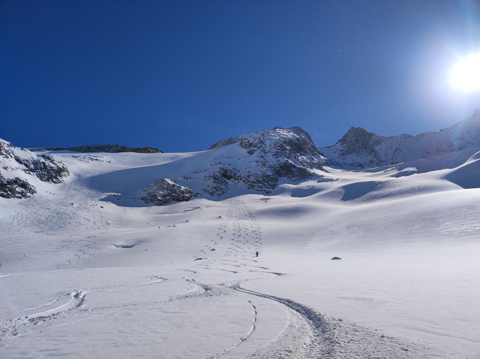 Die Abfahrt im Bereich unserer Aufstiegsspur war wiederum sehr fein. Da wir noch einiges auf der Richterhütte deponiert hatten, mussten wir ja wieder dorthin zurück. Alternativ wäre es aber auch möglich, bis zur Windbachtalalm (1900m) abzufahren und von dort wieder über einen Gegenanstieg von ca. 800 Höhenmetern das Rainbachtal zu erreichen (verschiedene Aufstiegsoptionen denkbar). Besagte Kollegen haben das so gemacht. Wir aber haben an dem Felskamm (siehe oben) wieder aufgefellt und sind über die Südostroute auf die "Warze" und von dort zur Richterhütte hinunter gefahren (sensationeller Pulver). Von der Hütte fährt man noch etwa 300 Höhenmeter ab, bis man zur Aufstiegsroute Richtung Rosskopfscharte kommt. Da hoch und dann wiederum in sensationellen Pulver zur Zittauer Hütte hinunter. Von dort ruppig, da stark zerfahren ins Tal. Was für ein Wochenende!!!