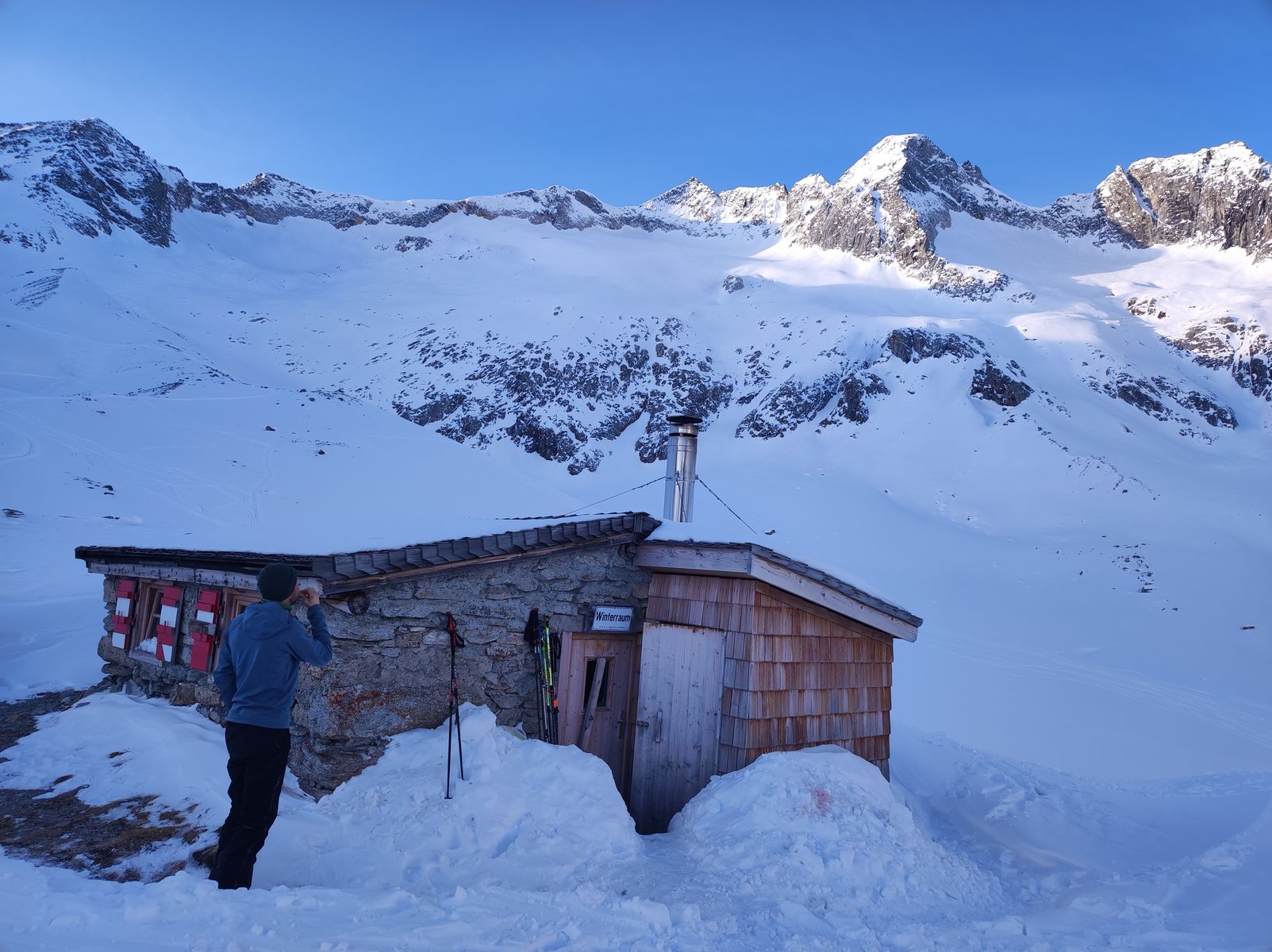 Anschließend sind wir über die Zittauer Hütte, deren Winterraum um 15 Uhr schon voll belegt war, was zwei andere Tourengeher veranlasste, spontan zur Richterhütte weiterzugehen, wo wie sie dann trafen, zur Rosskarscharte und jenseits südseitig im Wechsel von Pulver und Harsch hinunter ins Rainbachtal. Nun hieß es nochmals anfellen und etwa 300 Höhenmeter zur Richterhütte aufzusteigen, wo uns bereits ein ausgeschaufelter Eingang und ein gemütlich knisternder Ofen erwarteten. Wir haben und bei den beiden Kollegen dann insofern revanchiert, als wir heute dann die Aufräum/Abspülarbeiten übernommen haben.