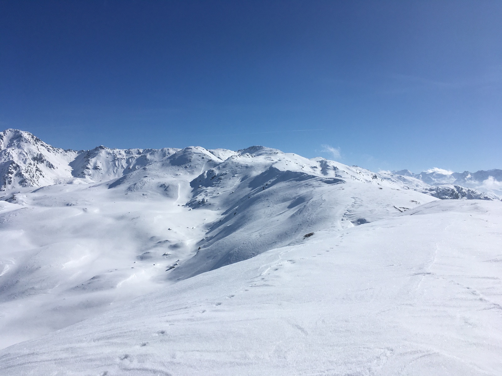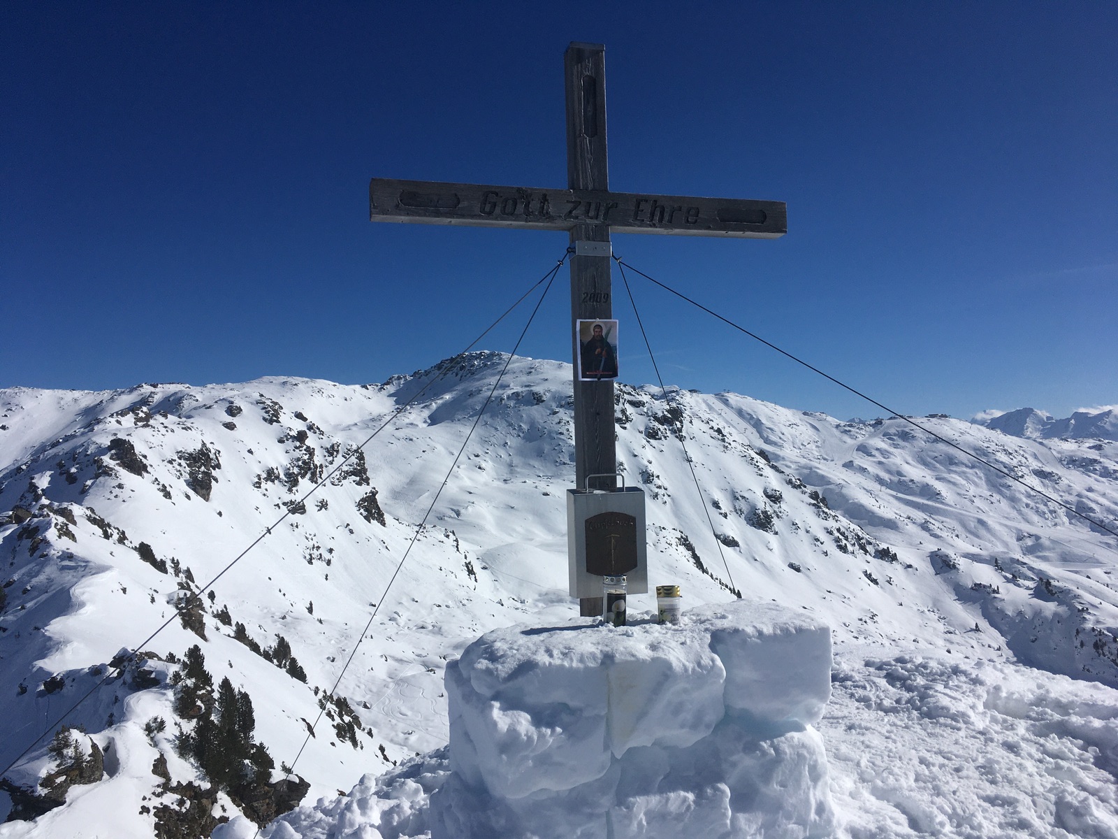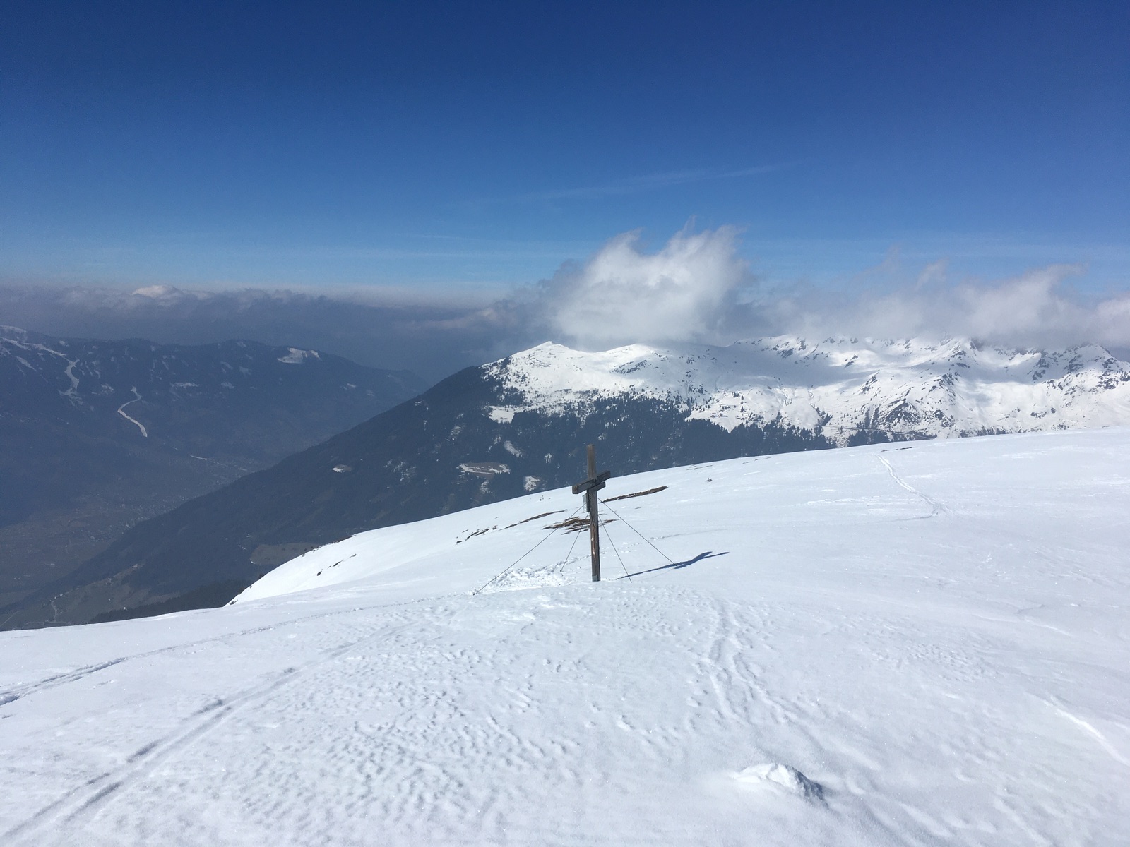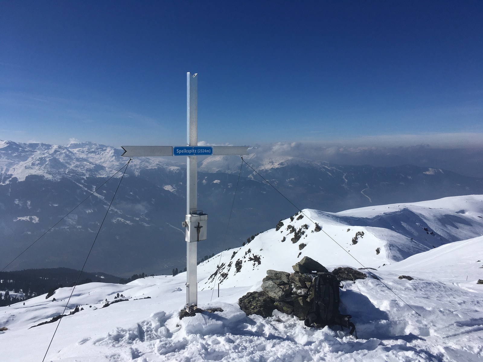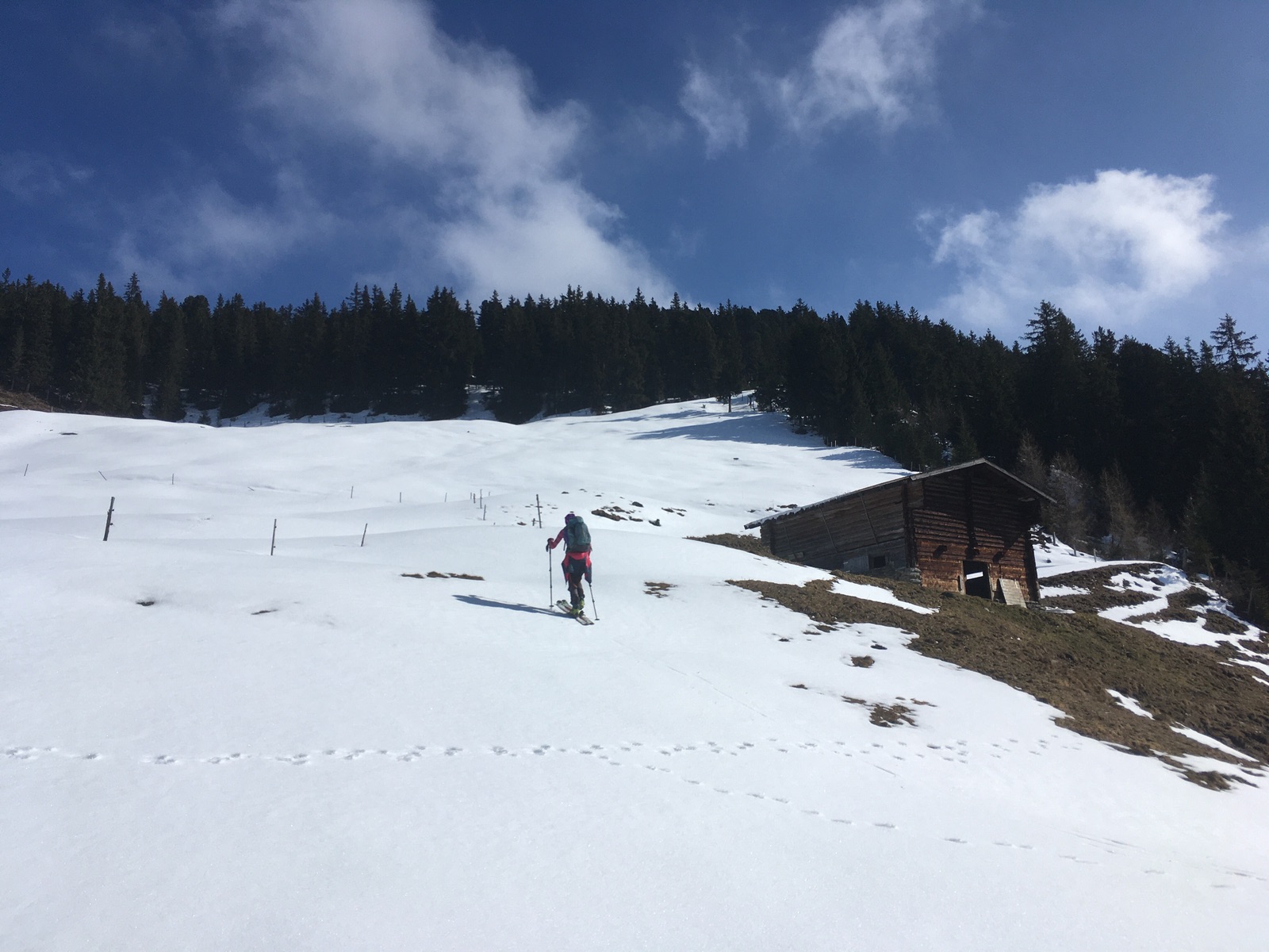 Gestern gab es eine Art Kammwanderung in den Kitzbüheler Alpen: Vom Stummerberg hinauf zum Schartenjoch (Skier getragen bis ca. 1.440 m, weil Schnee meistens zu wenig oder steinig), dann am Kamm hinüber zur Speikspitze und dem in Karten nicht verzeichneten, aber bekreuzten Mannskopf. Von dort überraschend gute Abfahrt westlich und südlich Richtung Kapaunsalm-Almweg und an der Talstation der neuen Kapauns-Sesselbahn (liegt tiefer als die alte, noch in den Karten verzeichnete Liftstation) mit etwas Skaten zur Kreuzjochhütte und nach Einkehr auf der feinen Hüttenterrasse sind wir dann über die im unteren Teil komplett zerfahrene Talabfahrt vom Skigebiet Zell.