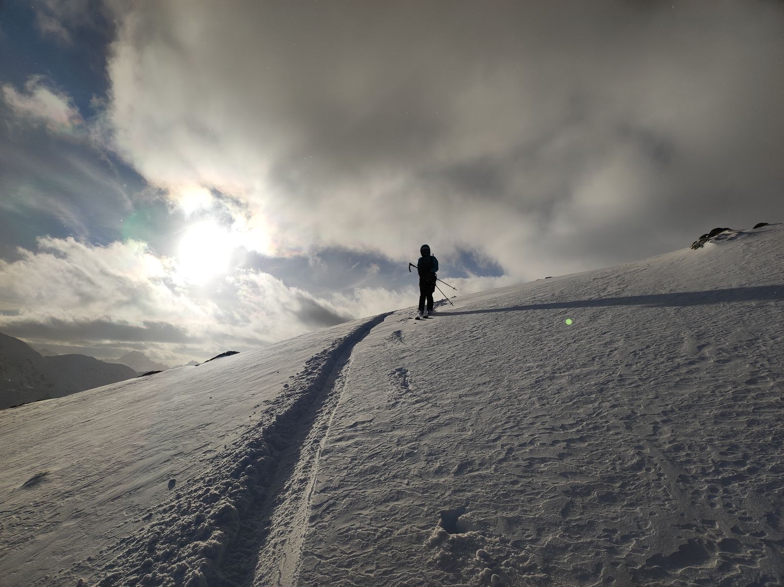 Trotz der Ausgangshöhe von 1750 Metern in Schlinig liegt gerade genug Schnee, um über die präparierte Loipe und die Forststraße zur Sesvenna Hütte aufzusteigen. In der Abfahrt trägt man im steilsten Stück aber besser. Die Schneefallgrenze lag mit etwa 2400 Metern ganz erheblich höher als vom Wetterbericht angekündigt (1600m), was im Höhenband zwischen 2000 und 2400 zu üblem Bruchharsch führt. Darüber aber 30-50 cm Pulver, sofern dieser vom starken Sturm nicht verblasen wurde. Wir sind von der Hütte bis zur Sesvenna-Scharte (rund 2800 Meter) einer Spur gefolgt; nach der Zwischenabfahrt zum Gletscher waren wir aber völlig allein und haben gespurt. Wir sind in die Scharte am Ostgrat (Skidepot) und über diesen bis etwa 30 Hm unter den Gipfel, wo wir wegen ungünstigen Schneeverhältnissen umgedreht haben. Am Grat generell viel angewehter Schnee und anstrengende Wühlarbeit oft bis zur Brust. Nach der Abfahrt über den Gletscher sind wir noch zwei Mal auf den Schalder, um dort auch noch ein bisserl zu powdern.
