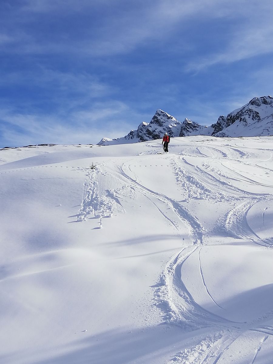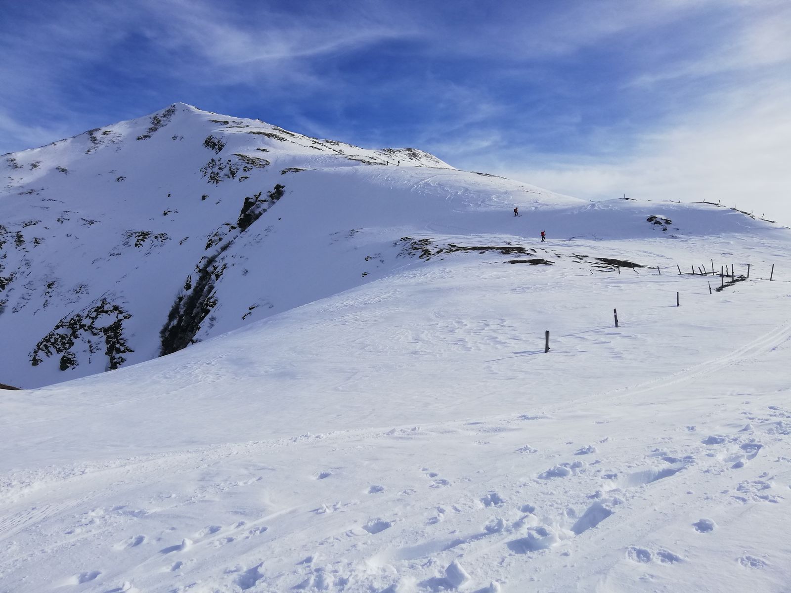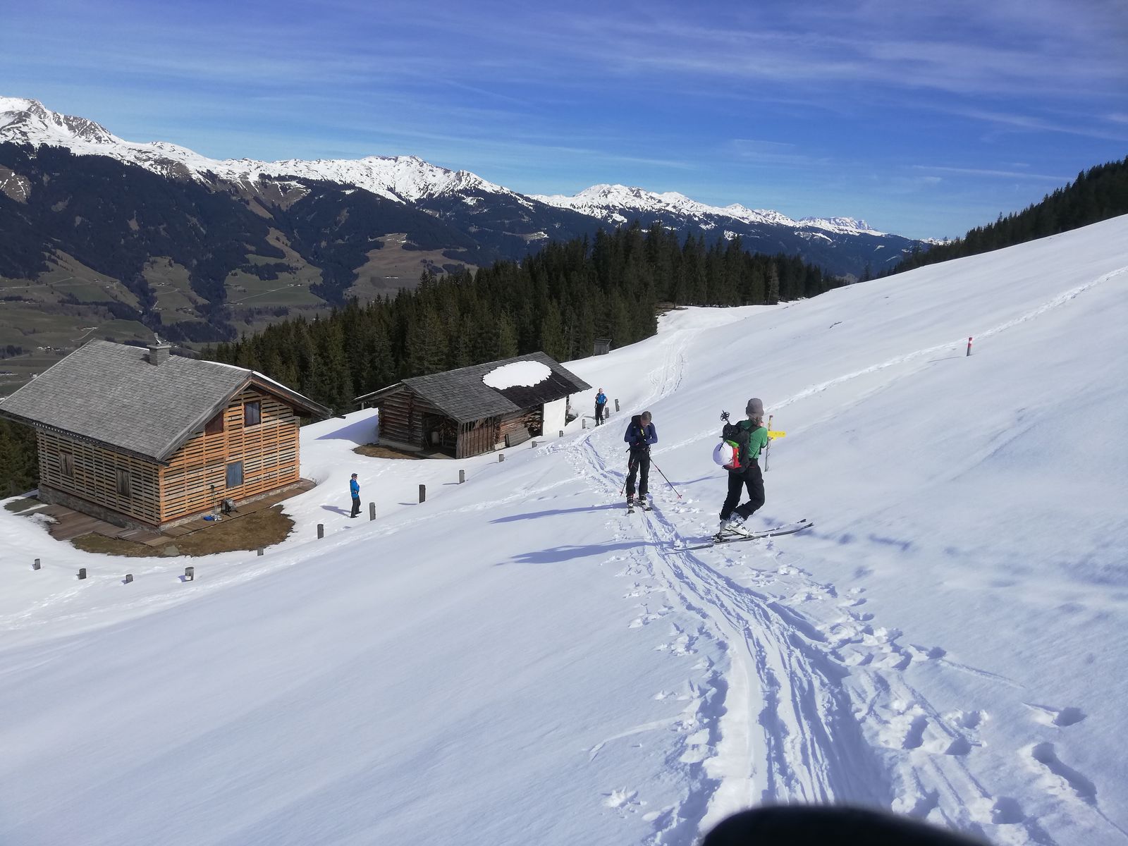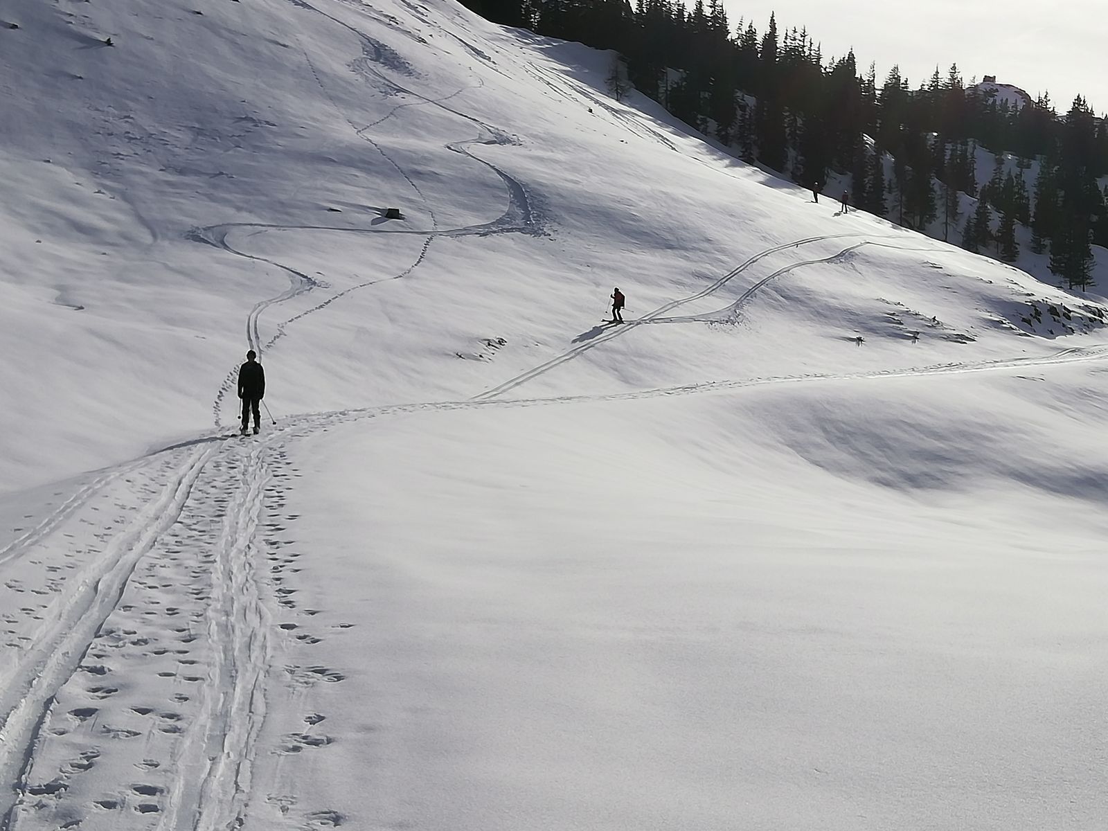 Man glaubt es kaum, wir konnten am Parkplatz (1200m) die Ski anschnallen und bis dorthin abfahren mit nur zwei kurzen Tragestellen.
