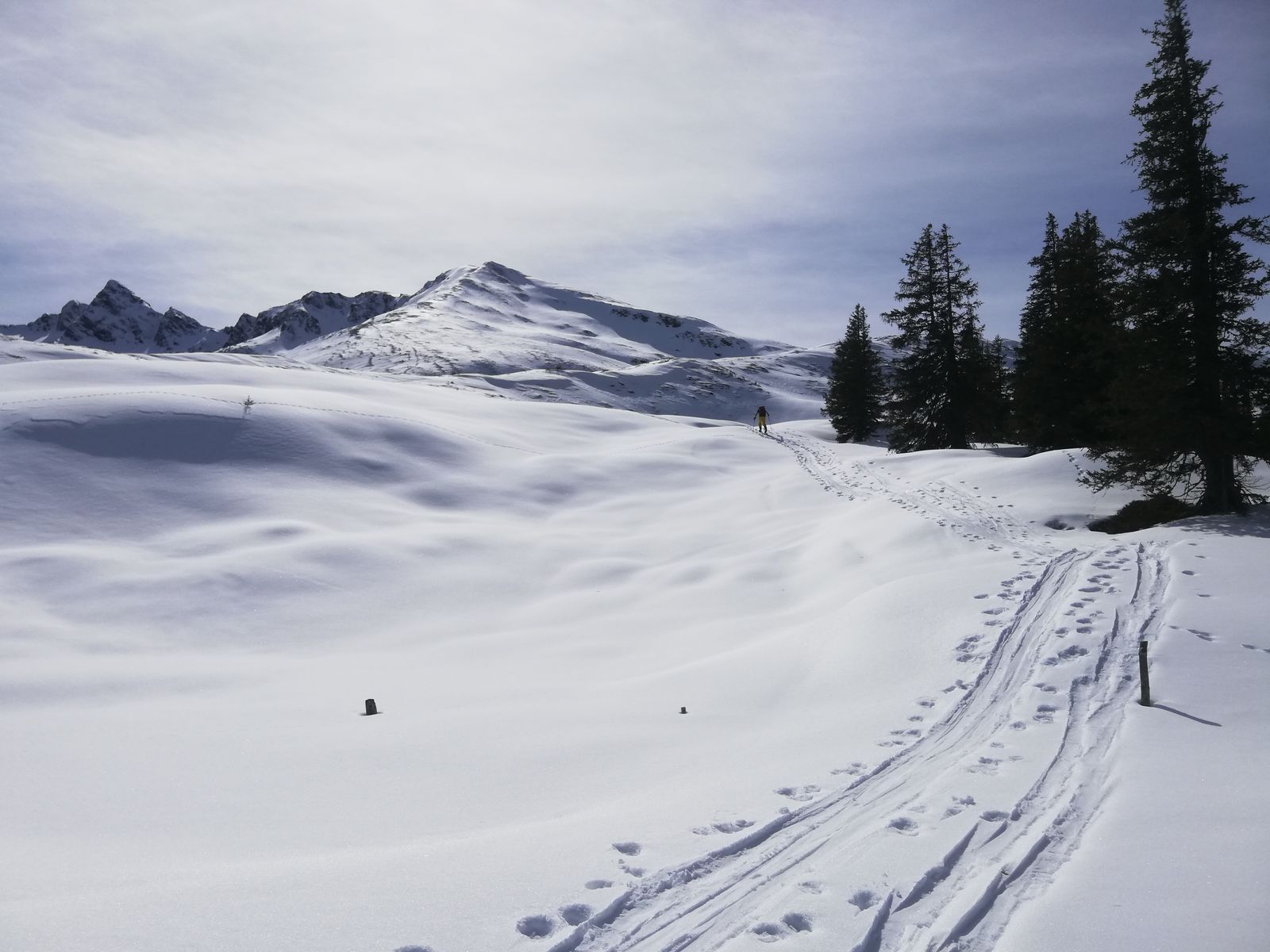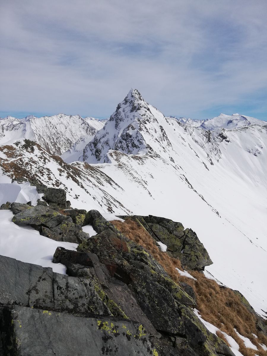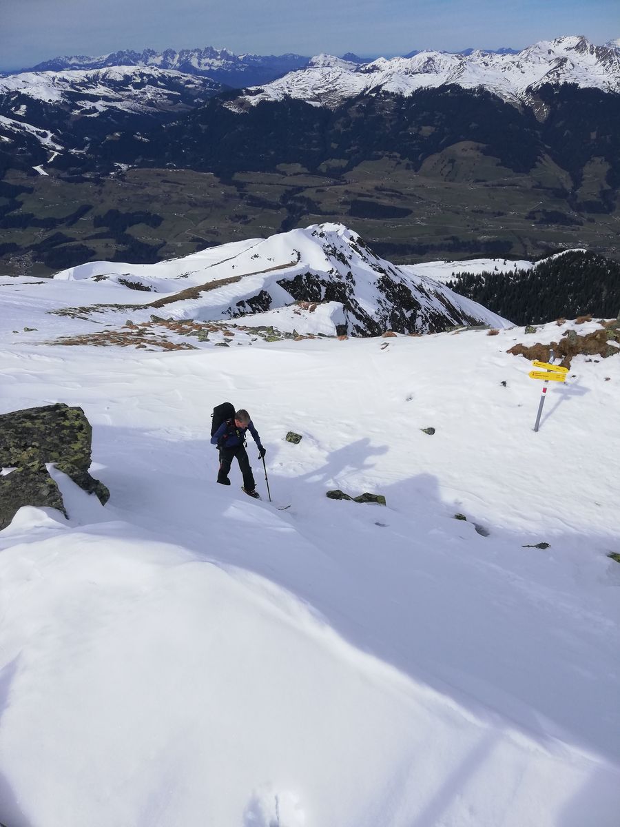 Insgesamt sind 500Hm auf Forststraßen zu überwinden. Ab ca 1700m freie Hänge, dann bald über den Nordost- bzw Nordrücken lang bis zum Pflugberg. Dieser ist der Ski(vor)gipfel des Pihapper, der selbst nur zu Fuß erreichbar ist. Es lag etwas Neuschnee, der durch die Wärme schnell schwer wurde und für üble Stollen sorgte.