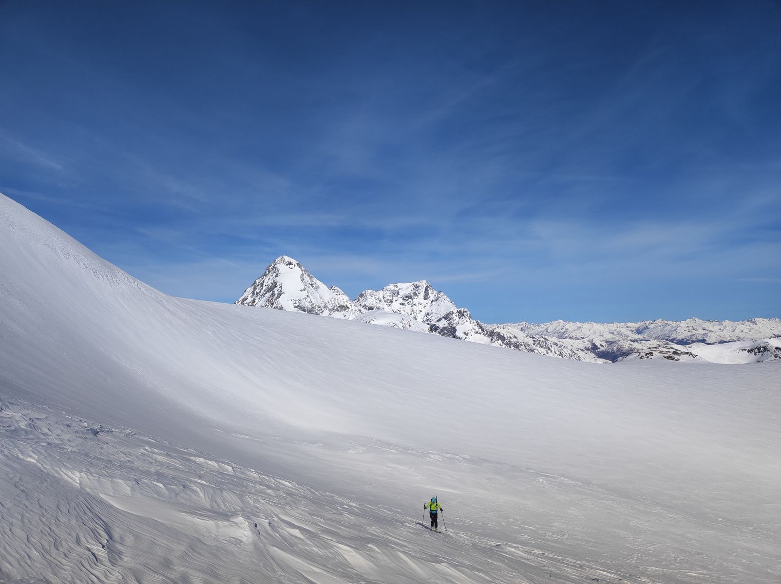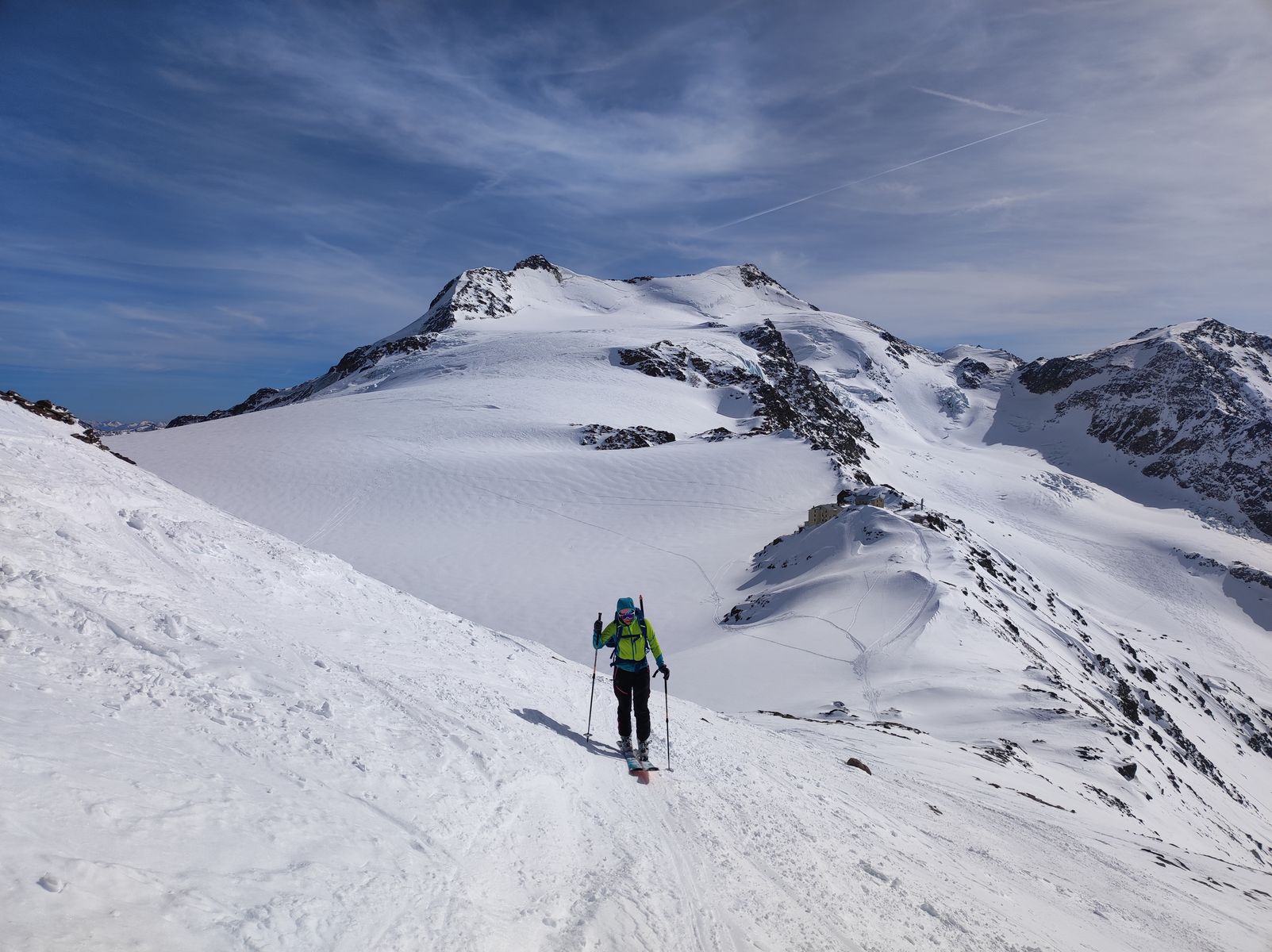 Bei der Pizzini-Hütte (2700m) haben wir wieder angefellt und sind südseitig schweißtreibend über die Casati-Hütte auf die Suldenspitze. Die spektakuläre Abfahrt durch den ebenfalls von wilden Eisbrüchen gesäumten Suldenferner zur Schaubachhütte bot sogar noch besseren Pulver als die vorige!