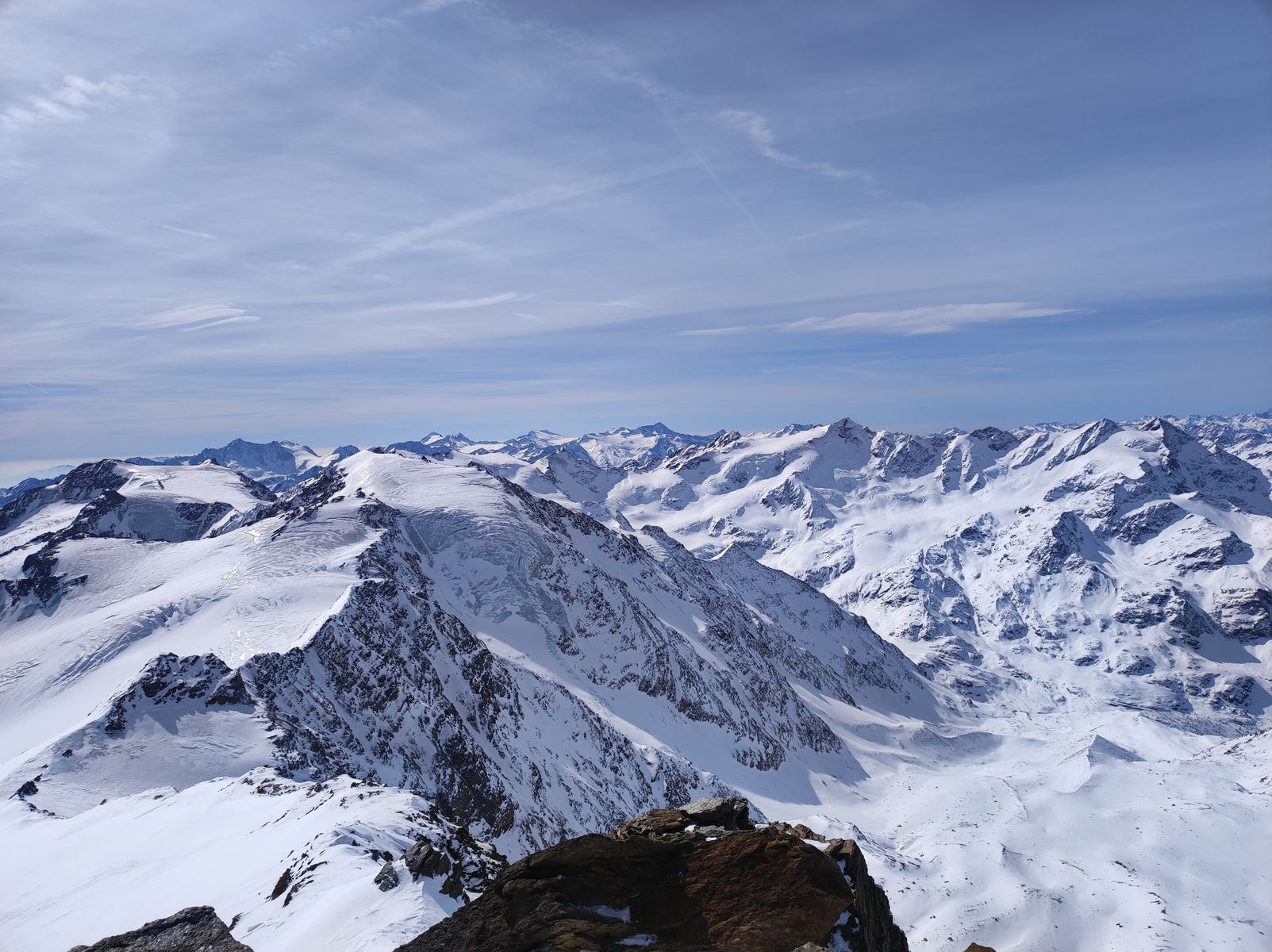 Lawinengefahr: Es war zwar über die ganze Zeit von Donnerstag bis Samstag LWS 3 ausgegeben, doch beschränkte sich das meiner Beobachtung nach auf bestimmte extrem steile Bereiche abseits gängiger Routen, wo der angewehte Schnee bei tageszeitlicher Erwärmung abging. Es waren ein paar Schneebrett- und Lockerschneelawinen zu sehen. Die Königsspitze wurde übrigens auch begangen.