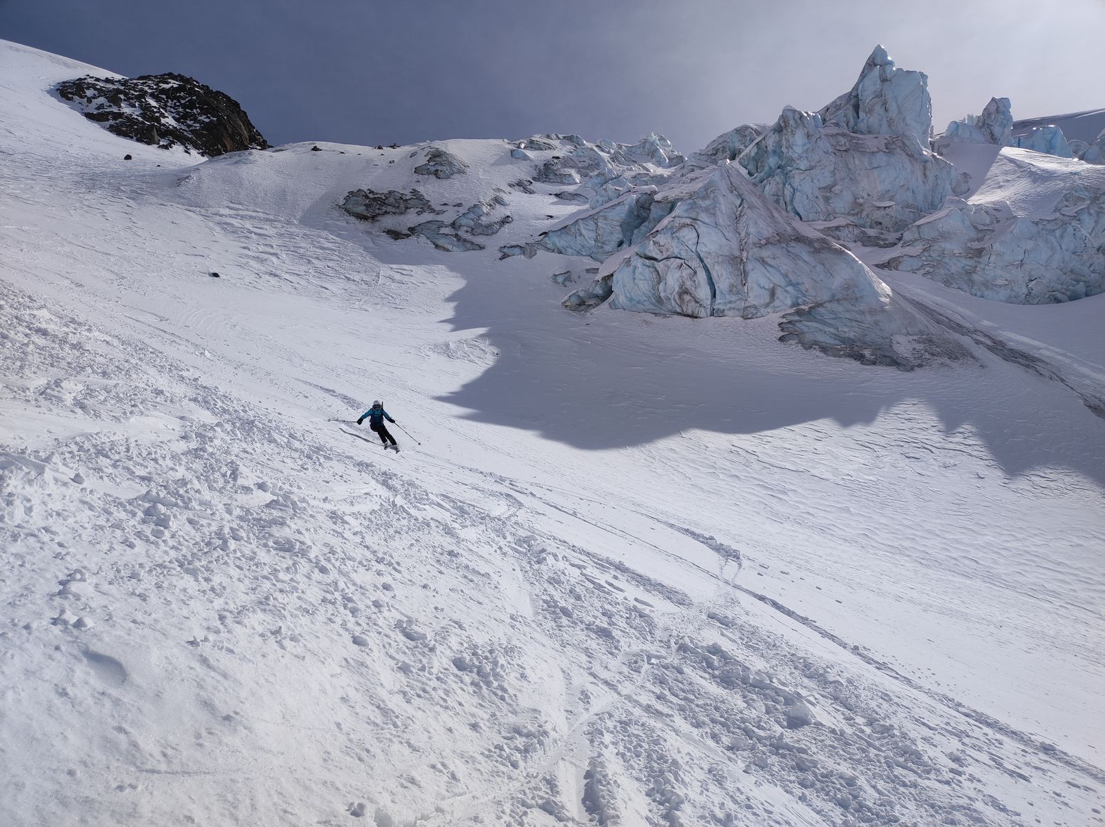 Nach ausgiebigem Genuss der gewaltigen Panoramas sind wir dann nicht einfach auf dem (skifahrerisch eher zweitrangigen) Anstiegsweg abgefahren, sondern haben die steile, teils durch atemberaubende Gletscherbrüche führende Abfahrt über den Cedec-Ferner zur Pizzini-Hütte gewählt. Toller Pulver und einfach ein geniales Erlebnis! Hinweis: Den Gletscherbruch kann man nur überwinden/umfahren, indem man an dessen oberstem Rand nach rechts fährt und so in einen 40 Grad steilen Hang gelangt! Wir hatten das Glück, dass am Donnerstag da schon jemand gefahren ist, dessen Spuren wir folgen konnten. (Die Abfahrtsroute ist vom Gipfel des Cevedale gut einsehbar - wir sind also nicht "blind" einfach einer Spur nachgefahren.)