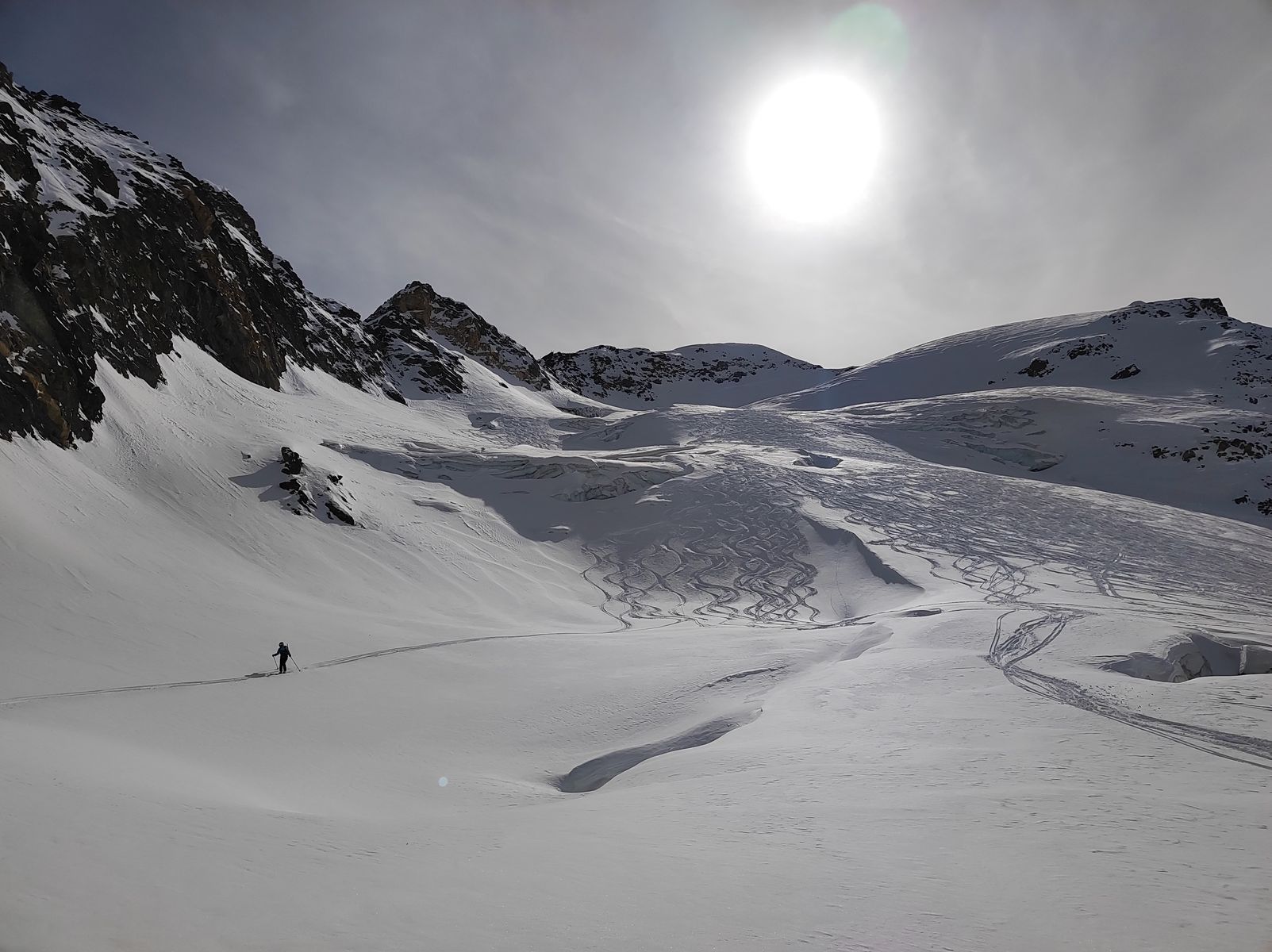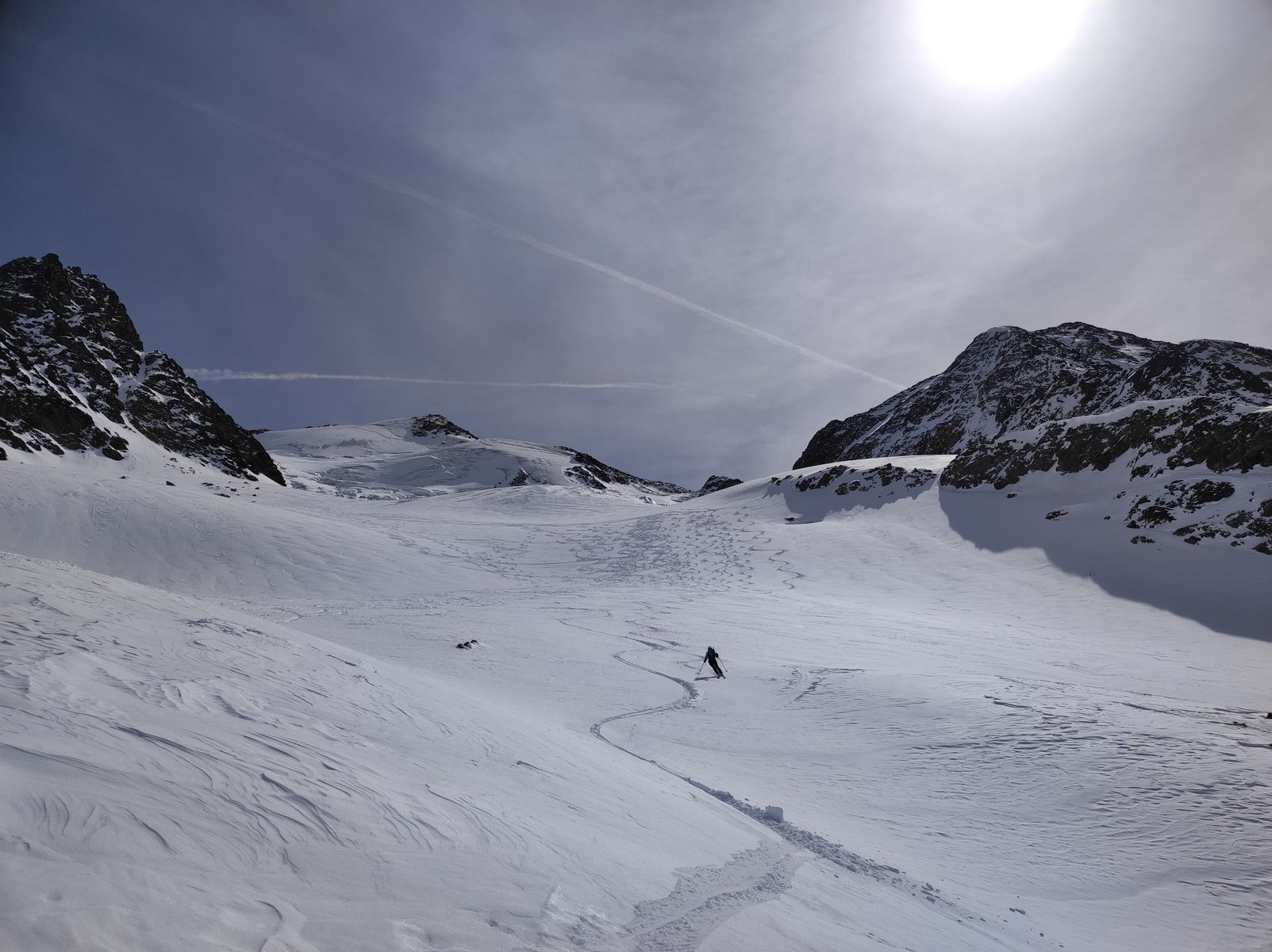 Nach einer Einkehr in der Schaubachhütte folgte schließlich der "Pflichtteil", der in diesem Fall ausnahmsweise erst nach der Kür kam: Wir sind hoch zum Madritschjoch und von dort zur Zufallhütte runter, wo dann nochmals etwa 350 Höhenmeter Anstieg zur Marteller Hütte auf uns warteten. Die südseitige Abfahrt selbst hat wenig Schnee und war um halb 5 auch schon wieder so lange im Schatten, dass sich grausiger Bruchharsch gebildet hatte. Wie froh bin ich doch in solchen Momenten, mit Claudia jemanden dabei zu haben, der auch bei solchem Mistschnee nach so einer langen Tour die Sache sicher ins Tal runterbringt.