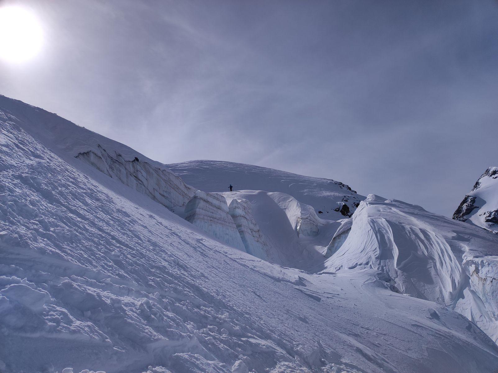 Der Bergschrund lässt sich mit etwas Vorsicht zurzeit noch gut überwinden, aber ins falsche Loch braucht man nicht treten.