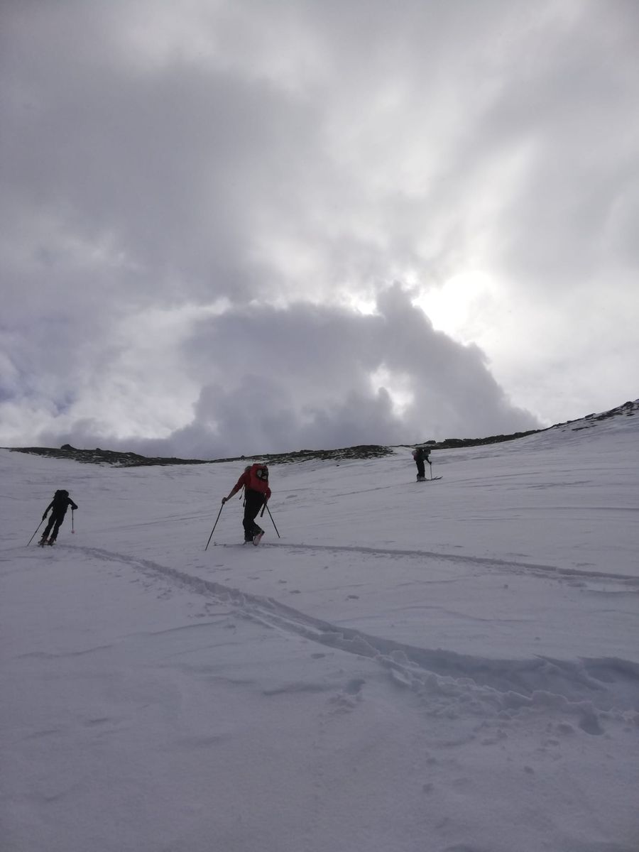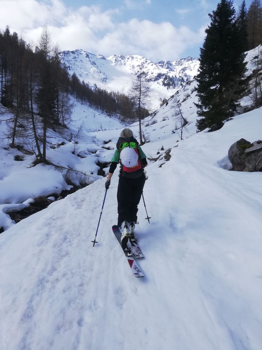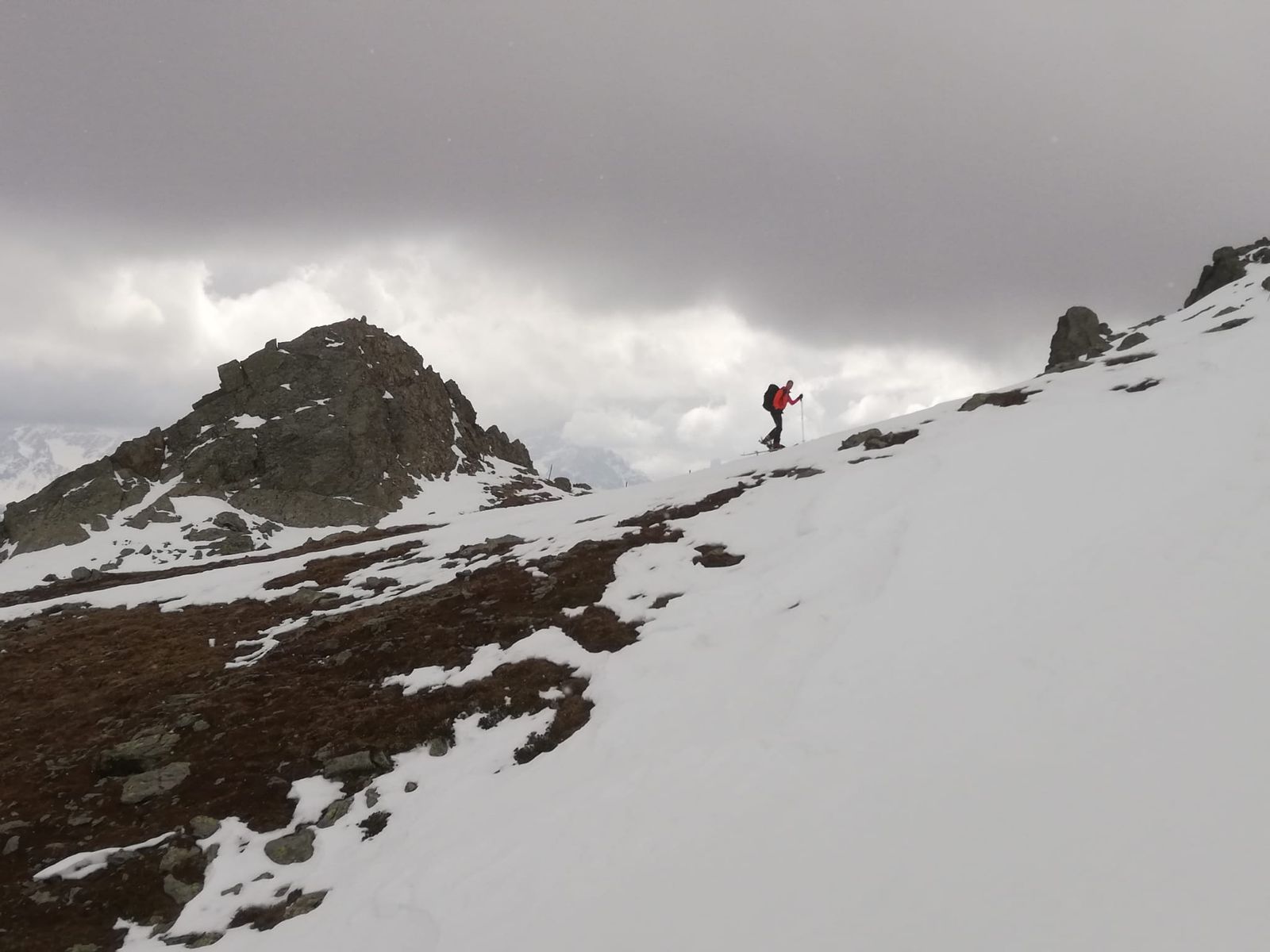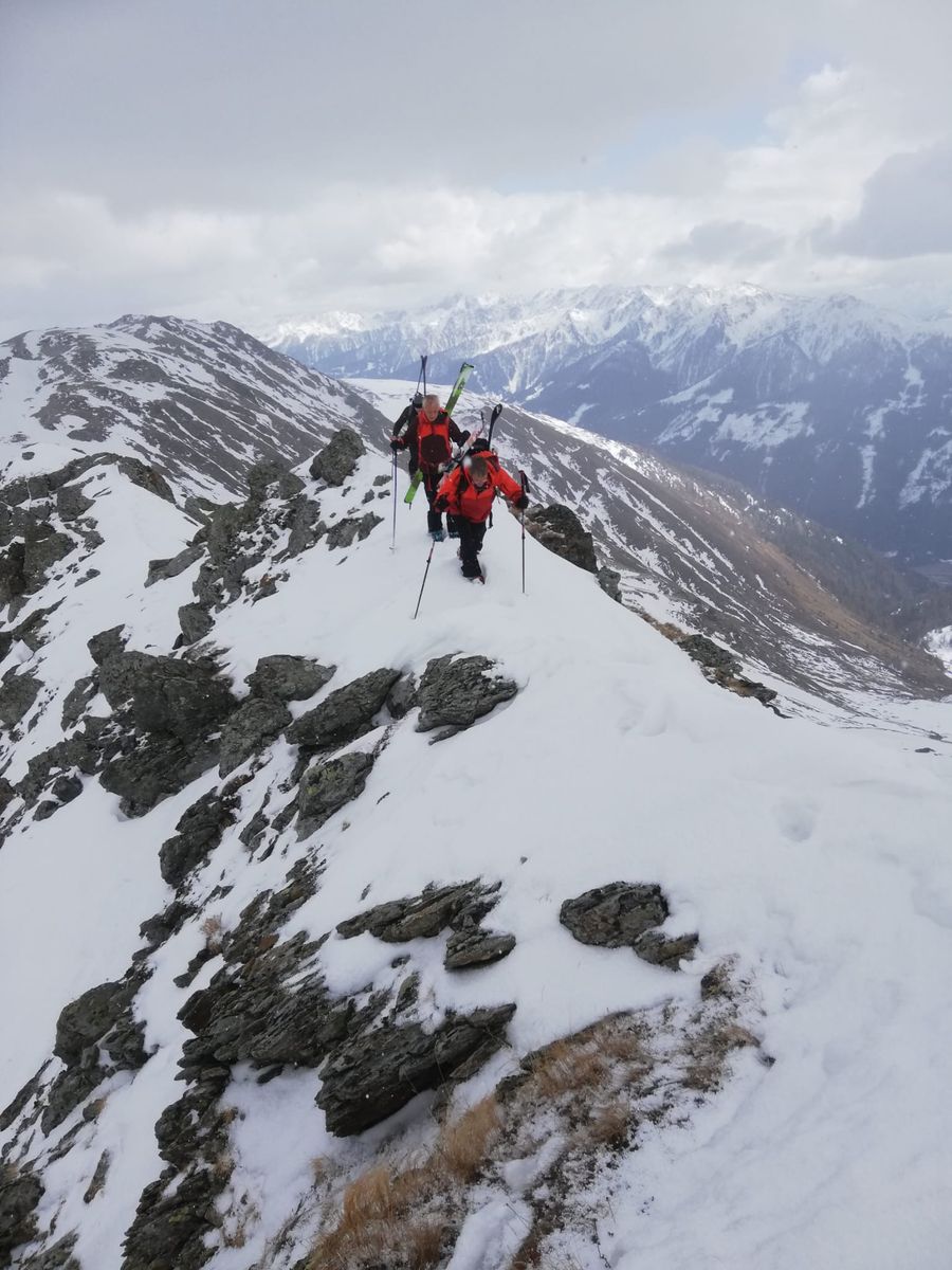 Vom P. 1500m (wenig Parkmöglichkeiten) auf der Forststraße ins Oberhofertal (mehrere kurze Tragestellen im Aufstieg). Unterhalb der Grafer Alm entlang des Sommerweg über den Bach, noch ein Stück taleinwärts und dann über die Hänge genau nach Süden zum Hochrast. Hier sehr unterschiedlicher Schnee von hart über Bruchharsch bis zu tiefem Griesel, teilweise auf engstem Raum, was das Spuren ziemlich anstrengend machte und wenig Abfahrtsfreuden versprach. Daher Gratwanderung (in der Tabaccokarte als Skiroute eingezeichnet) über den Gumriaul zum Marchkinkele. Das ist auch die meiste Zeit eine Wanderung, wird allerdings zum Schluss hin eine überraschend alpine, leichte Gratkletterei im Ier-Bereich mit Ski am Rucksack. Man kann den Gumriaul und die Kletterei auch umgehen, indem man auf der Militärstraße auf der italienischen Seite unterhalb der Gipfel quert.