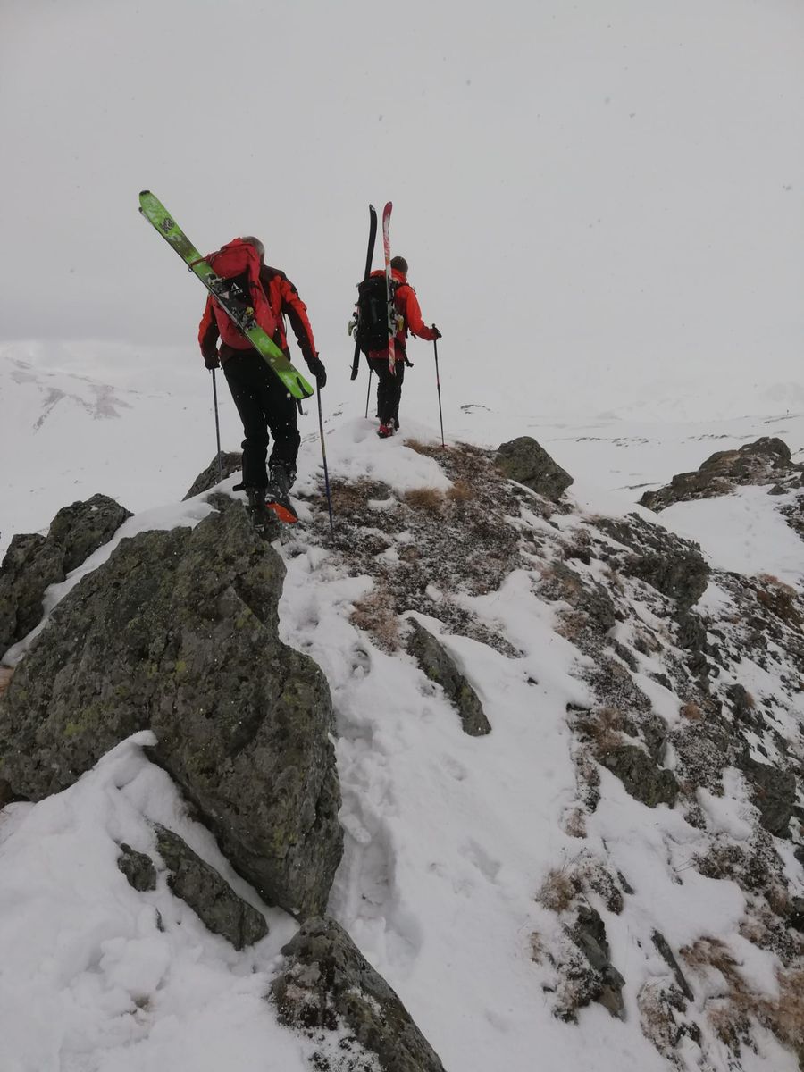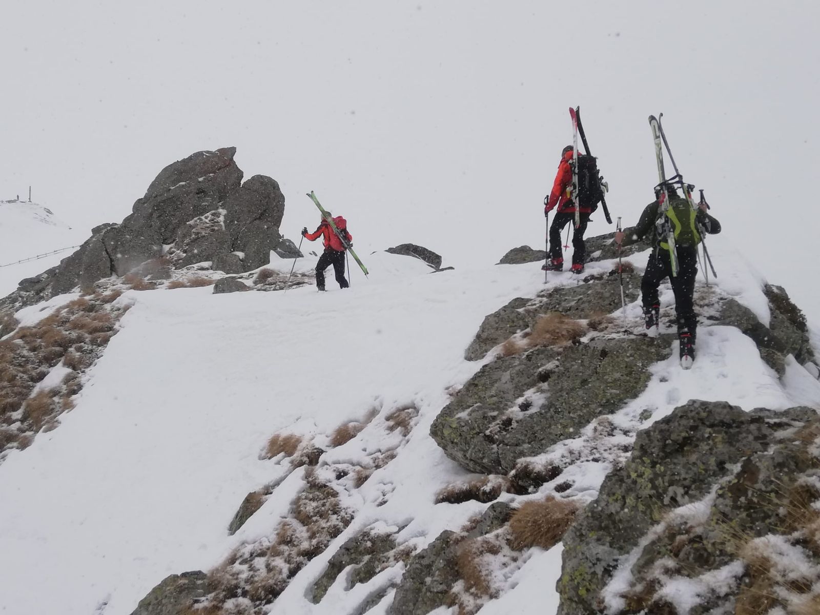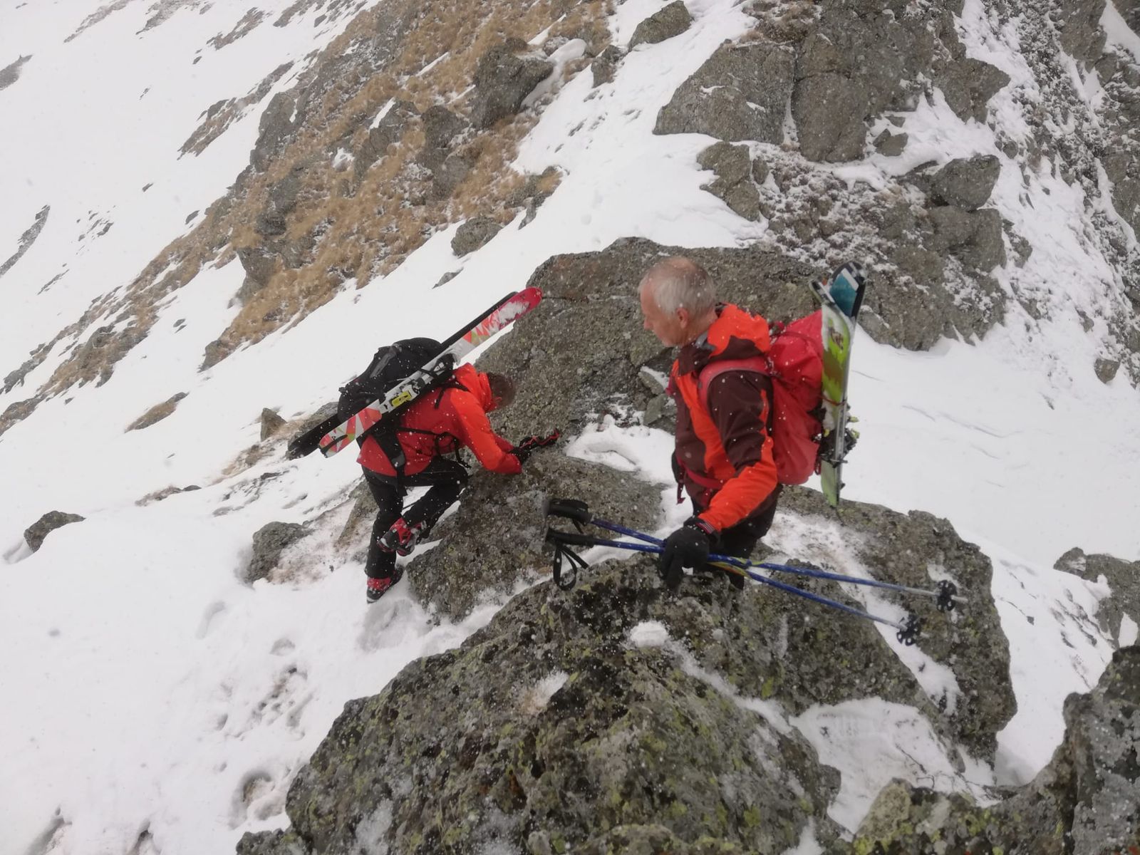 Vom P. 1500m (wenig Parkmöglichkeiten) auf der Forststraße ins Oberhofertal (mehrere kurze Tragestellen im Aufstieg). Unterhalb der Grafer Alm entlang des Sommerweg über den Bach, noch ein Stück taleinwärts und dann über die Hänge genau nach Süden zum Hochrast. Hier sehr unterschiedlicher Schnee von hart über Bruchharsch bis zu tiefem Griesel, teilweise auf engstem Raum, was das Spuren ziemlich anstrengend machte und wenig Abfahrtsfreuden versprach. Daher Gratwanderung (in der Tabaccokarte als Skiroute eingezeichnet) über den Gumriaul zum Marchkinkele. Das ist auch die meiste Zeit eine Wanderung, wird allerdings zum Schluss hin eine überraschend alpine, leichte Gratkletterei im Ier-Bereich mit Ski am Rucksack. Man kann den Gumriaul und die Kletterei auch umgehen, indem man auf der Militärstraße auf der italienischen Seite unterhalb der Gipfel quert.