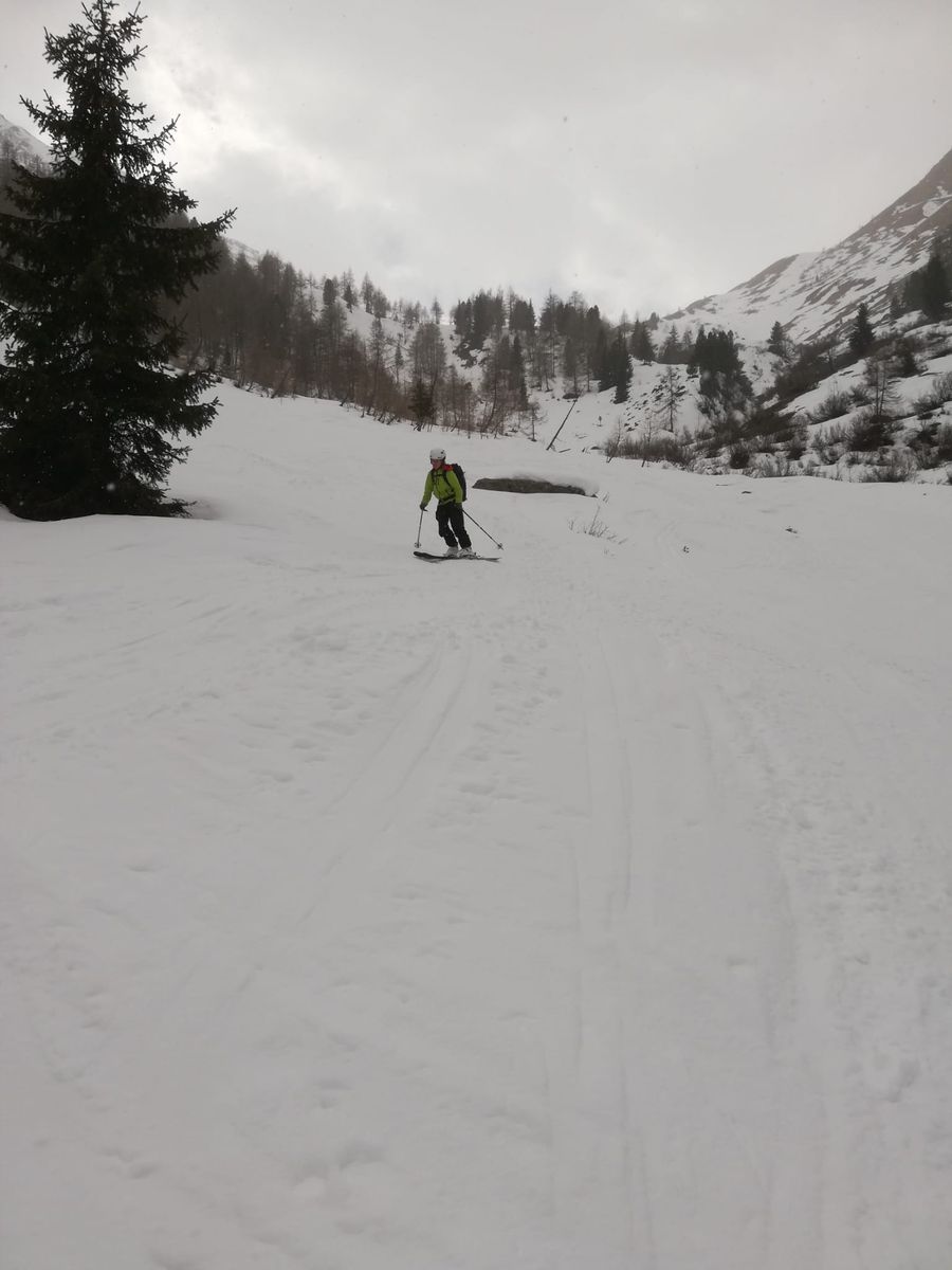 Abfahrt dann vom Marchkinkele durchs Oberhofertal, die oberen ca 500Hm schöner, weicher Schnee, unterhalb ca 1950m zunehmend tiefer und nasser Schnee.