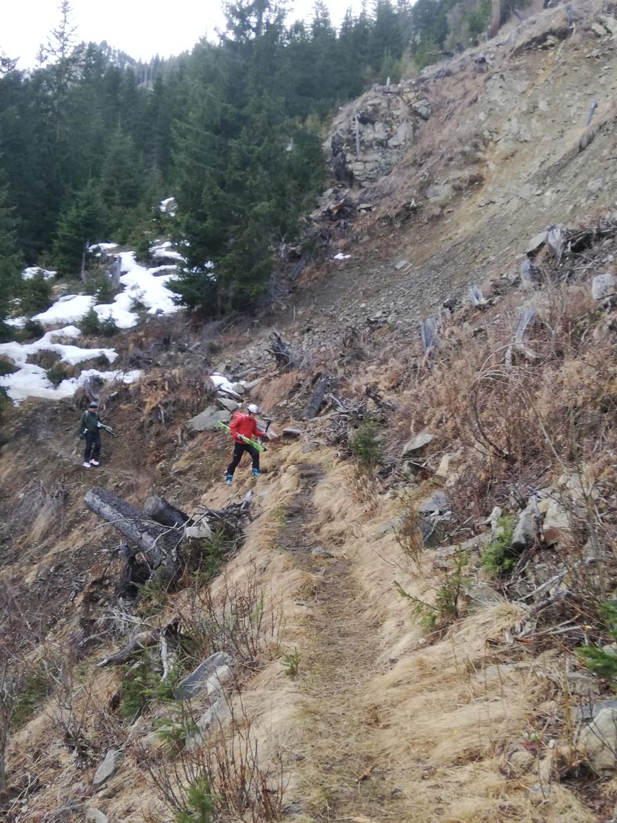 Wetter stark bewölkt, kaum Sonne, aber Gipfel frei, zeitweise leichte Graupelschauer, unterhalb ca 1900m Regenschauer. Abwärts längere Tragestrecke auf der Forststraße (20-30min).
