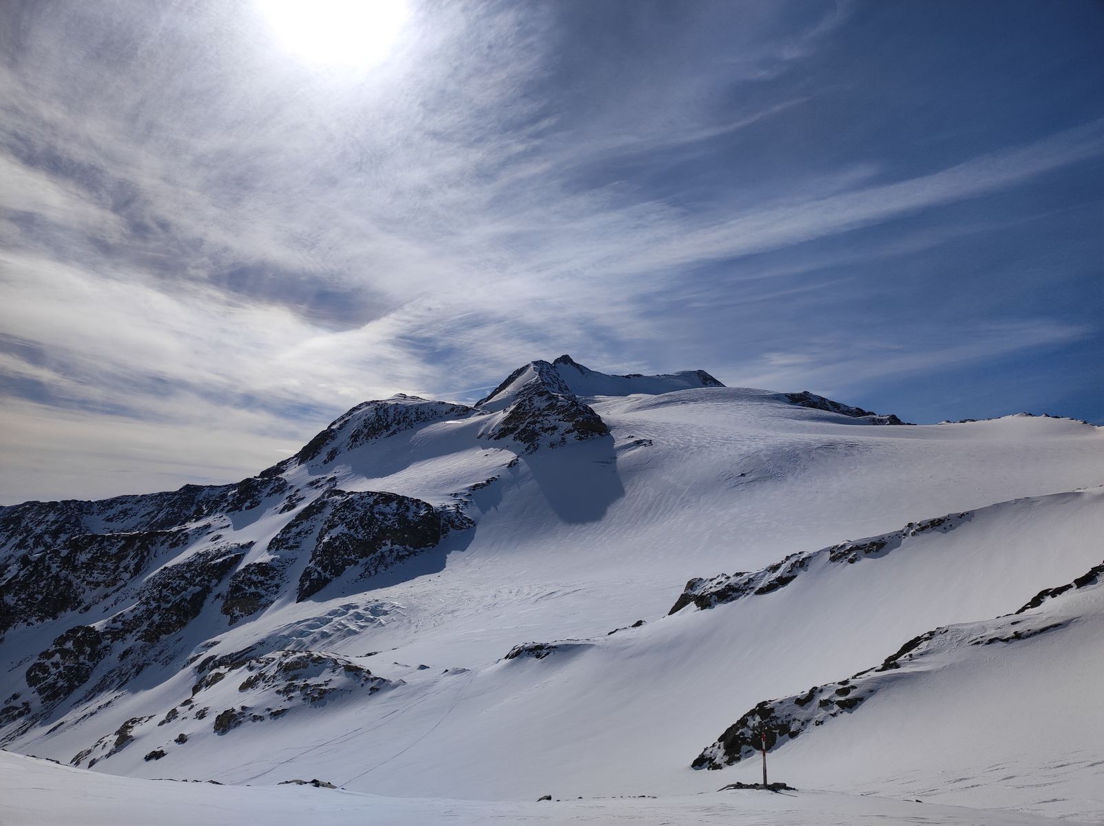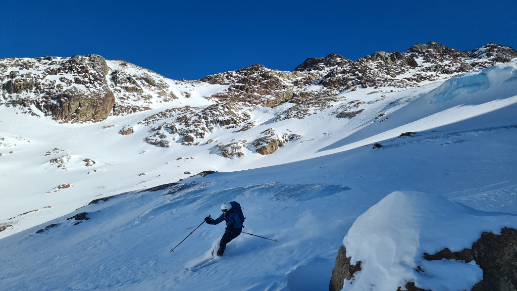 Vom hochgelegenen PP (2050 Meter) ging es zunächst zur Marteller Hütte. Es liegt wenig, aber auch für die Abfahrt noch ausreichend Schnee. Ursprünglich hatte ich geplant, auf die Marmotta zu gehen, dort südseitig ins Careser Tal abzufahren, von dort zur 3. Venziaspitze aufzusteigen und über den Schranferner abzufahren. Doch meinte der Hüttenwirt, dass die Verhältnisse an diesem Gletscher gefährlich seien und riet dringend ab. Ich hab das nicht ganz glauben wollen, weil wir den Gletscher erst im August in aperem Zustand begangen haben und es doch probieren wollen. Letztlich wurde unser Vorhaben aber durch den steilen, mir lawinentechnisch zu riskanten, da eingewehten Südhang der Marmotta vereitelt. Am Samstag hörte ich dann im Gespräch mit Bergsteigern auf der Zufallhütte, dass auch deren Wirt vor dem Schranferner gewarnt hatte, dann aber am Freitag die Info bekam, dass die Verhältnisse dort super sind. Es war wohl einfach so, dass jemand das Gerücht vom neuerdings gefährlichen Schranferner in die Welt gesetzt hat und dann bis Freitag niemand mal wirklich dort war...