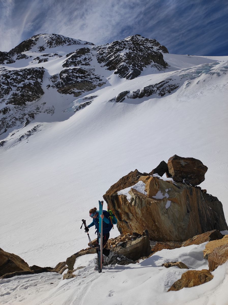 6: Kurze Tragstelle im Bereich eines Felssturzes. Hier erkennt man auch gut die Spaltenzone am Langenferner sowie die Umfahrungsmöglichkeit über die Schneezunge zwischen den Felsen.