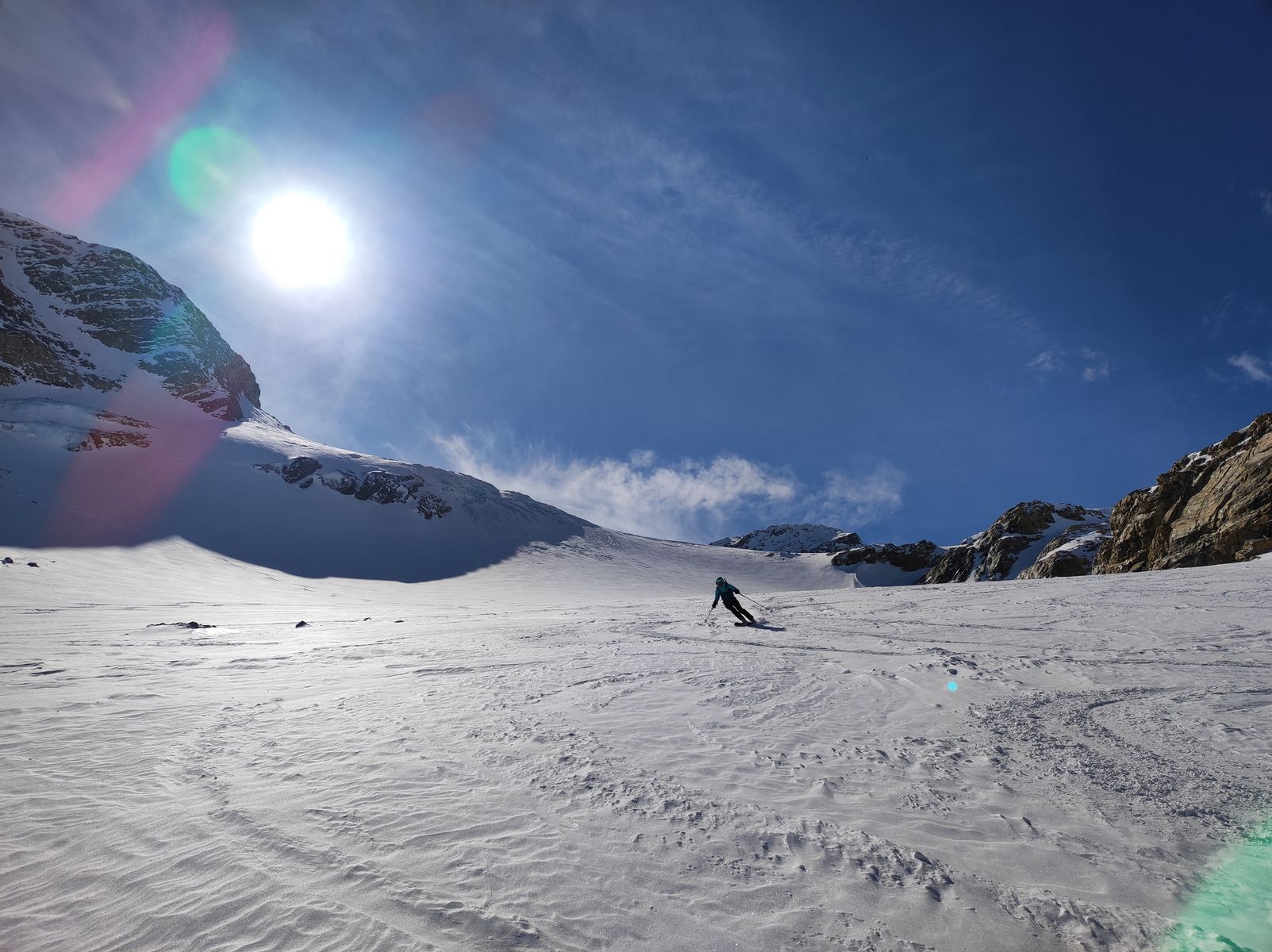 Auf jeden Fall sind wir von der Marmotta zunächst einmal über den Hohenferner auf der Anstiegsroute abgefahren (hart und windgepresst) und anschließend noch mal hoch. Bei der zweiten Abfahrt haben wir uns am Gletscher weit rechts gehalten, um ihn in seiner ganzen Länge bis zur Zunge zu befahren. Hier super Pulver! Ich hab mich dann bloß gefragt, warum außer uns keiner der vielen vielen Kollegen auf diese Idee gekommen ist. Bei etwa 2500 Metern haben wir wieder angefellt und sind auf der Trasse des Wanderwegs Nummer 27 zur Hütte zurück. Der Hohenferner ist spaltentechnisch übrigens wirklich äußerst harmlos.