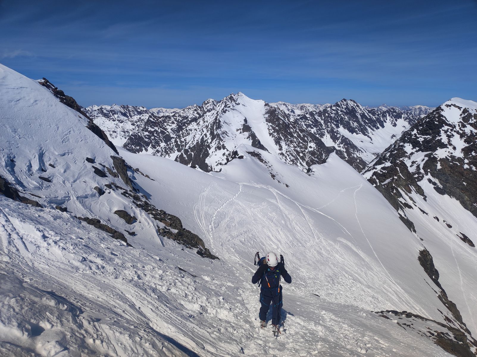 Der Anstieg erfolgte auf dem üblichen Weg. Auf der Loipe und im ersten Hang danach liegt gerade noch ausreichend Schnee - die angekündigten Schneefälle am Wochenende kommen sicher keinen Tag zu früh. Das Skidepot wird momentan am sinnvollsten schon 50 Meter unter dem Gipfel angelegt, da es oben zu wenig Schnee für die Abfahrt hat. Wir sind dann mit Steigeisen weiter, was aber nicht nötig gewesen wäre.