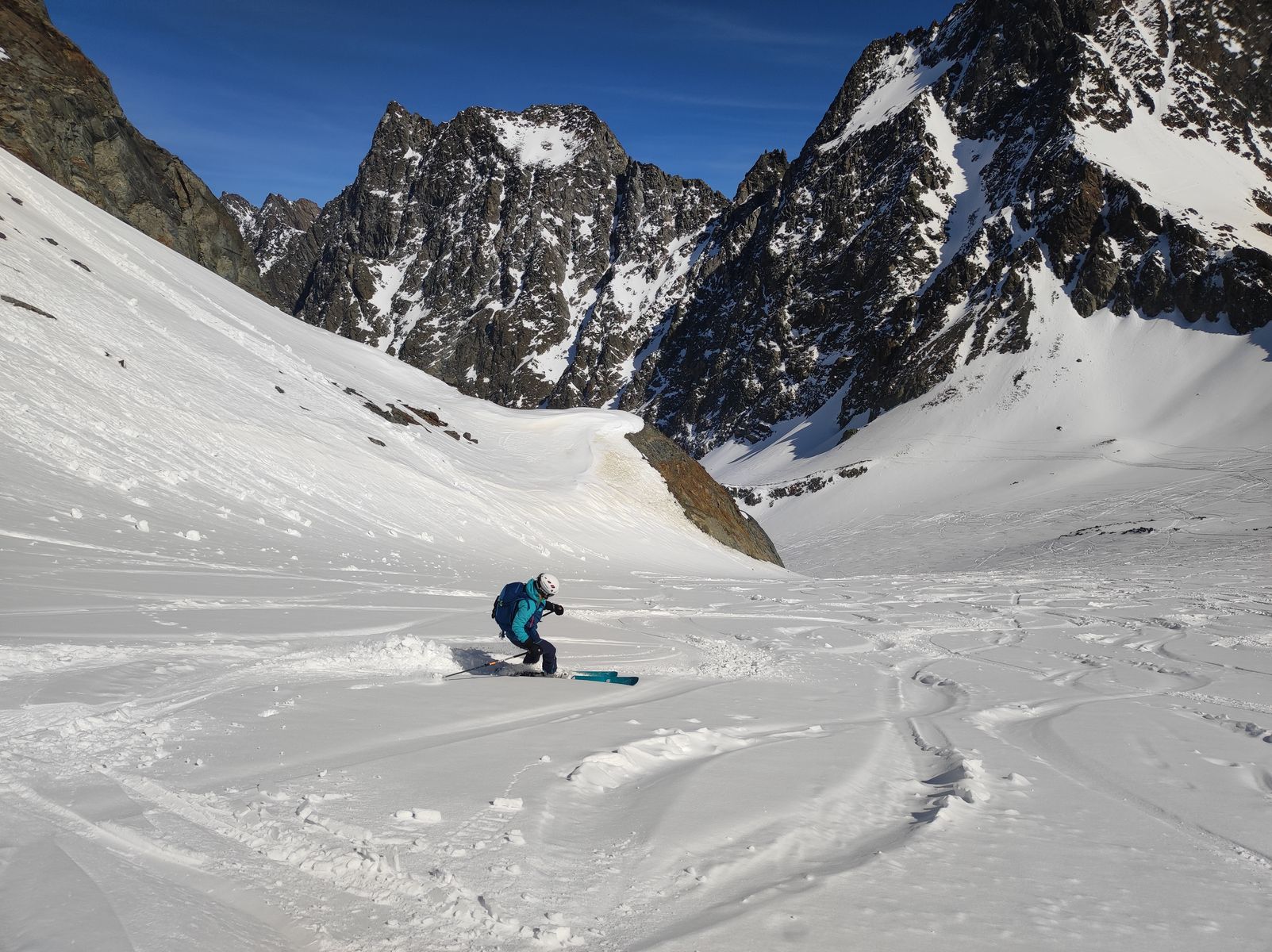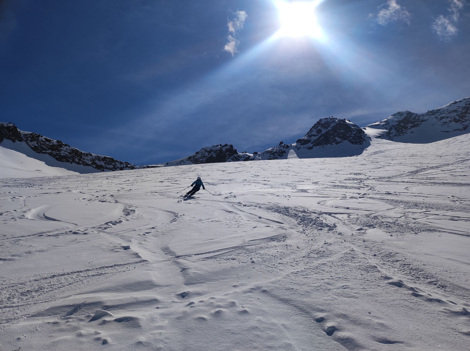 Die Abfahrt war sehr fein: auf dem Gletscher Pulver und danach meist schöner Firn - insgesamt aber schon sehr stark verspurt.