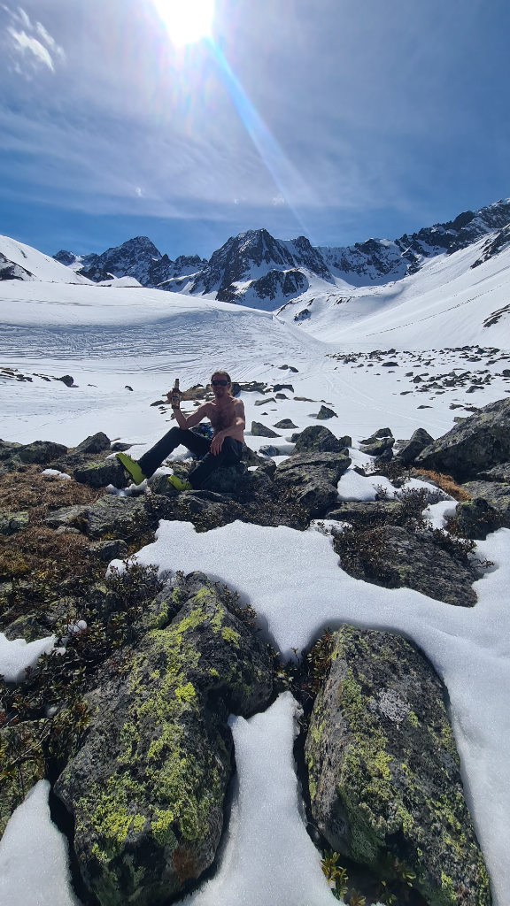 7: Kein Poserbild - es war wirklich so warm. Gut, dass ich das Bier schon während des Aufstiegs im Schnee kalt gestellt hatte!