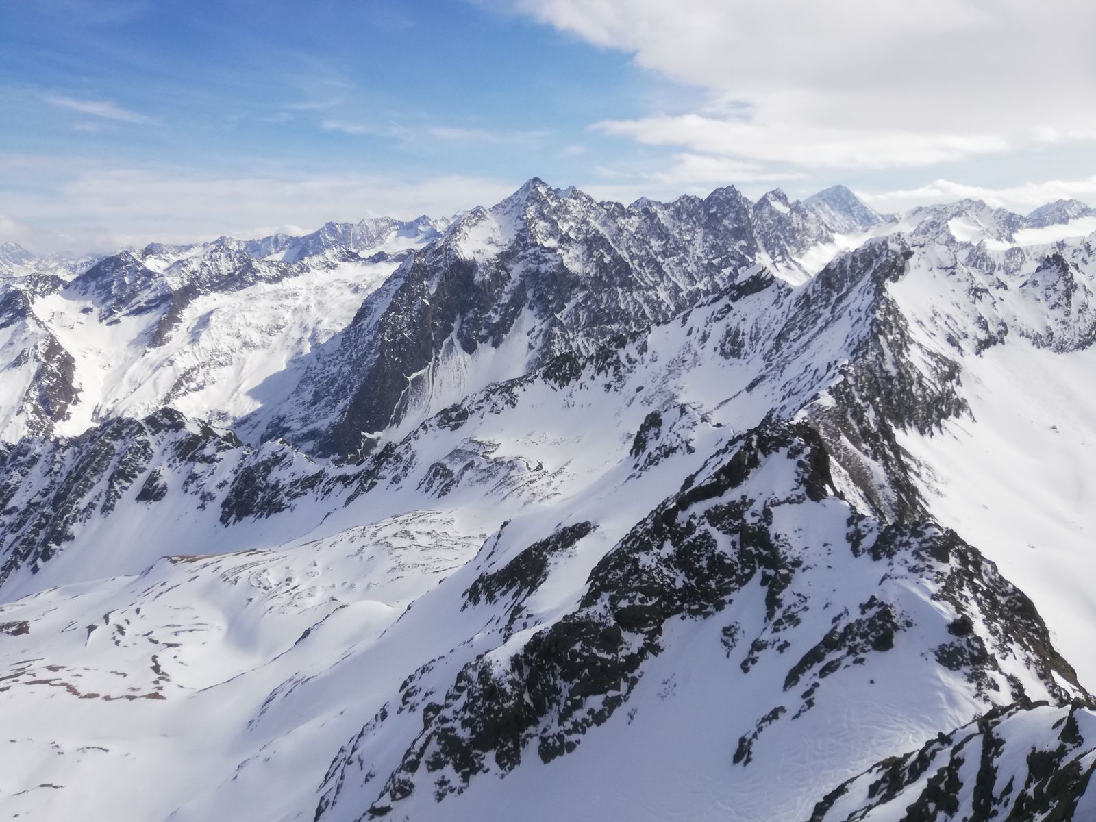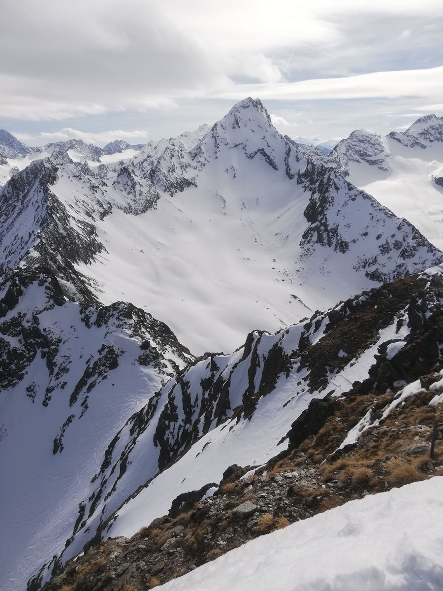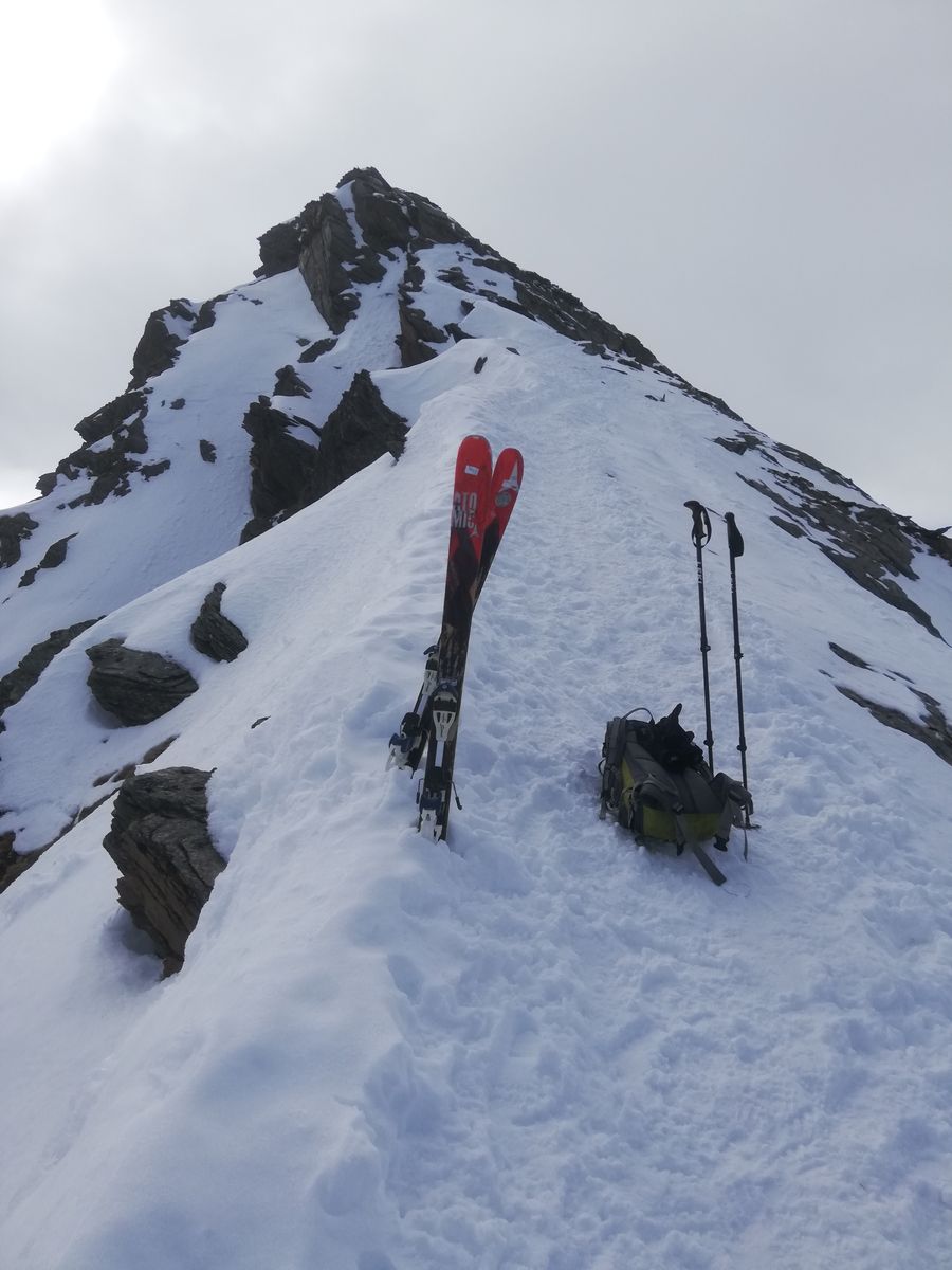 Schnee ab Parkplatz. Die Hänge hoch zum Kamplloch, weiter bis ca. 2700m, dann nach rechts unterhalb des Grates, auf den Grat, vor einem felsigen Teil (ca 2860m) nochmal nach rechts in die Flanke und kurz danach wieder nach links zurück an den Grat und Skidepot (ca 2900m). Ab hier dick ausgetretene Spur, zunächst auf Schnee, später durch Fels, die Kette an der "Schlüsselstelle" kurz unter dem Gipfel liegt frei - und ist nützlich.