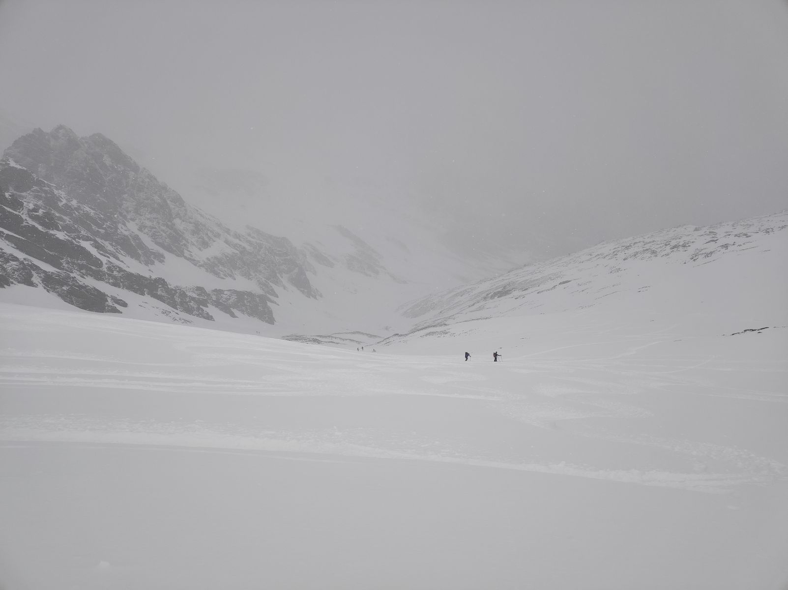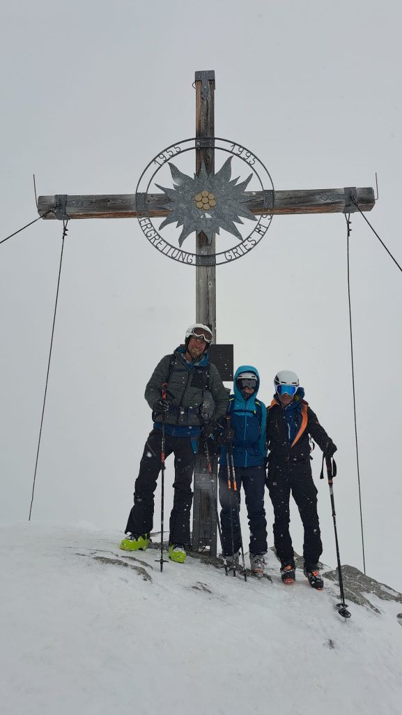 Wetter und Sicht nicht berauschend aber brauchbar. Lawinengefahr gering wegen fehlender Schneemächtigkeit; nur Lockerschneerutsche aus zuvor aperen Steilhängen abseits der Route.