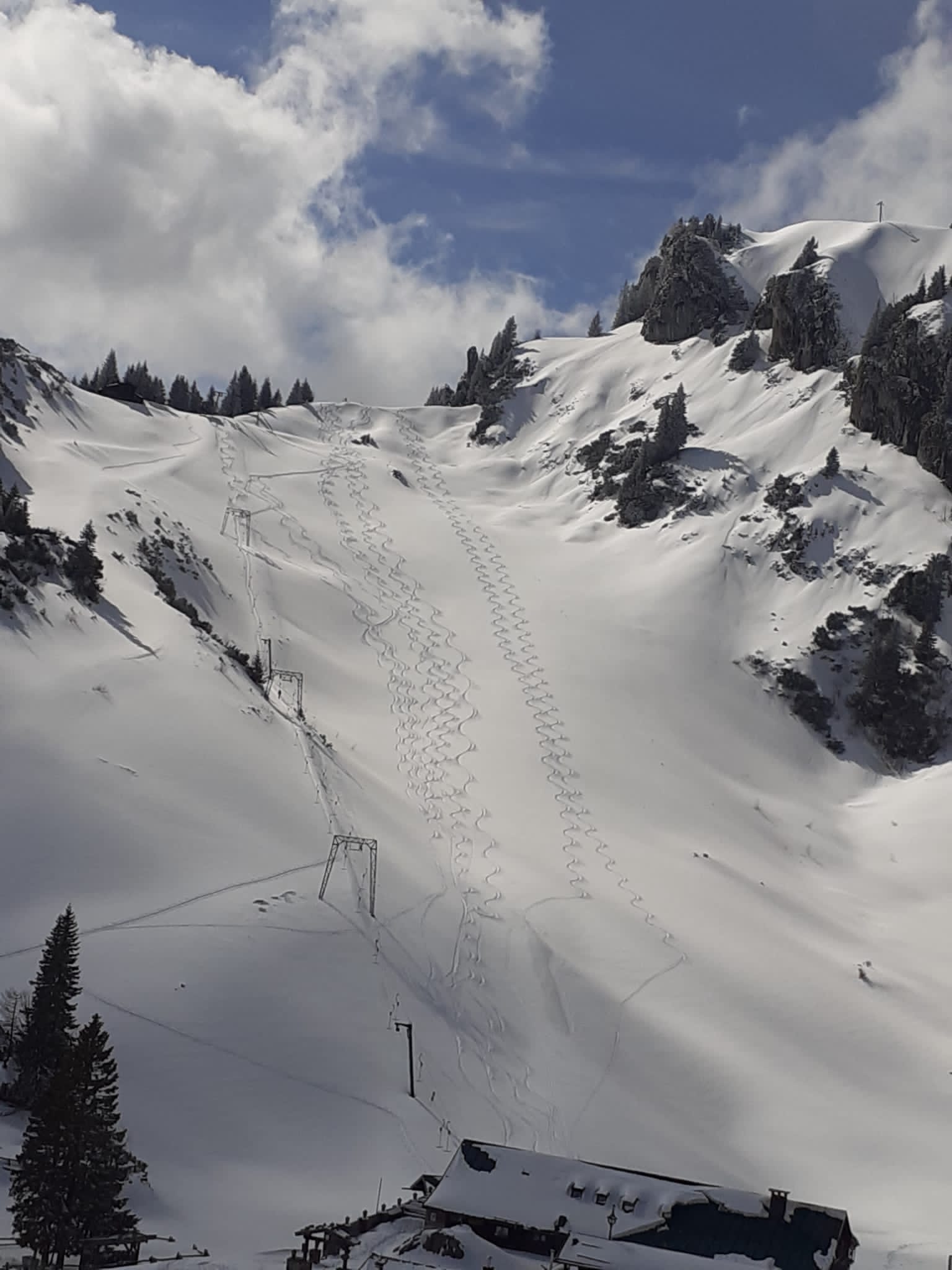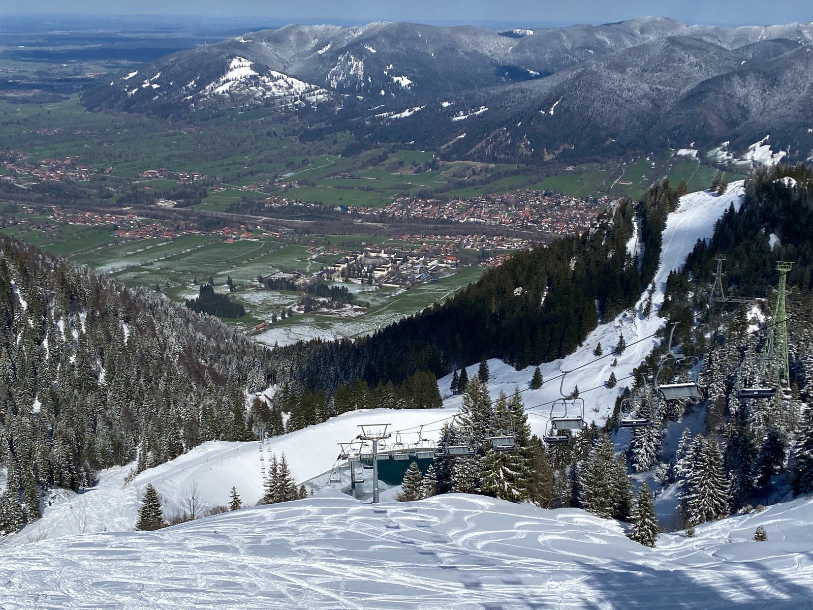 Owei sagt der Bayer, als der Hesse - immer wäre Highgerman. Also, Brauneck geht bekanntlich immer - ich war diesmal ausnahmsweise nachmittags oben. Der Neuschnee vom Vortag war schon durchweg zerfahren, aber im Bereich Garlang fanden sich auch noch ein paar unberührte Pulverflecken. Und wer weiter hinter, beispielsweise zum Idealhang, spurte: Da war fast keiner mehr. Oben bis zu 35 cm Neuschnee von Montag, unten reichte es gerade so, um über die Wiesen bis 20 Meter vors Auto zu rutschen. Mit dem Wärmeeinbruch (Nullgradgrenze morgen bei 2300 m) wird unten rasch das Grüne übers Weiße dominieren.