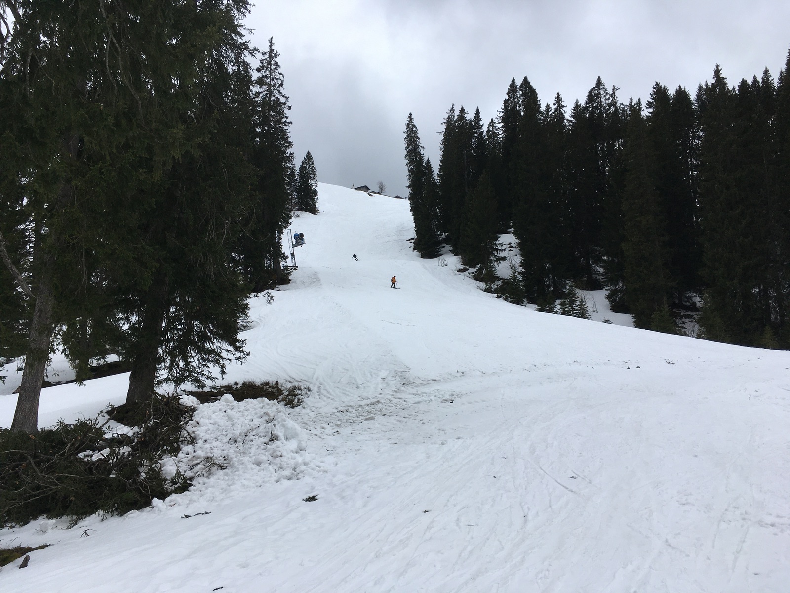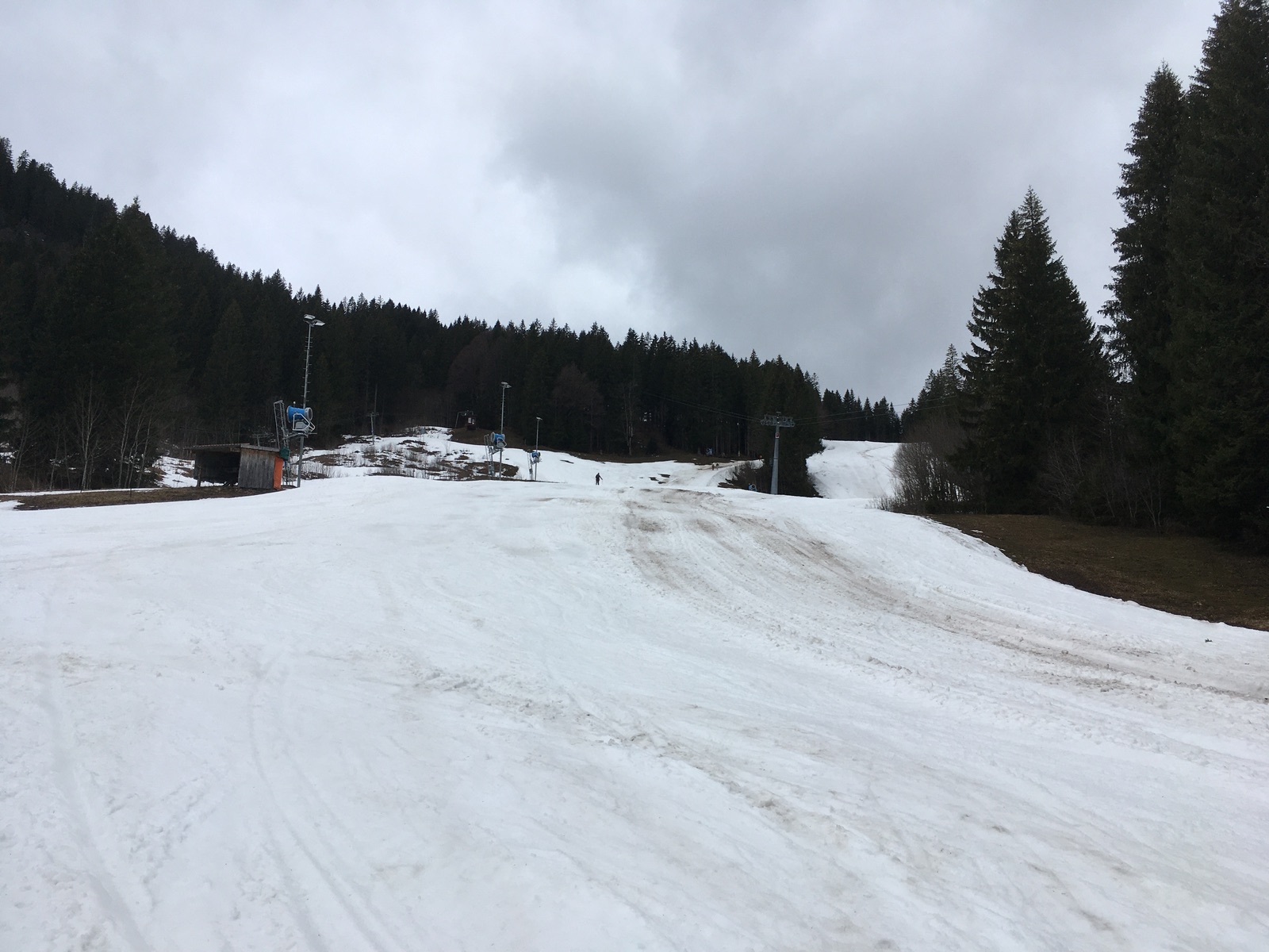 Abfahrt Kurvenlift: Im mittleren Teil und ganz unten schon recht ausgeapert. Ging gerade noch so mit Skiern, ist aber im Prinzip vorbei. Bald wird man wiederholt abschnallen müssen.