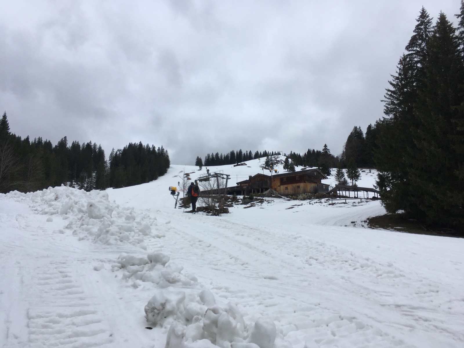 Von der Talstation der Stümpfling-Sesselbahn liegt auf der Piste noch ordentlich Schnee. Die Pistenraupe hatte ziemlich geschoben, aber durch den eher weichen Schnee geht es dennoch gut. Kein Steinkontakt bis zum Roßkopf, natürlich viele Leute und relativ warm außer am Gipfel durch kalten Wind. Das dürfte noch einige Tage gehen, vermutlich auch an Ostern noch.