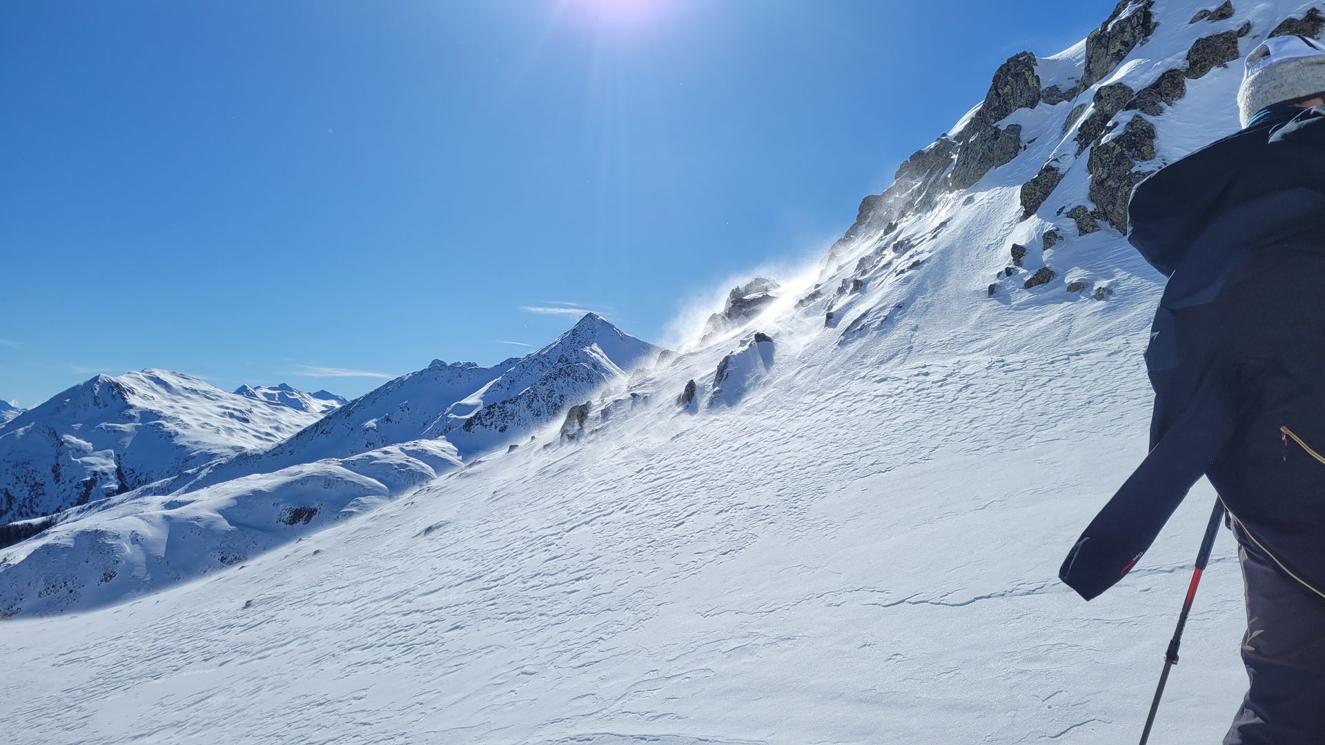 Von Morgen weg kalter Nord-Ost-Wind über Verfrachtungsstärke. Am Gipfel haben wir uns deshalb einen Brotzeitplatz gegraben: Unter dem bisschen Neuschnee und der Harschschicht nur Bröselschnee ohne Halt und Struktur gefunden.