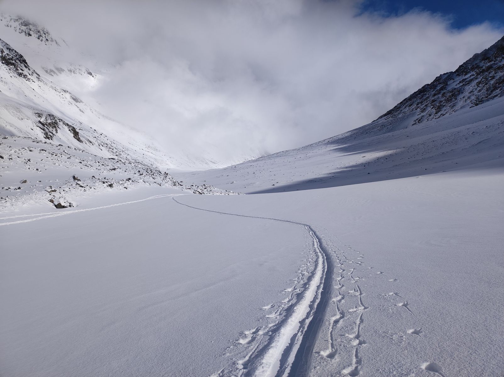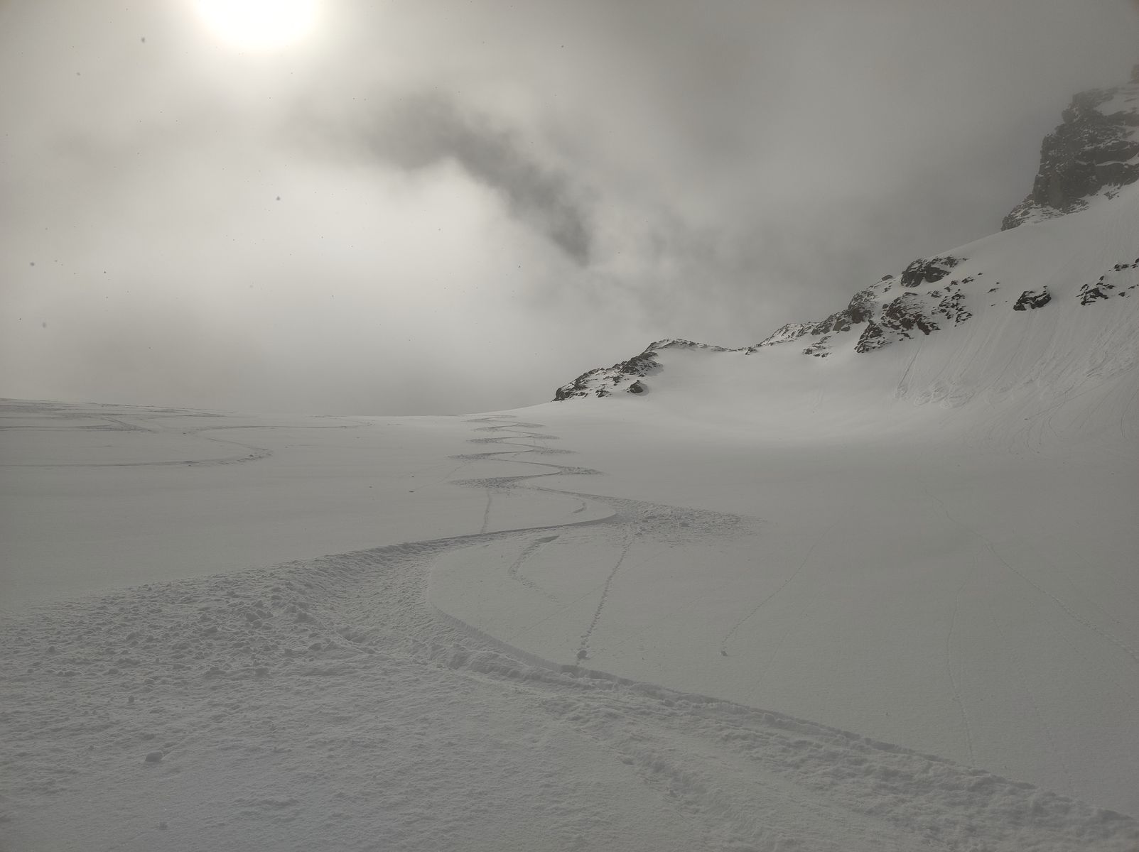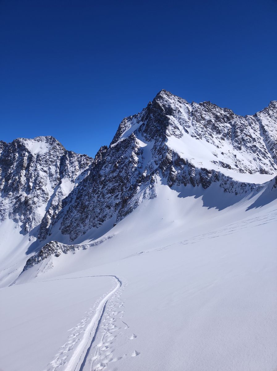 Am Abzweig zum Seeblaskogel hab ich mich gegen diesen entschieden. Die Kombination allein unterwegs, noch keine Spuren und die generelle Neigung der Route zu Windanfälligkeit sowie Lawinen veranlassten mich zu diesem Entschluss, wobei noch hinzukam, dass leichter Nebel und die damit einhergehende diffuse Strahlung das Risiko noch zusätzlich erhöhten. Bereut hab ich dies gar nicht, denn am Längentaler herrschten Premium-Verhältnisse! Oberhalb von 2500 Metern kam ich aus dem Nebel und stieg zum Gipfel (Skidepot dieses Mal erst kurz unterhalb). Die Abfahrt in absolutem Edelpulver über den Gletscher war so schön, dass ich bei etwa 2700 Metern wieder auffellte und nochmal hoch bin. Zwischenzeitlich stieg der Nebel zwar in die Gipfelregionen, aber trotzdem war die Abfahrt von oben bis etwa 2000 Meter herunter ein einziges Schweben. Auch ins Tal ging's gut, wobei man kurz vor dem Erreichen der Loipe (wird anscheinend nicht mehr präpariert) einmal besser abschnallt, dem Ski zuliebe.