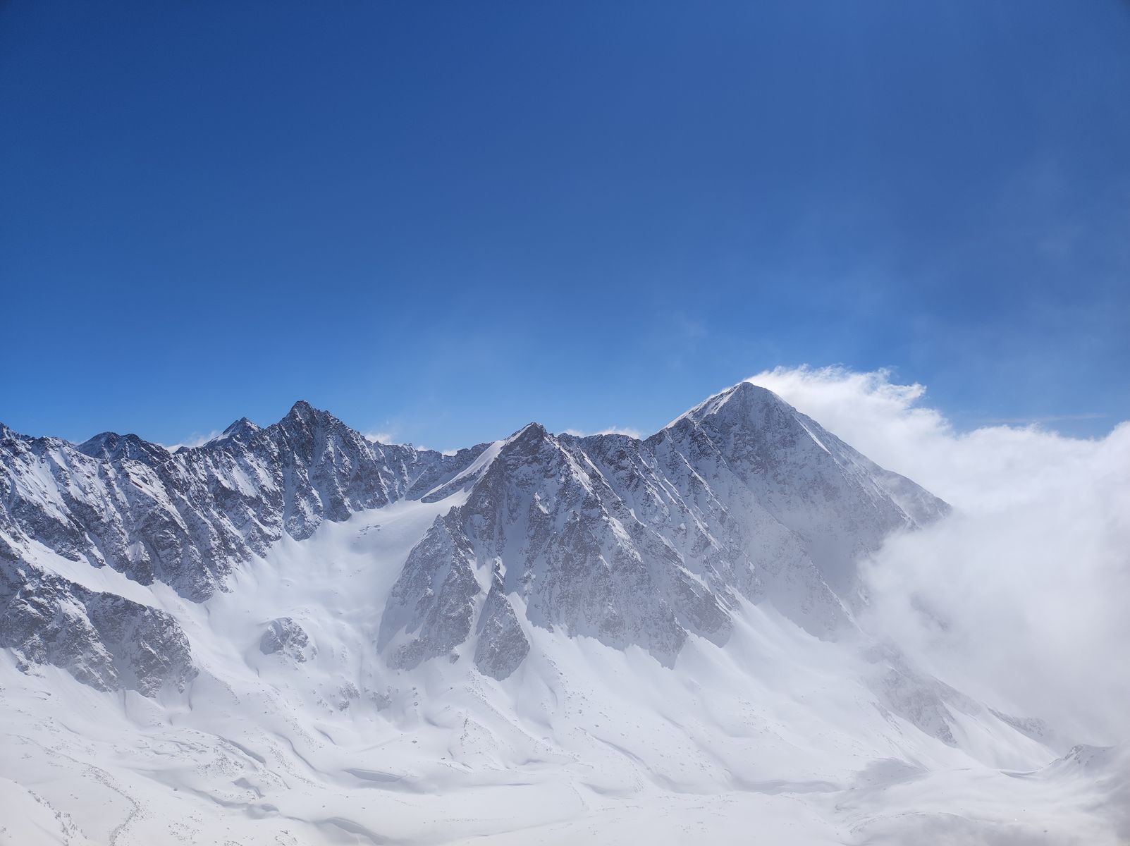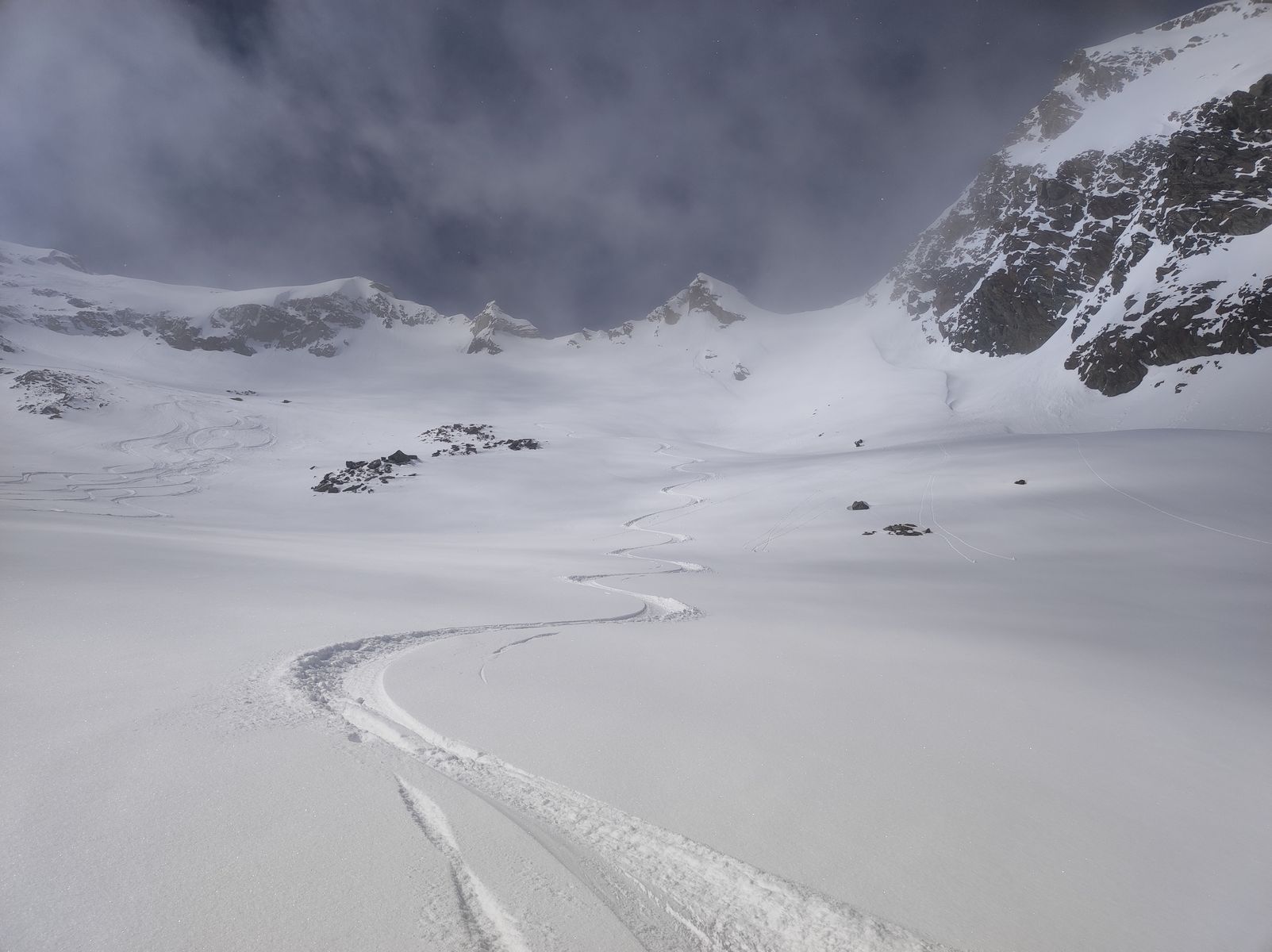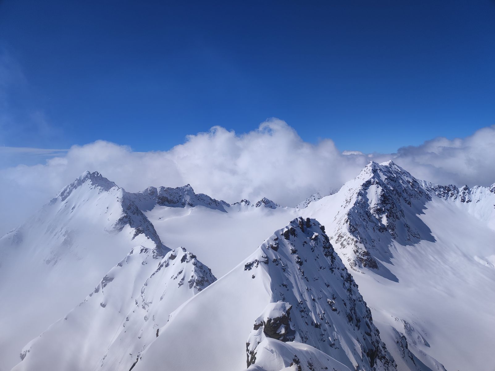 Am Abzweig zum Seeblaskogel hab ich mich gegen diesen entschieden. Die Kombination allein unterwegs, noch keine Spuren und die generelle Neigung der Route zu Windanfälligkeit sowie Lawinen veranlassten mich zu diesem Entschluss, wobei noch hinzukam, dass leichter Nebel und die damit einhergehende diffuse Strahlung das Risiko noch zusätzlich erhöhten. Bereut hab ich dies gar nicht, denn am Längentaler herrschten Premium-Verhältnisse! Oberhalb von 2500 Metern kam ich aus dem Nebel und stieg zum Gipfel (Skidepot dieses Mal erst kurz unterhalb). Die Abfahrt in absolutem Edelpulver über den Gletscher war so schön, dass ich bei etwa 2700 Metern wieder auffellte und nochmal hoch bin. Zwischenzeitlich stieg der Nebel zwar in die Gipfelregionen, aber trotzdem war die Abfahrt von oben bis etwa 2000 Meter herunter ein einziges Schweben. Auch ins Tal ging's gut, wobei man kurz vor dem Erreichen der Loipe (wird anscheinend nicht mehr präpariert) einmal besser abschnallt, dem Ski zuliebe.