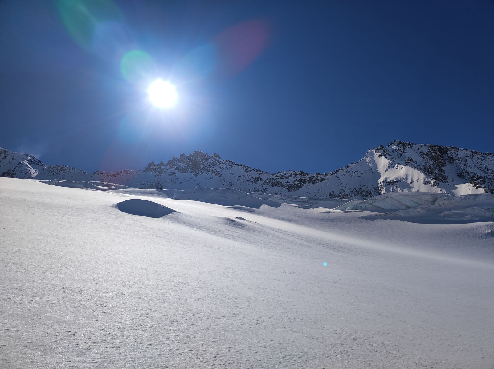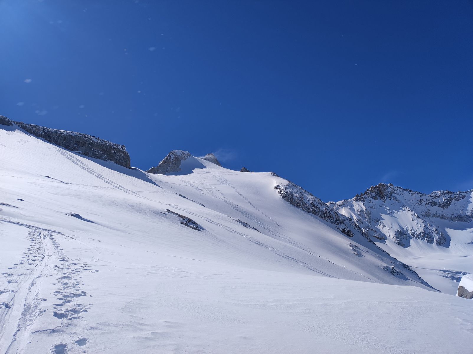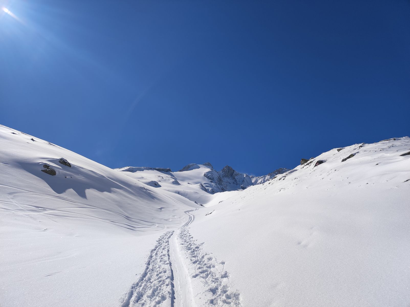 Hinweis zur Ausrüstung: Harscheisen waren heute trotz des hartgepressten letzten Hangs vor dem Skidepot nicht nötig. Sofern man sich mit dem Skidepot begnügt, ist es in meinen Augen grundsätzlich nicht nötig Seil, Steigeisen oder Pickel mitzunehmen. Sollte man bei der Tour die Gletscherausrüstung brauchen, dann sind die Verhältnisse so schlecht, dass sie sich eh nicht lohnt.