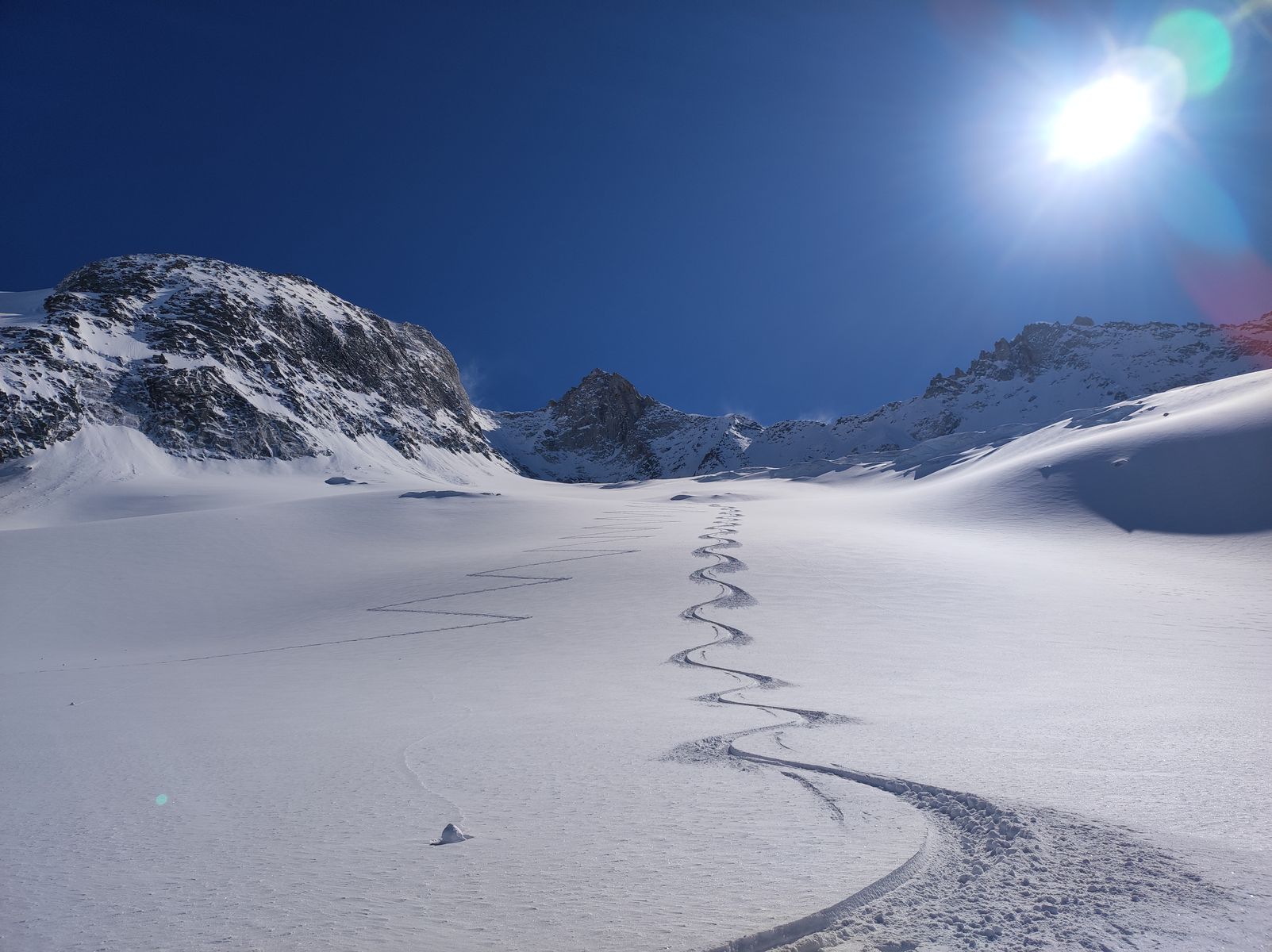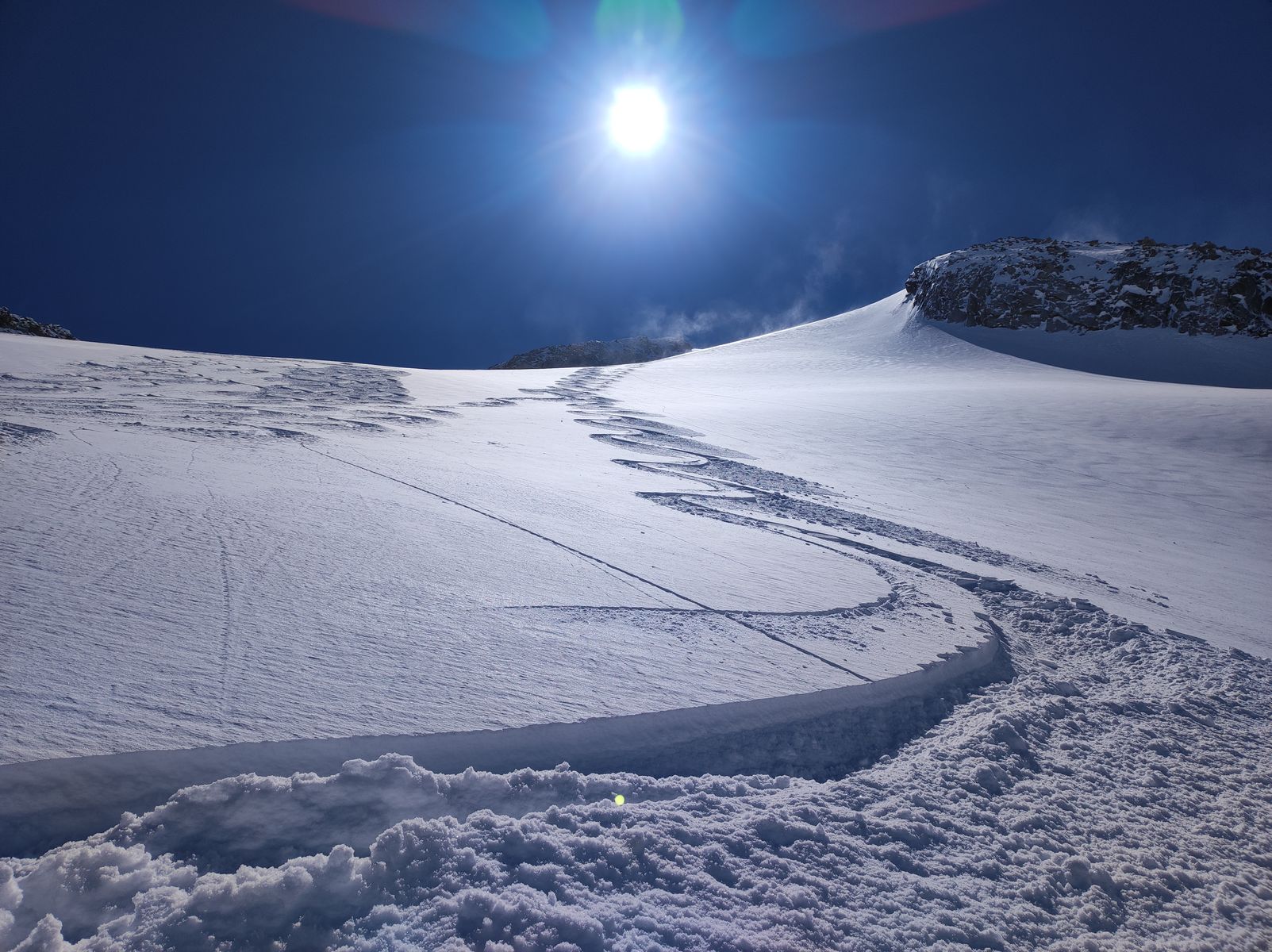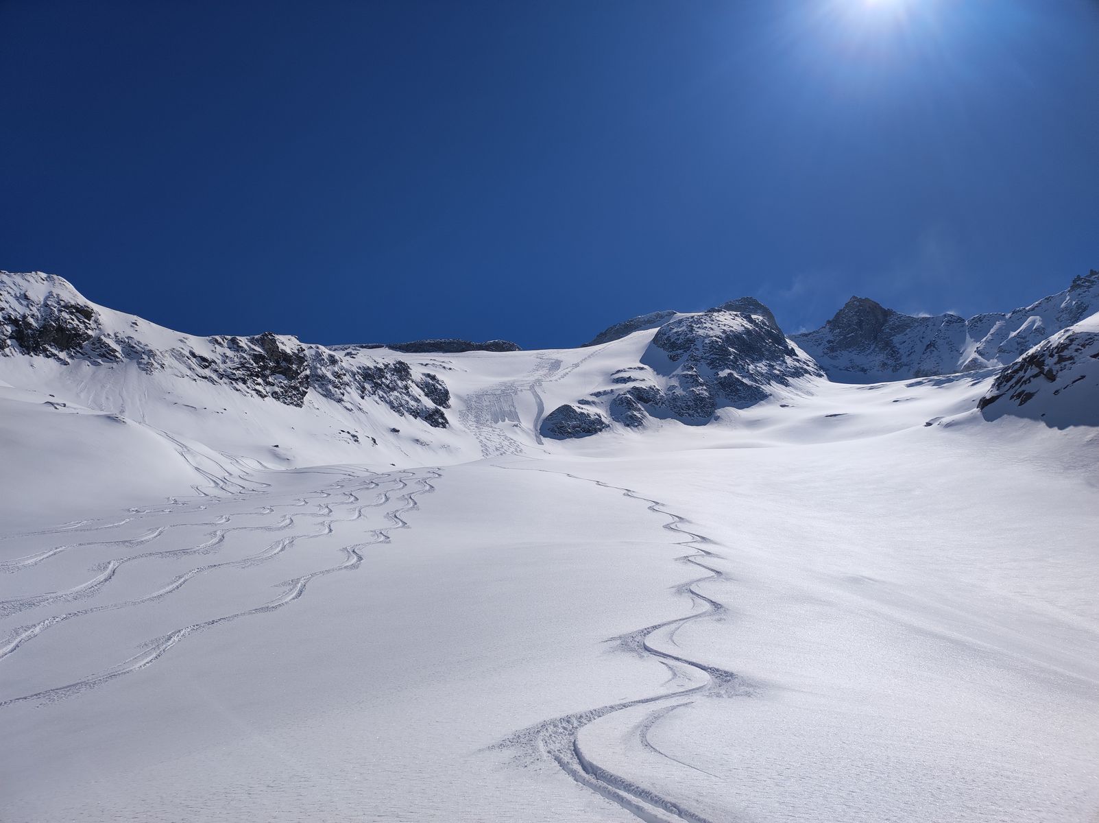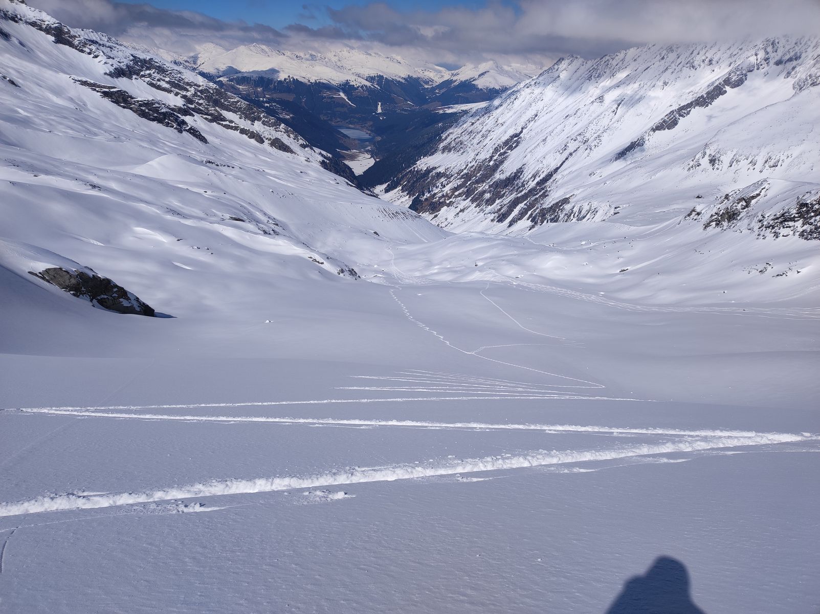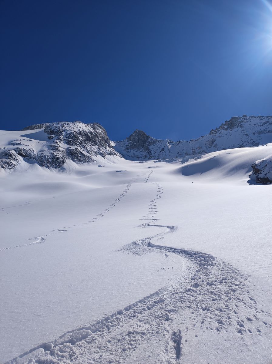 Als ich gestern den tollen Schnee am Längentaler sah, dachte ich mir sofort: Morgen Gabler! Der Schnee und das geniale Gelände dort - kann ja nur bombig werden. Meine hohen Erwartungen wurden dann tatsächlich sogar noch übertroffen. Im Steilhang auf dem Gletscher etwa 50-70 cm Edelpulver (man könnte auch Champagner-Pulver sagen). Ich habe dann bei etwa 2400 Metern nochmal aufgefellt und bin einfach zur Gaudi etwa 500 Höhenmeter auf dem Wildgerloskees in Richtung Reichenspitze aufgestiegen, um eine weitere Abfahrt genießen zu dürfen. Die erste Hälfte bin ich einer Spur gefolgt (Danke an Monika), bevor ich selber noch durch unberührten Schnee weiter bin.
