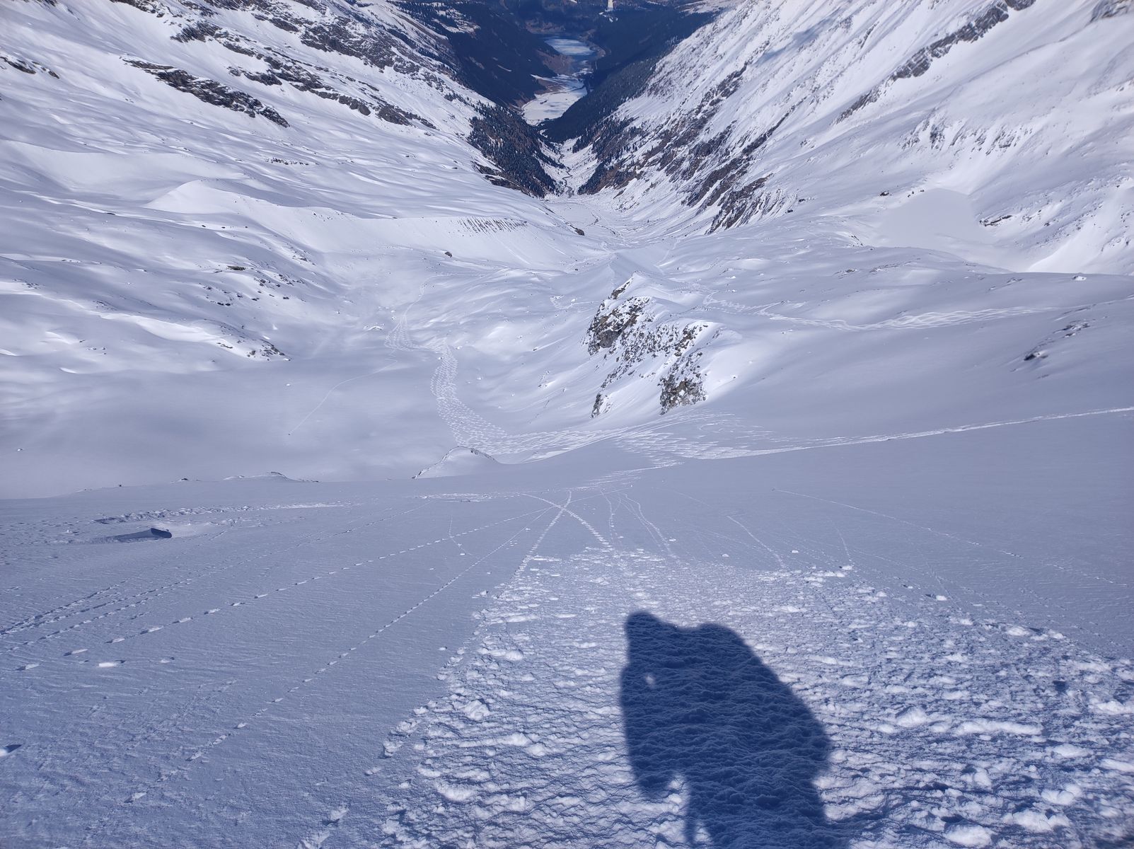 Die Talabfahrt war auch am Nachmittag noch bis zur Materialseilbahn pulvrig, dennoch könnte es morgen vielleicht an der einen oder anderen Stelle einen Deckel haben. Kleine apere Stellen auf der Forststraße können noch gut ohne Abschnallen gemeistert werden.